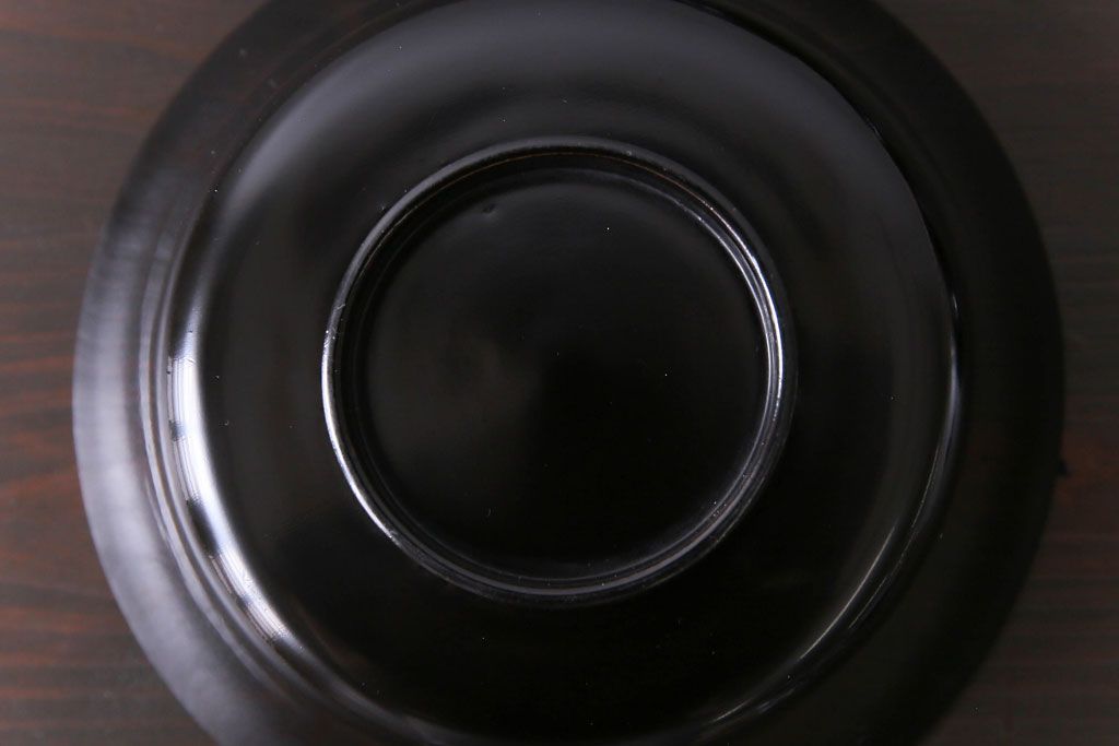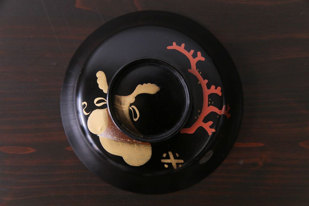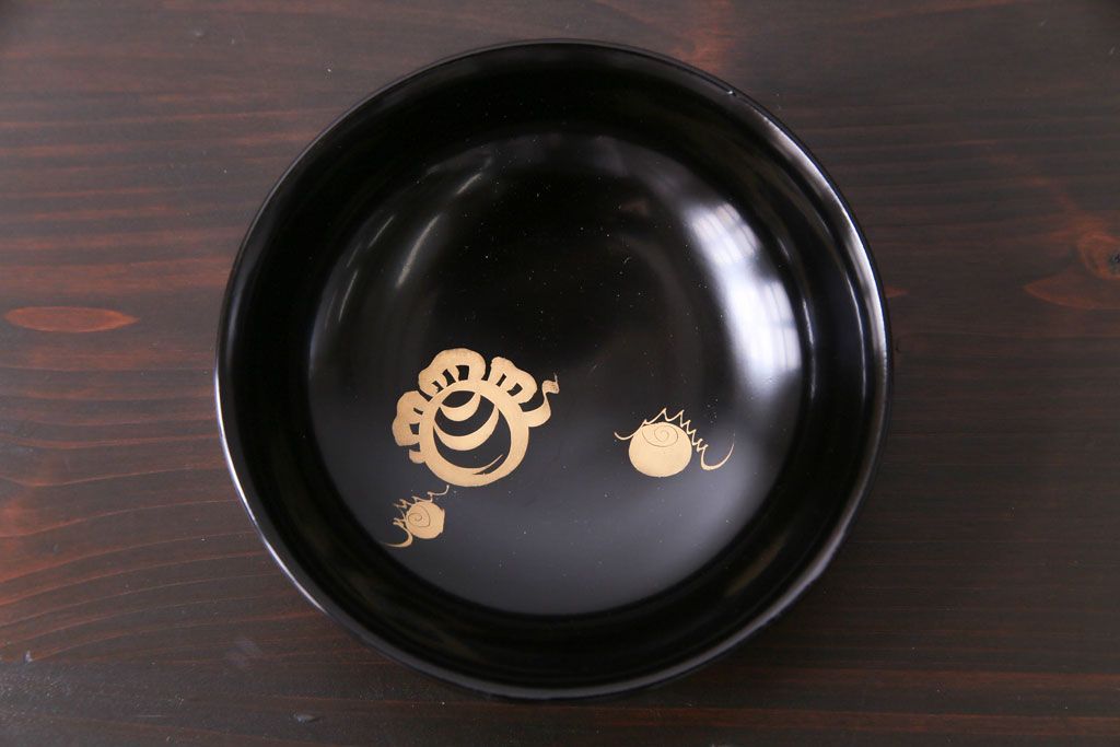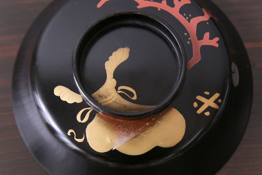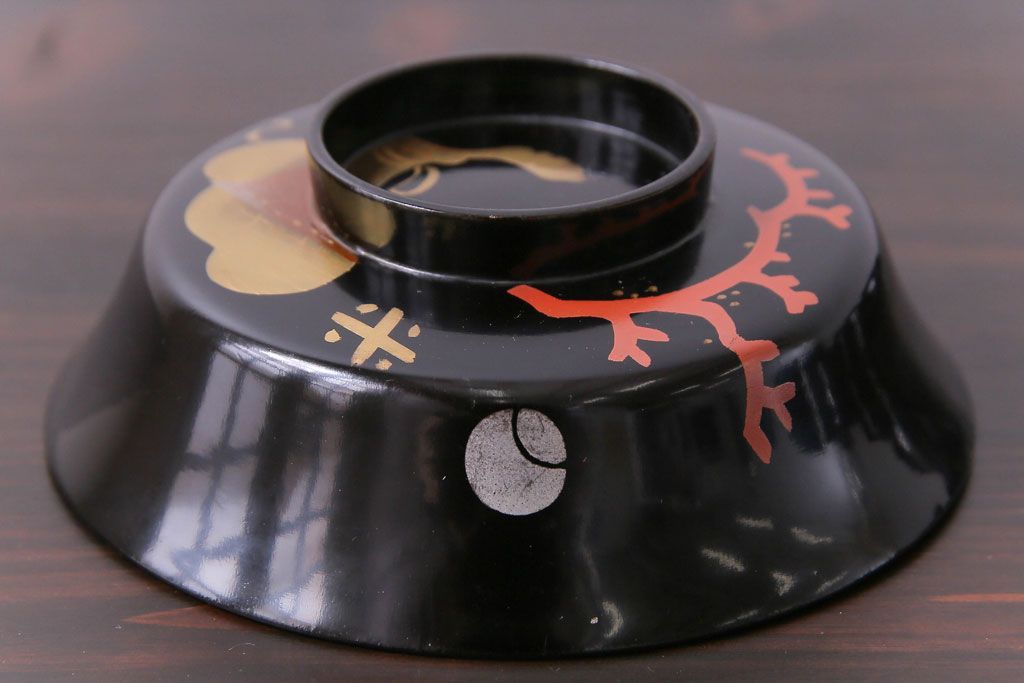 ラフジュ工房> 骨董・美術品> 骨董-漆器 > 和製アンティーク 黒漆器 赤珊瑚が描かれた木製碗5客セット(漆器)