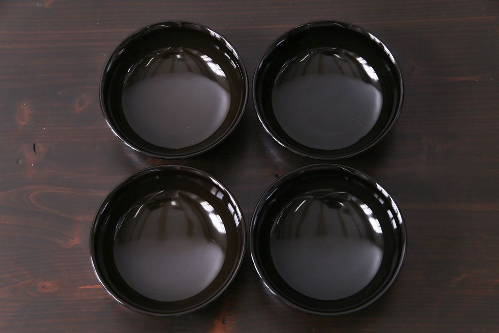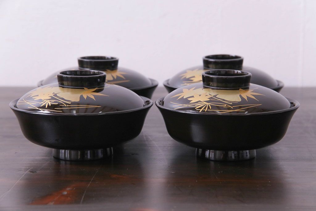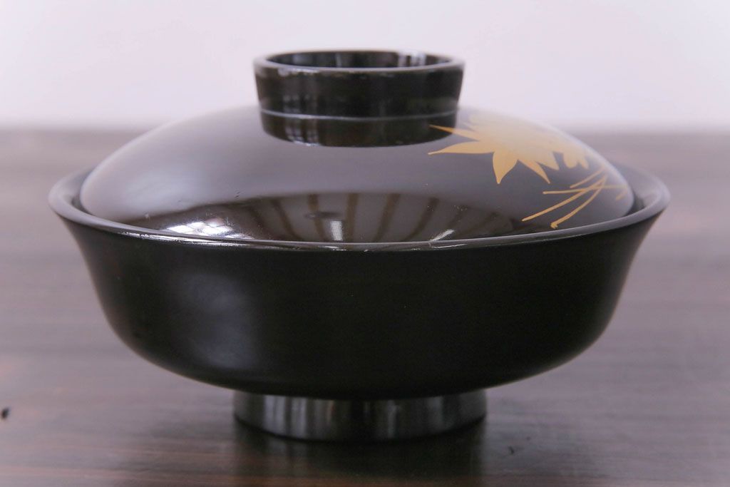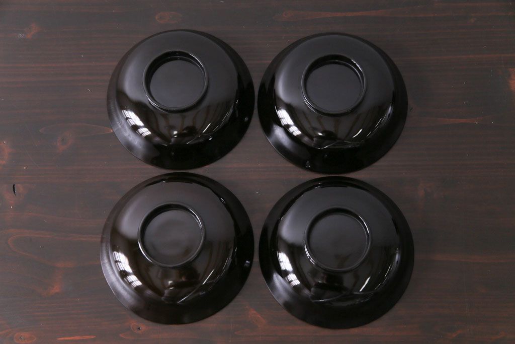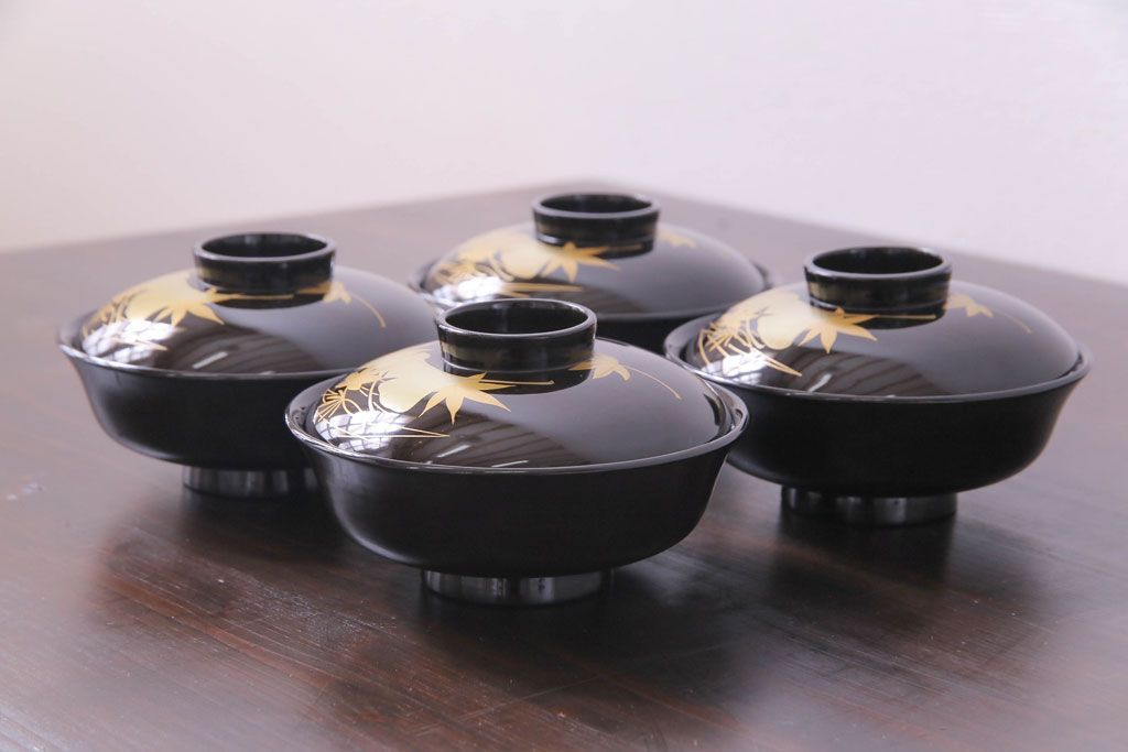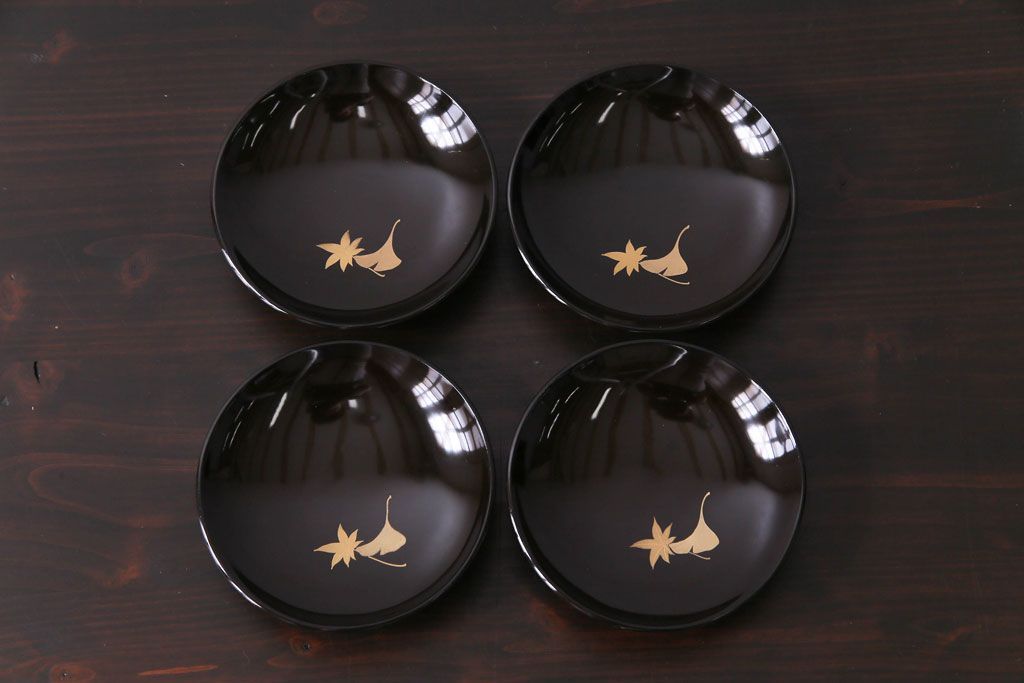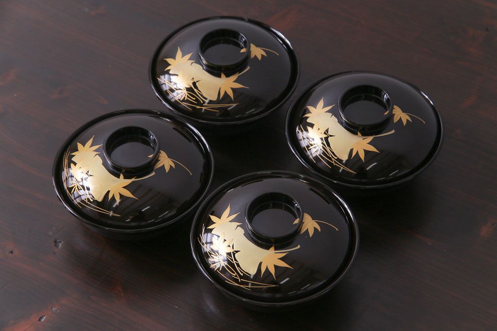 和製アンティーク 黒漆塗り 紅葉と銀杏の図柄が和の雰囲気漂う木製碗4客セット(漆器)(1)