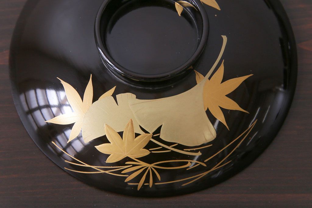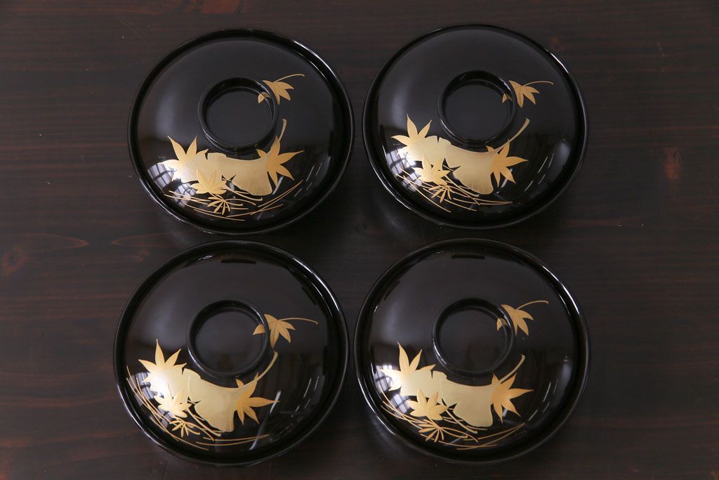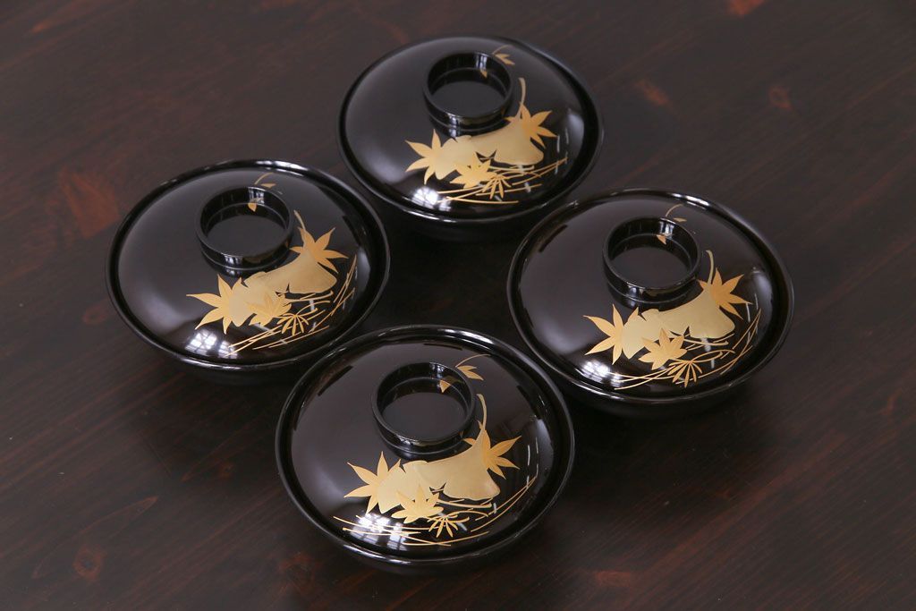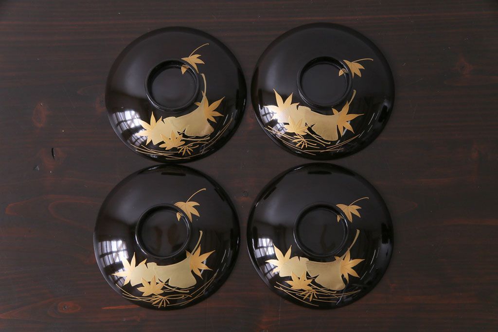 ラフジュ工房> 骨董・美術品> 骨董-漆器 > 和製アンティーク 黒漆塗り 紅葉と銀杏の図柄が和の雰囲気漂う木製碗4客セット(漆器)(1)