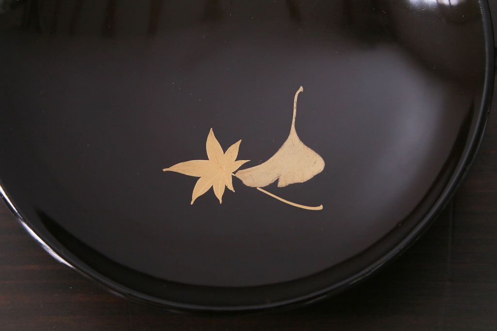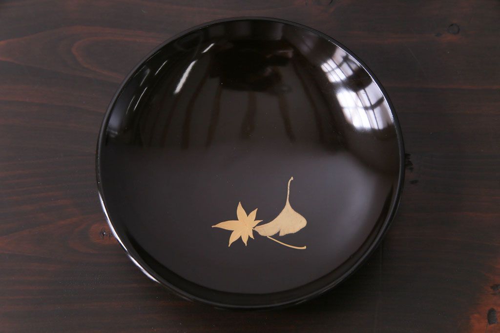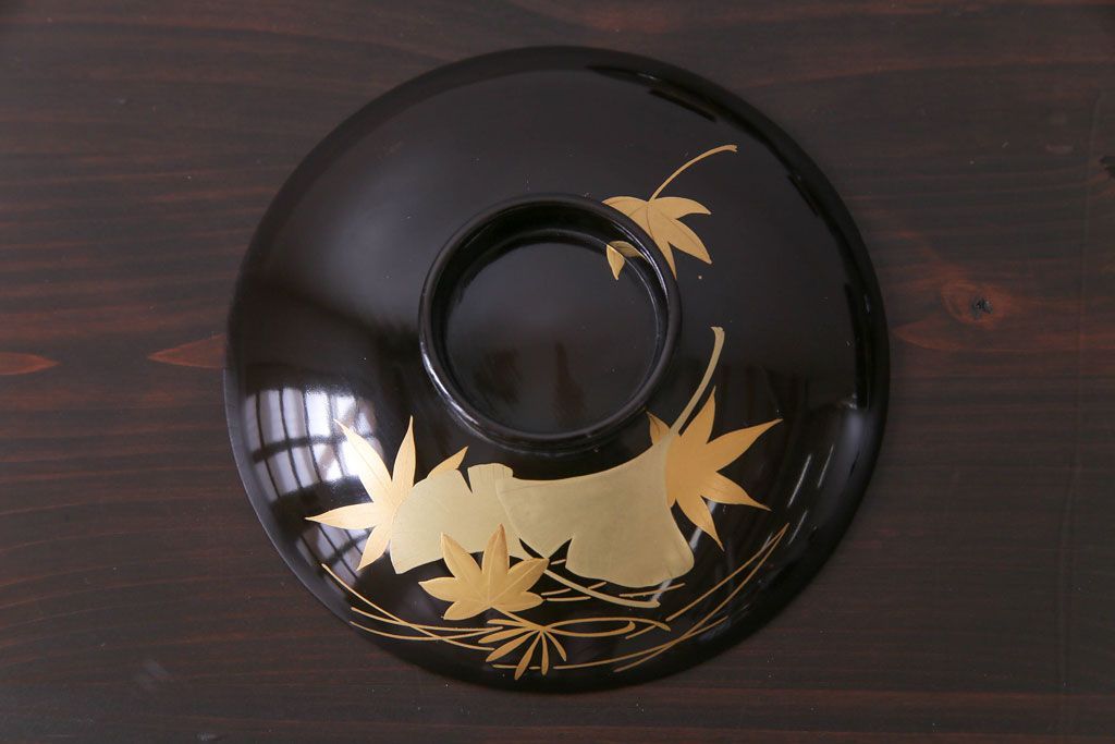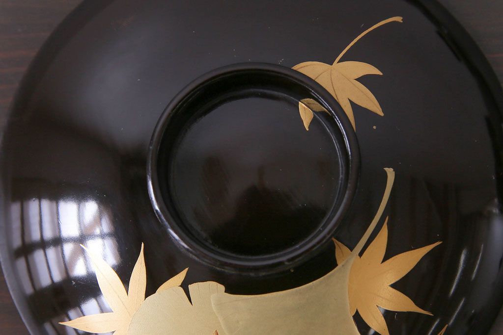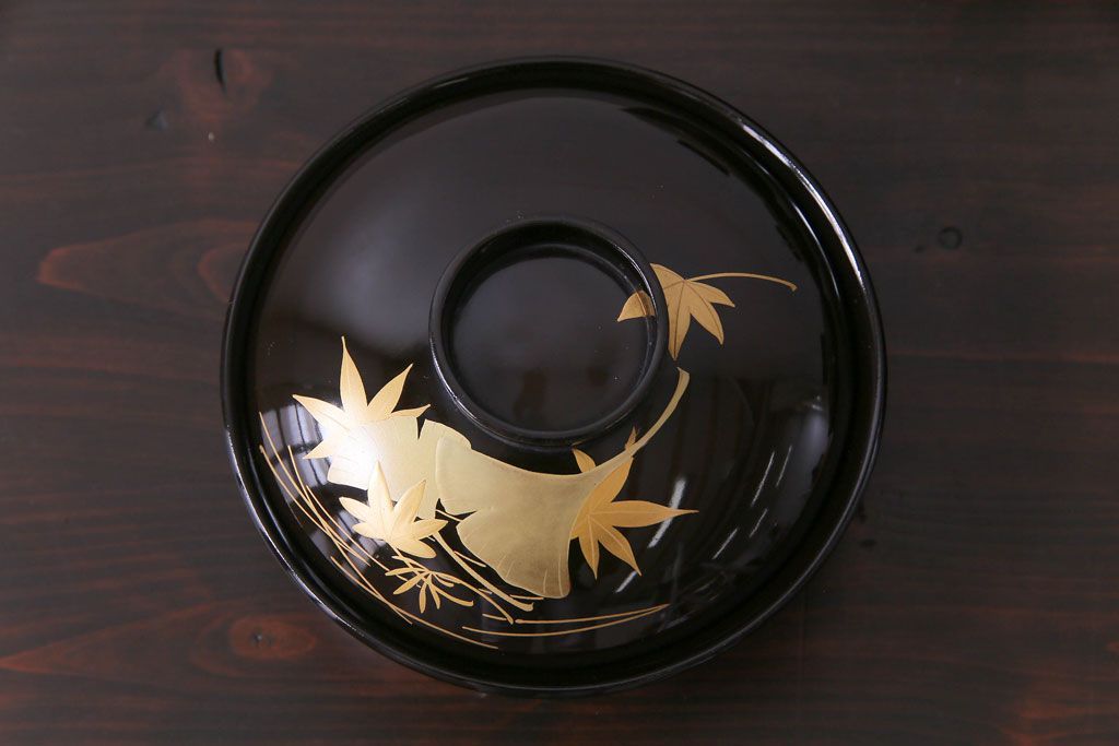 ラフジュ工房> 骨董・美術品> 骨董-漆器 > 和製アンティーク 黒漆塗り 紅葉と銀杏の図柄が和の雰囲気漂う木製碗4客セット(漆器)(1)