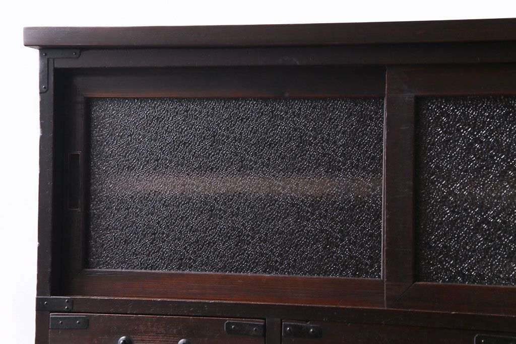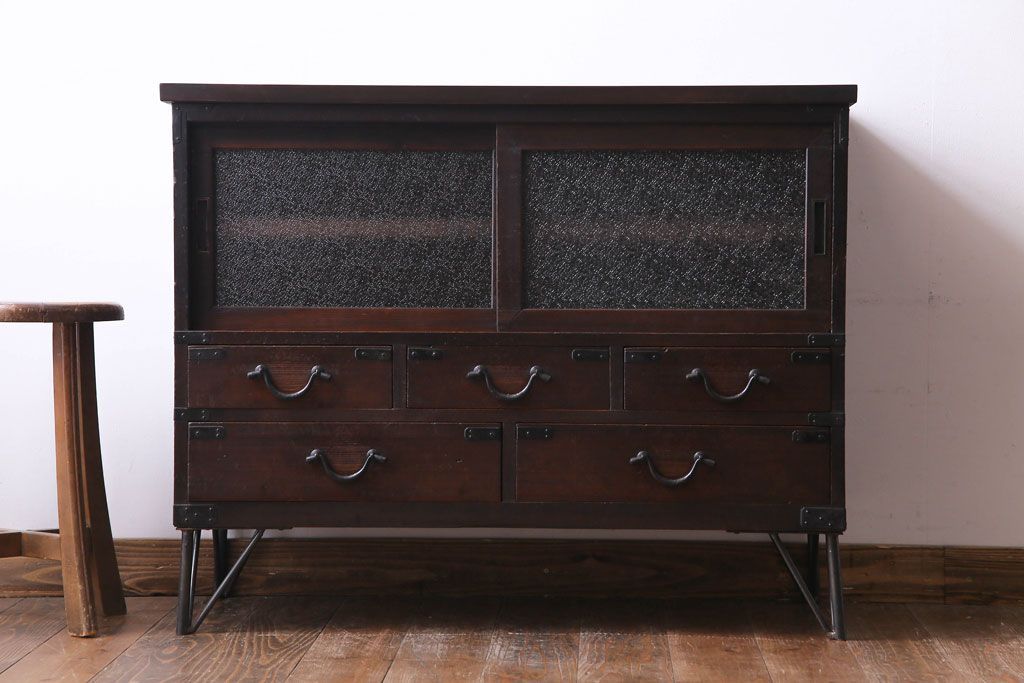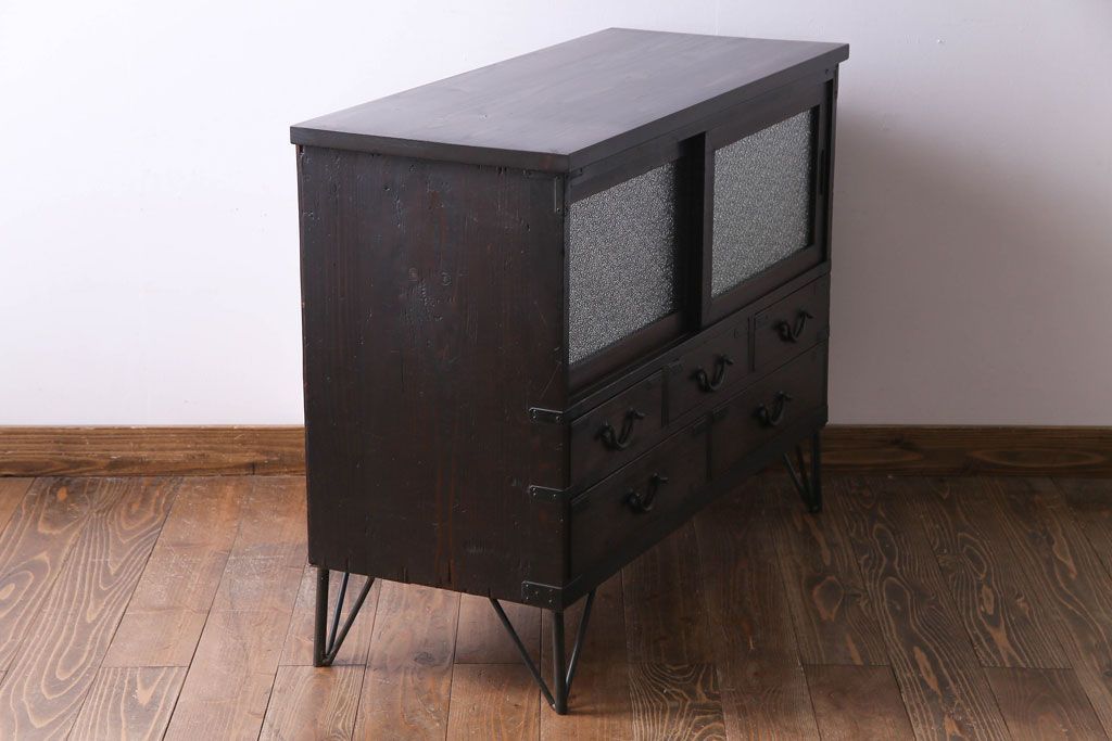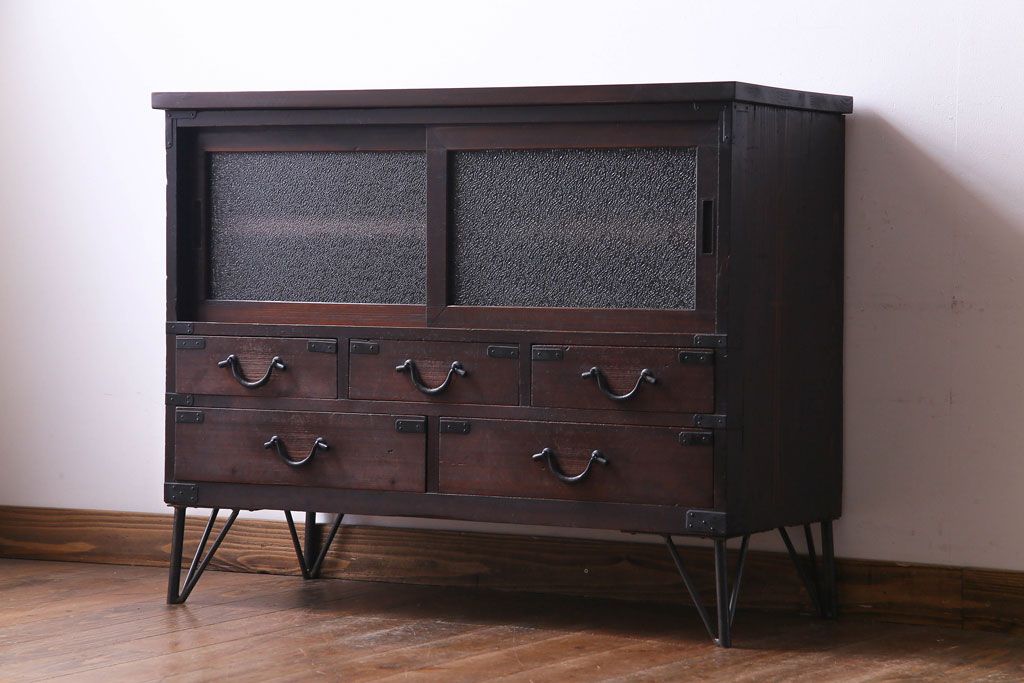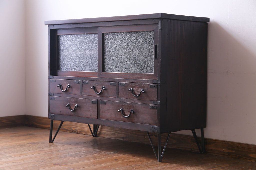 レトロ家具 和製アンティーク ダイヤガラス入り レトロな空間にも馴染むリメイク箪笥ローボード(ローチェスト、収納棚)