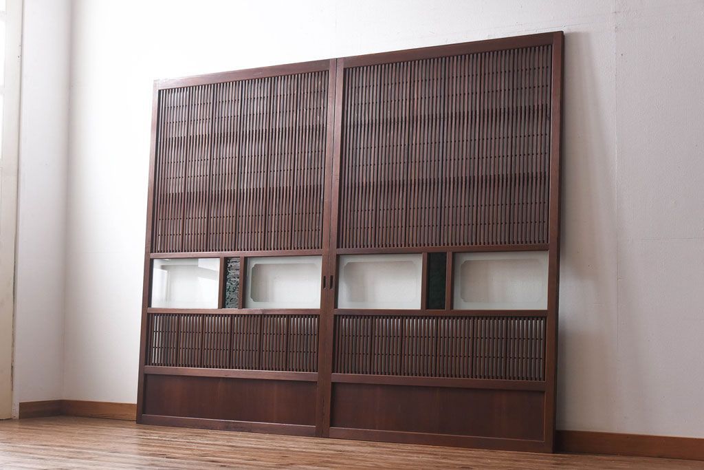昭和中期 幅広! 板ガラス裏障子留め 色ガラスがアクセントのガラス入り格子戸(ガラス帯戸、引き戸、建具)2枚組(1)です。