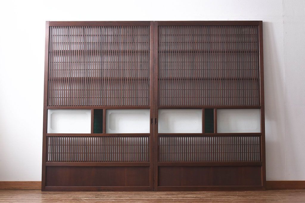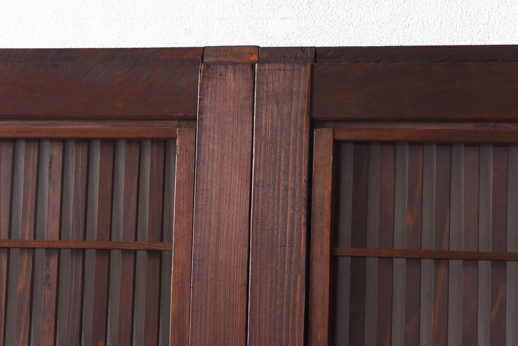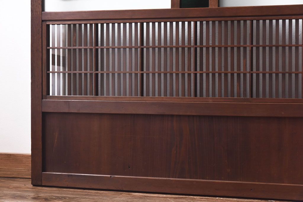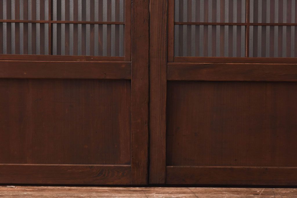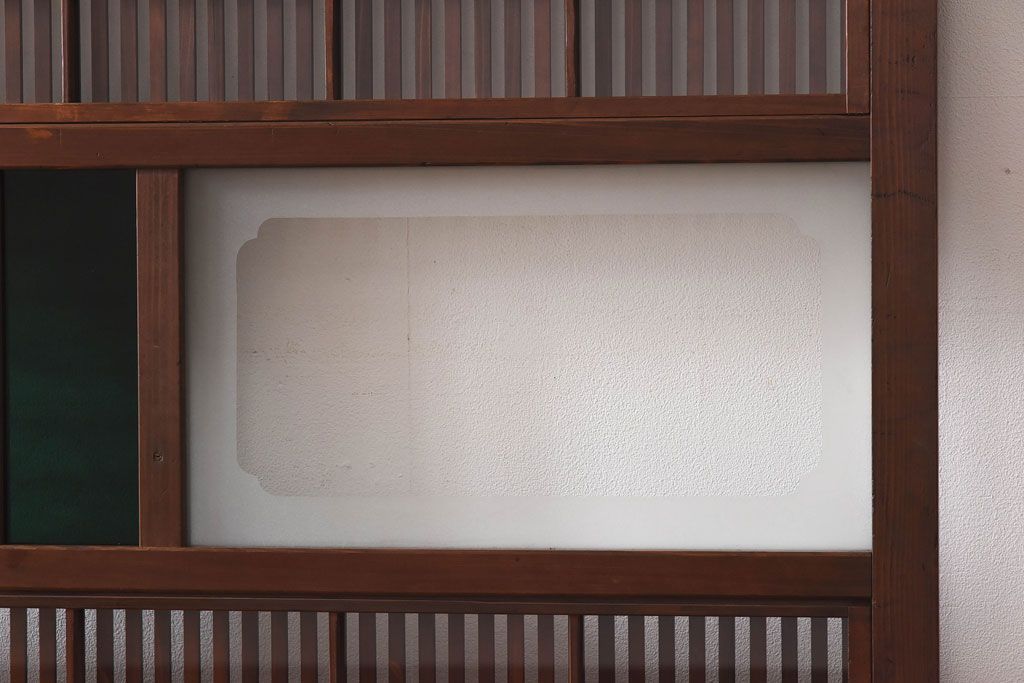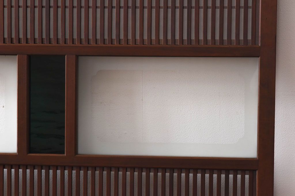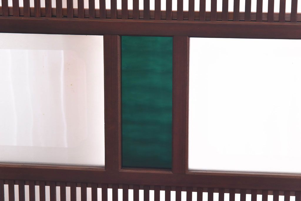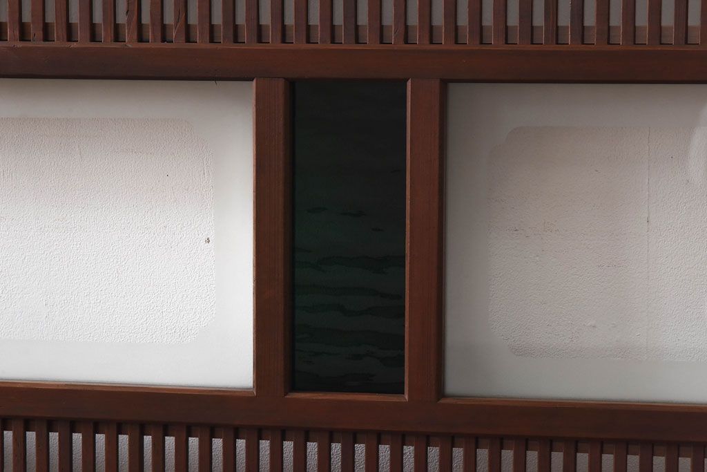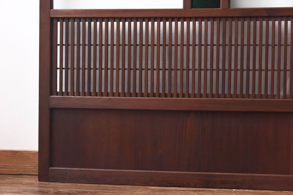 昭和中期 幅広! 板ガラス裏障子留め 色ガラスがアクセントのガラス入り格子戸(ガラス帯戸、引き戸、建具)2枚組(1)