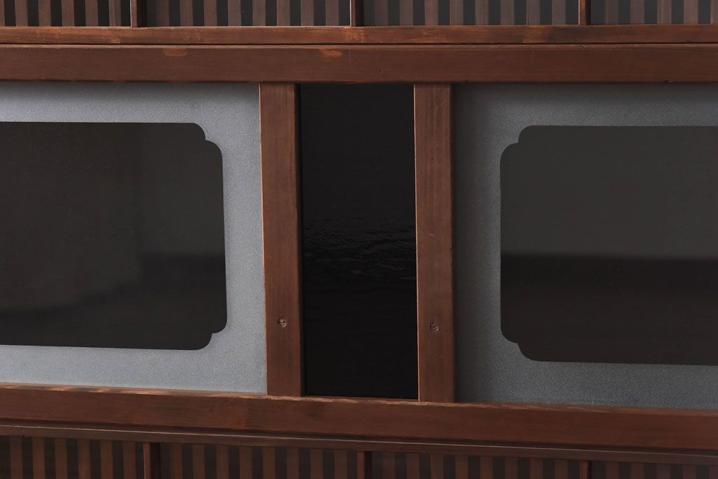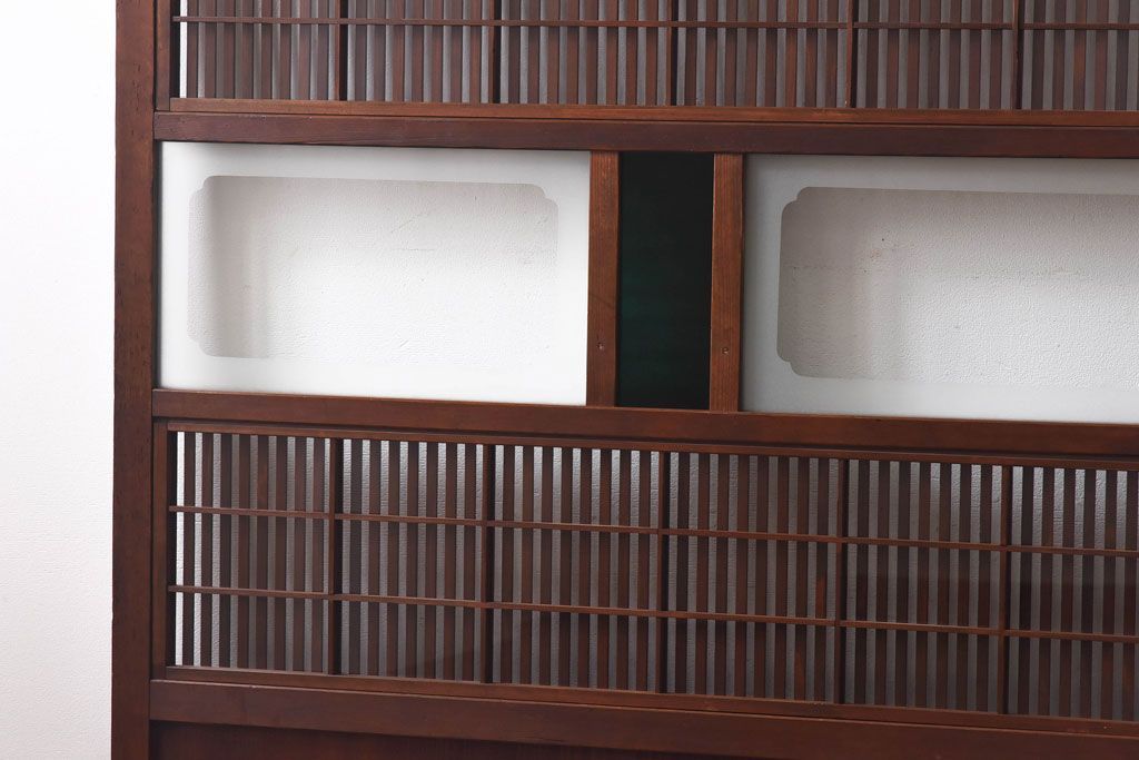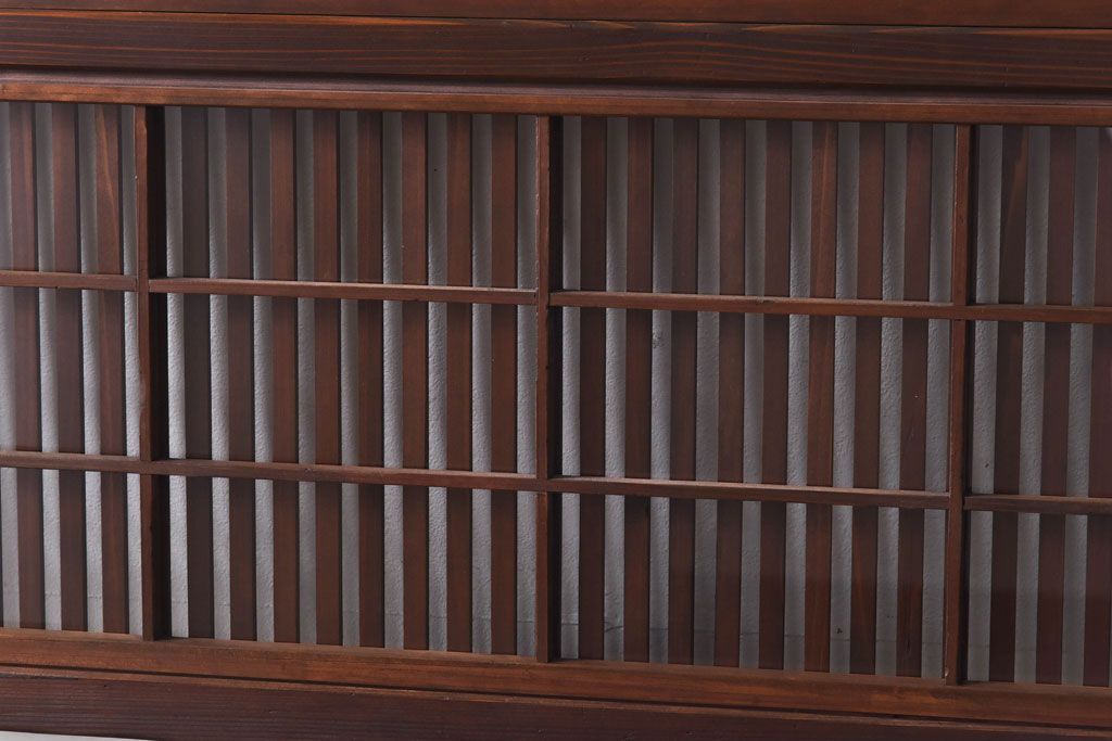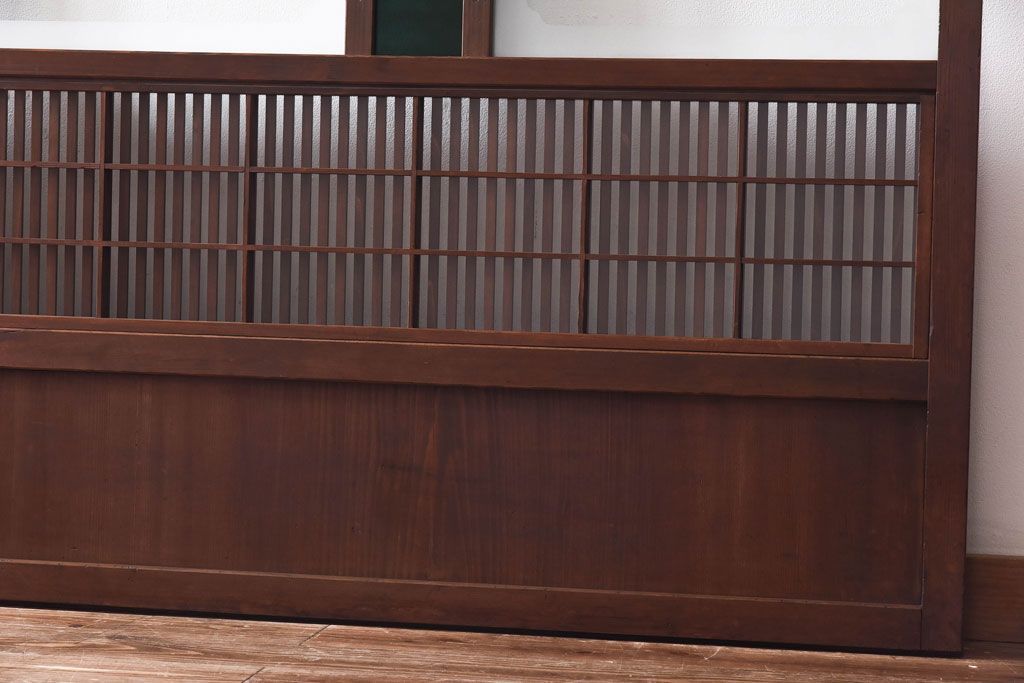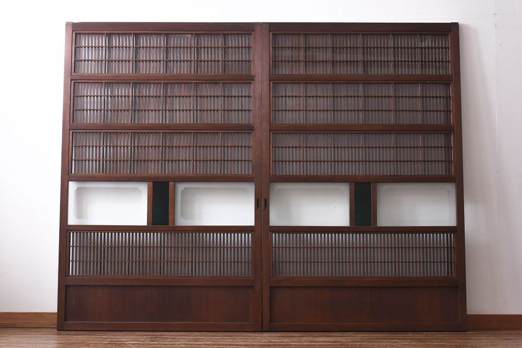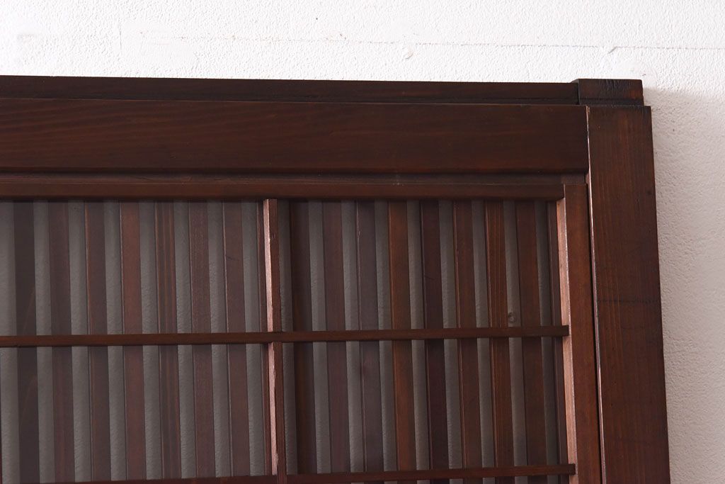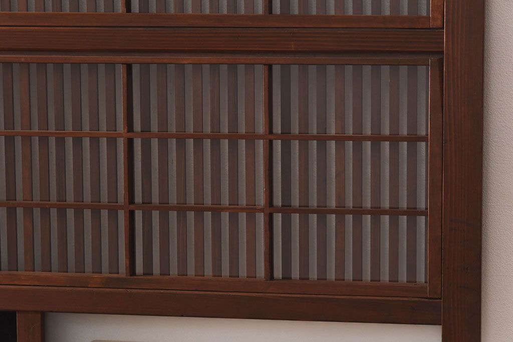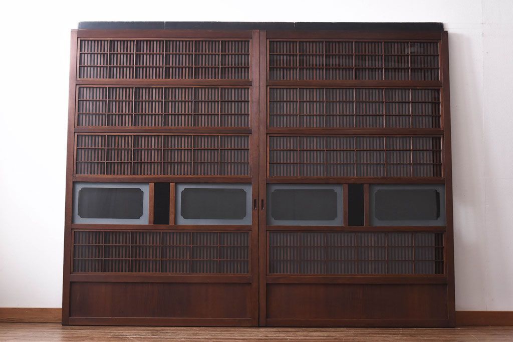 昭和中期 幅広! 板ガラス裏障子留め 色ガラスがアクセントのガラス入り格子戸(ガラス帯戸、引き戸、建具)2枚組(1)