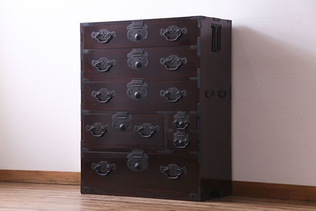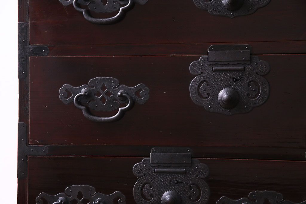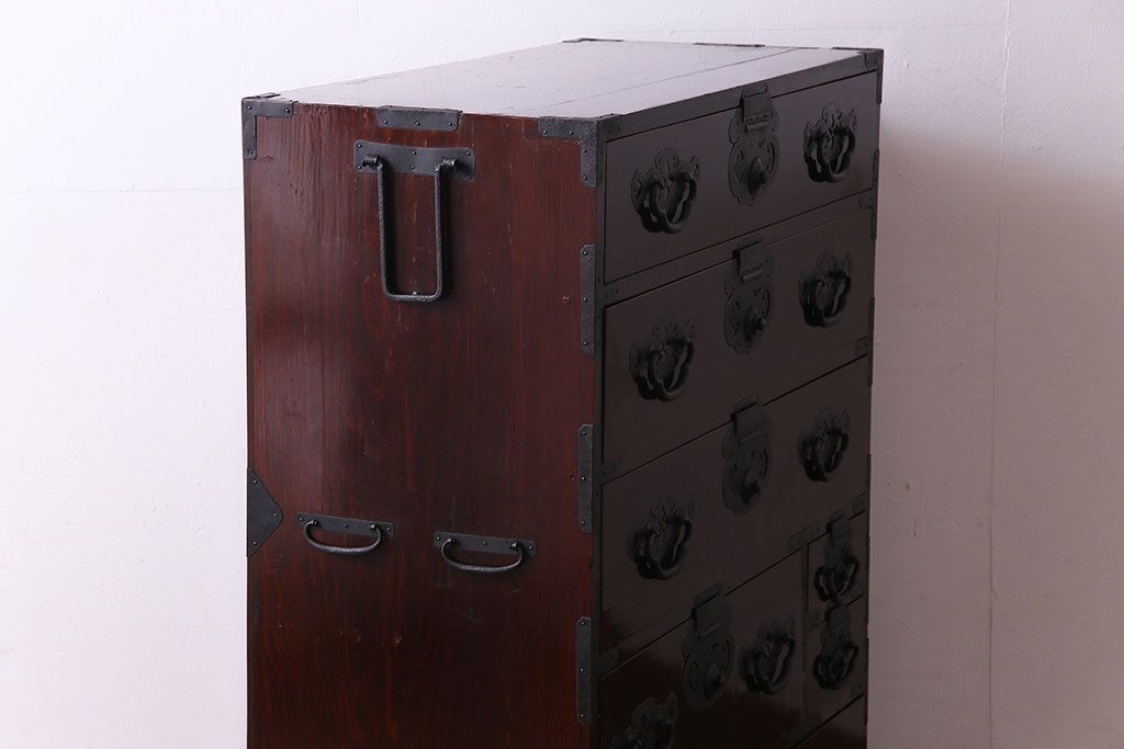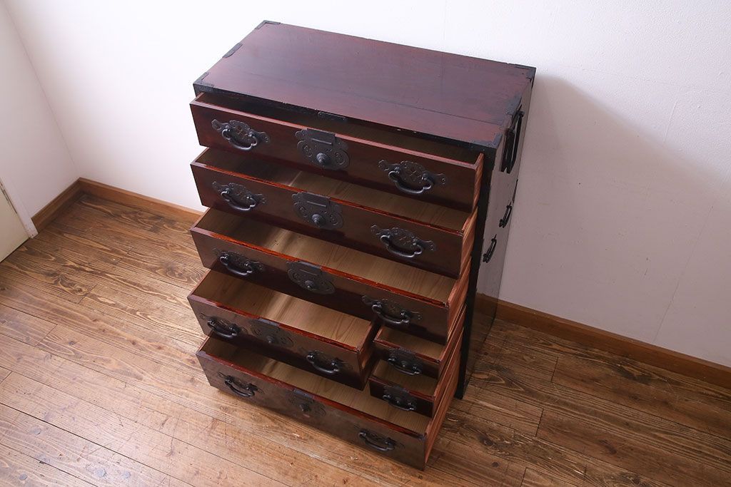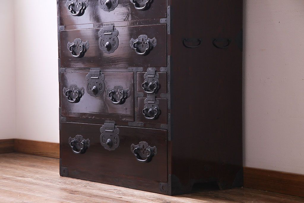 アンティーク家具 和製アンティーク 杉材 巾着金具と漆塗りが魅力の松本箪笥(和タンス、衣装箪笥、整理箪笥)