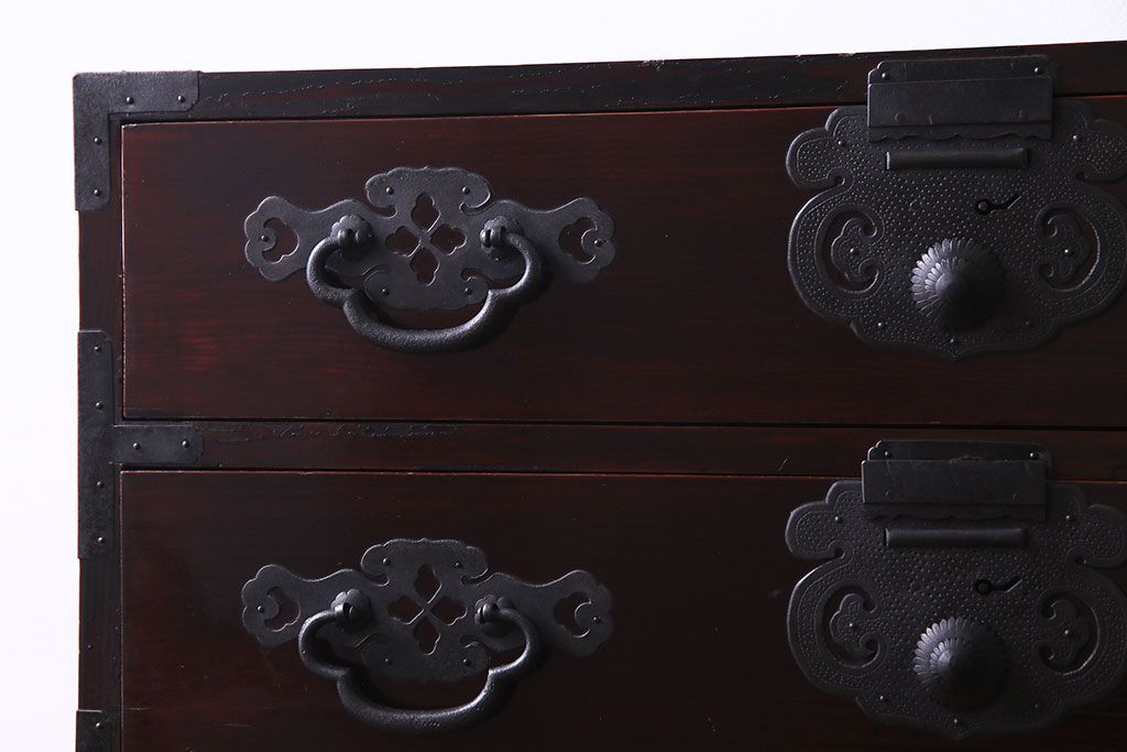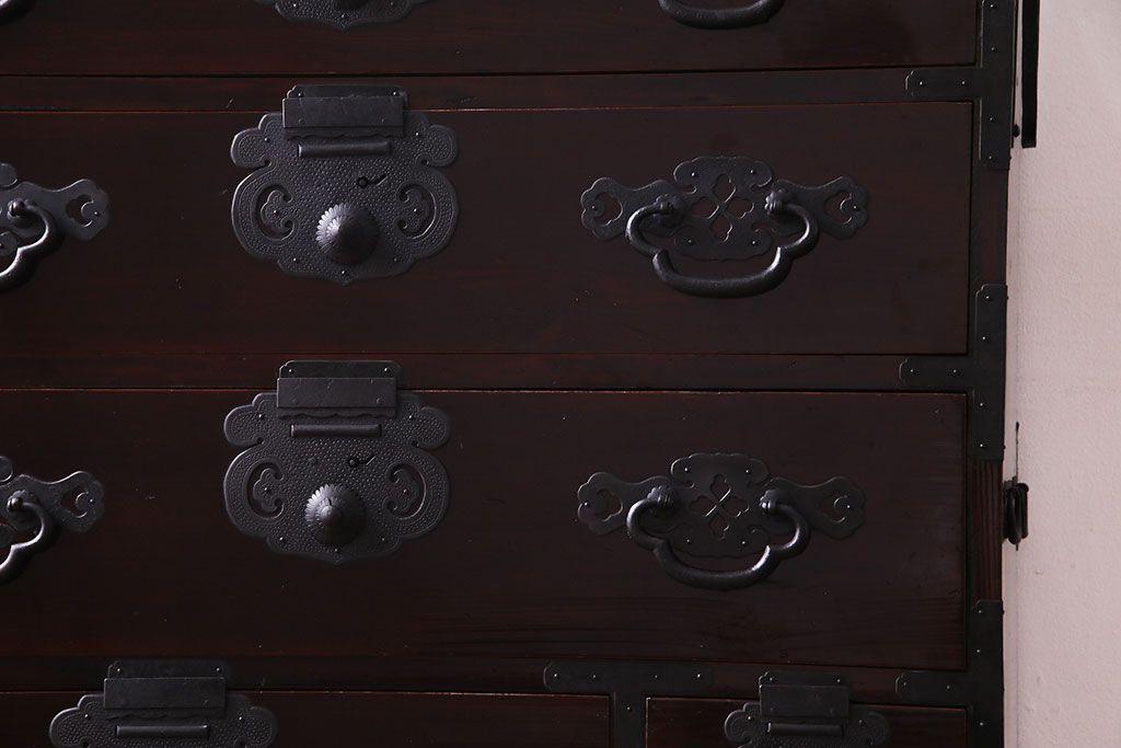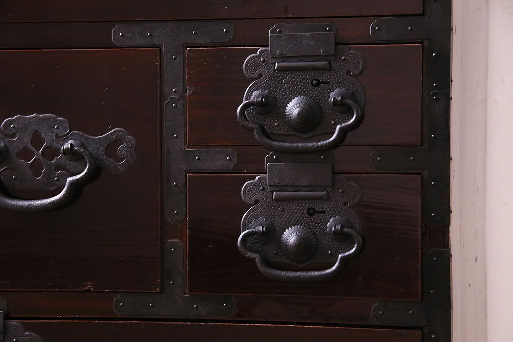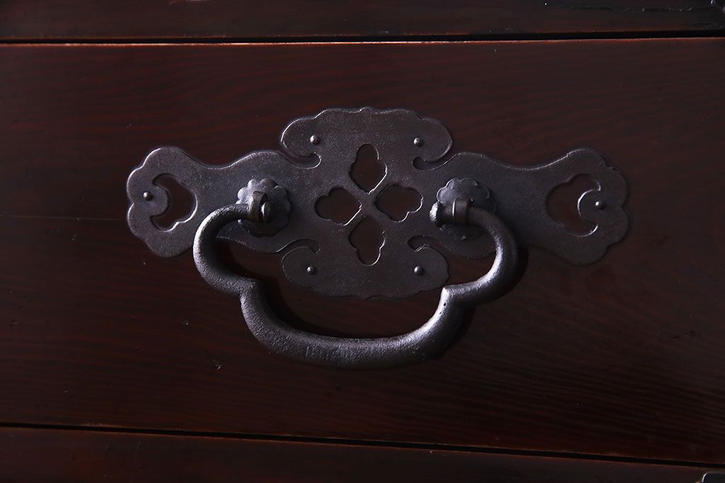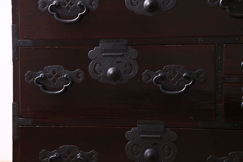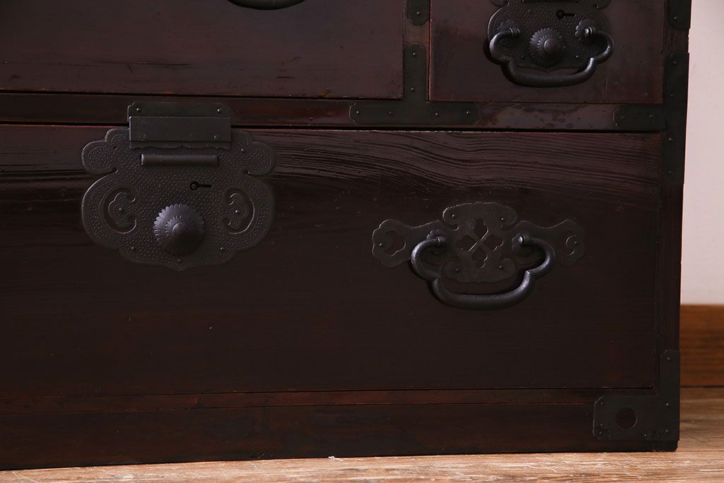 ラフジュ工房> 和箪笥 > アンティーク家具 和製アンティーク 杉材 巾着金具と漆塗りが魅力の松本箪笥(和タンス、衣装箪笥、整理箪笥)