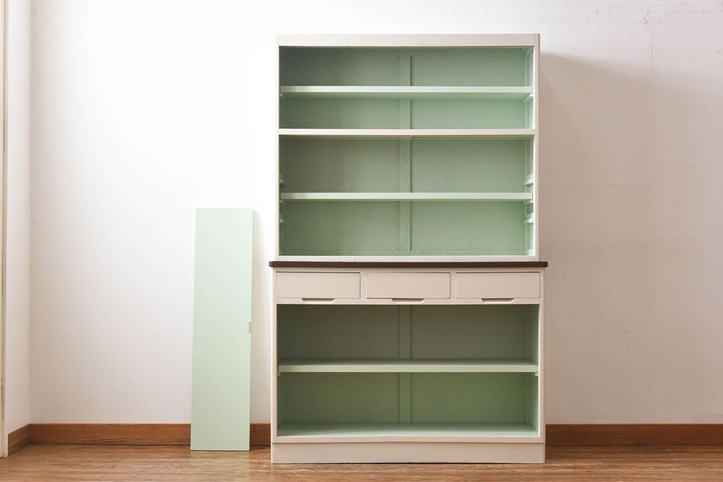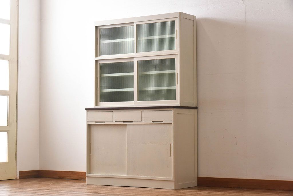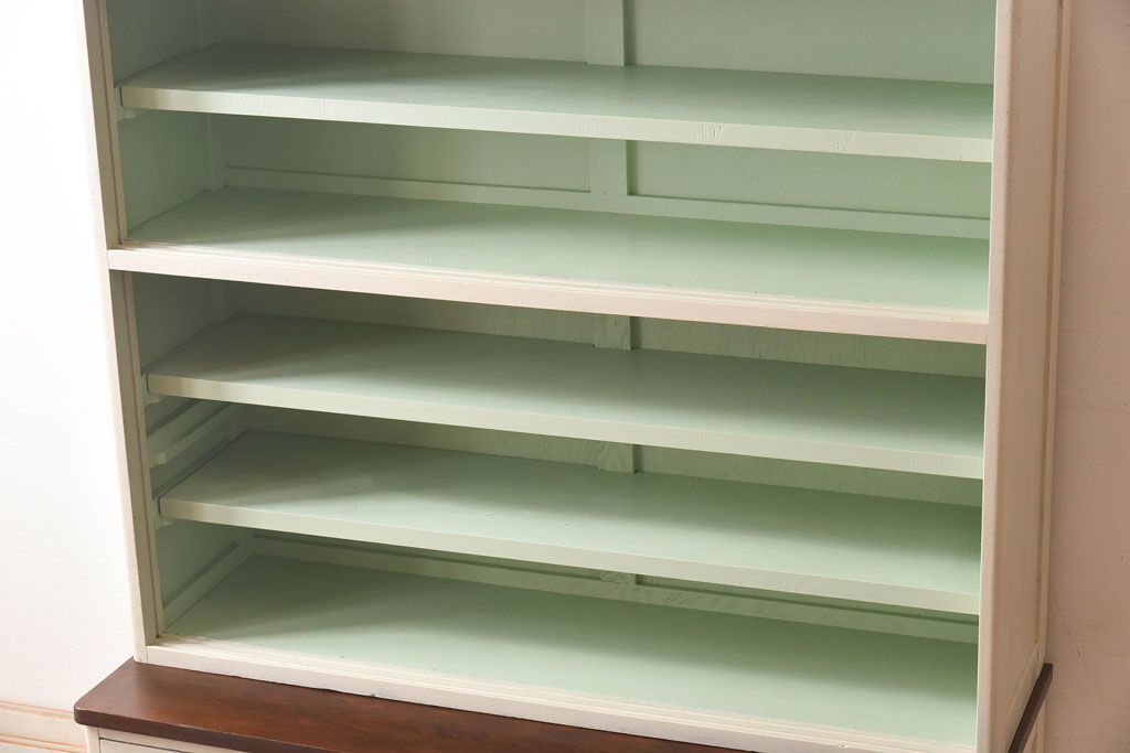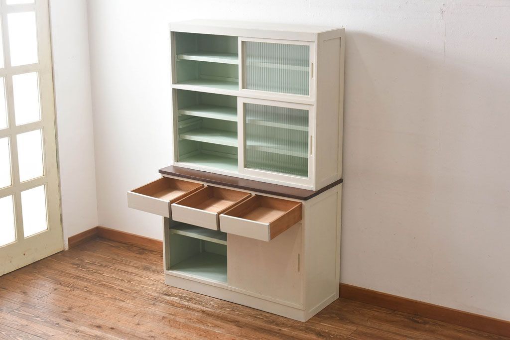 ペイント家具 昭和中期 モールガラス入り 淡いカラーが爽やかな食器棚(カップボード、収納棚)