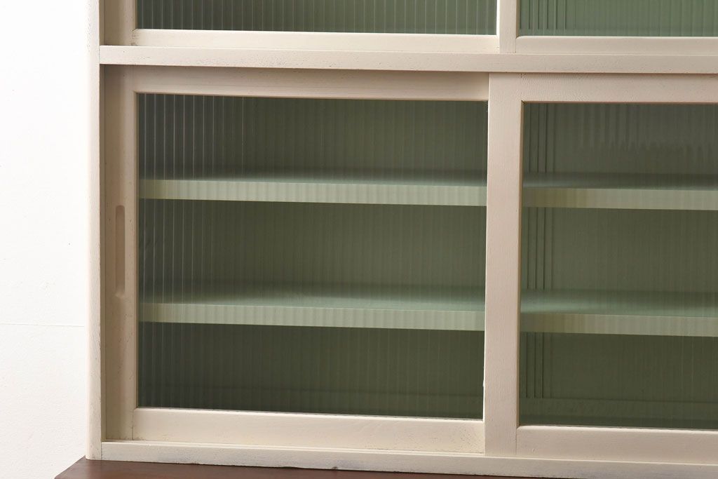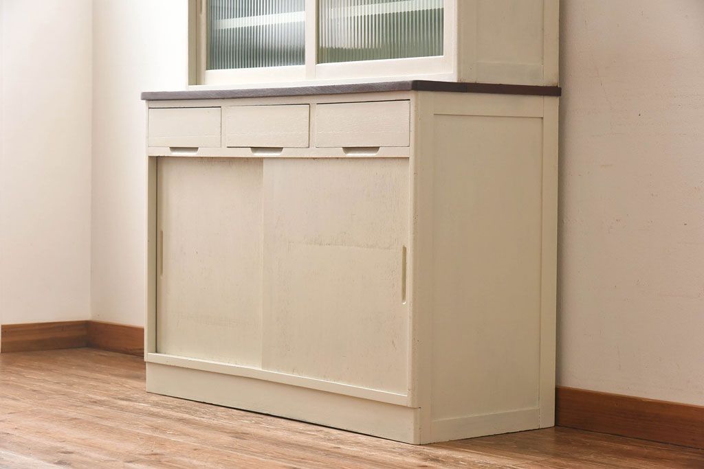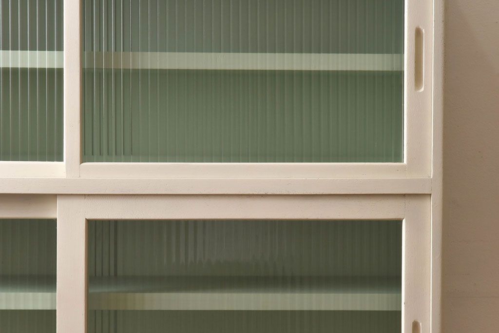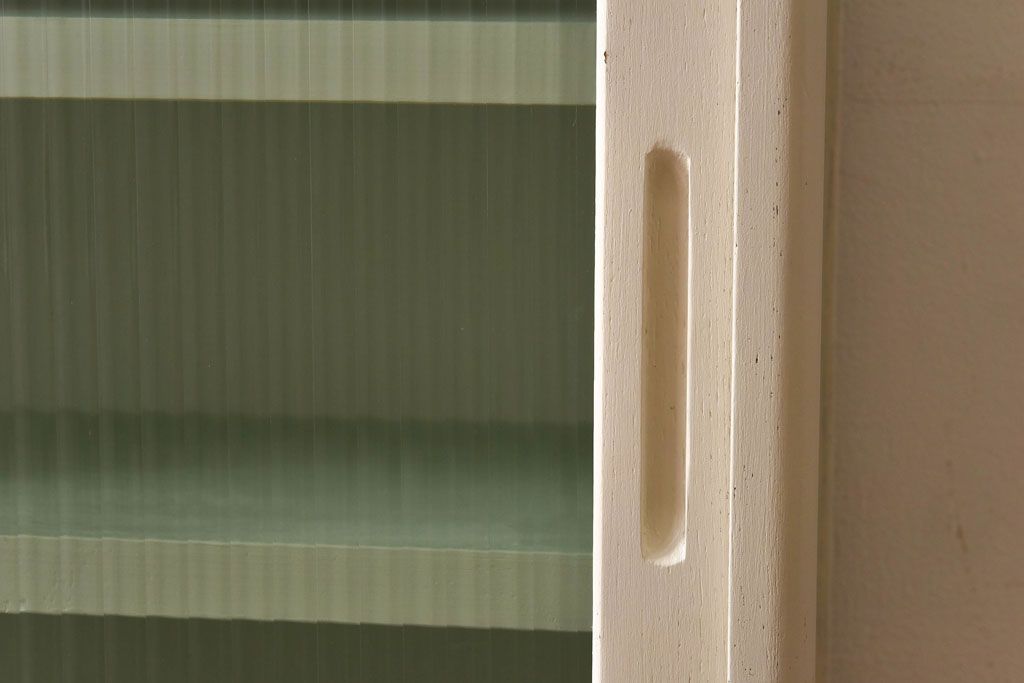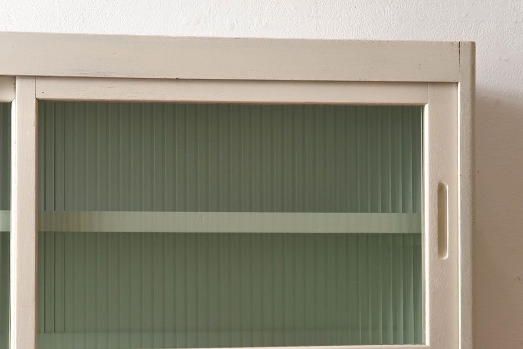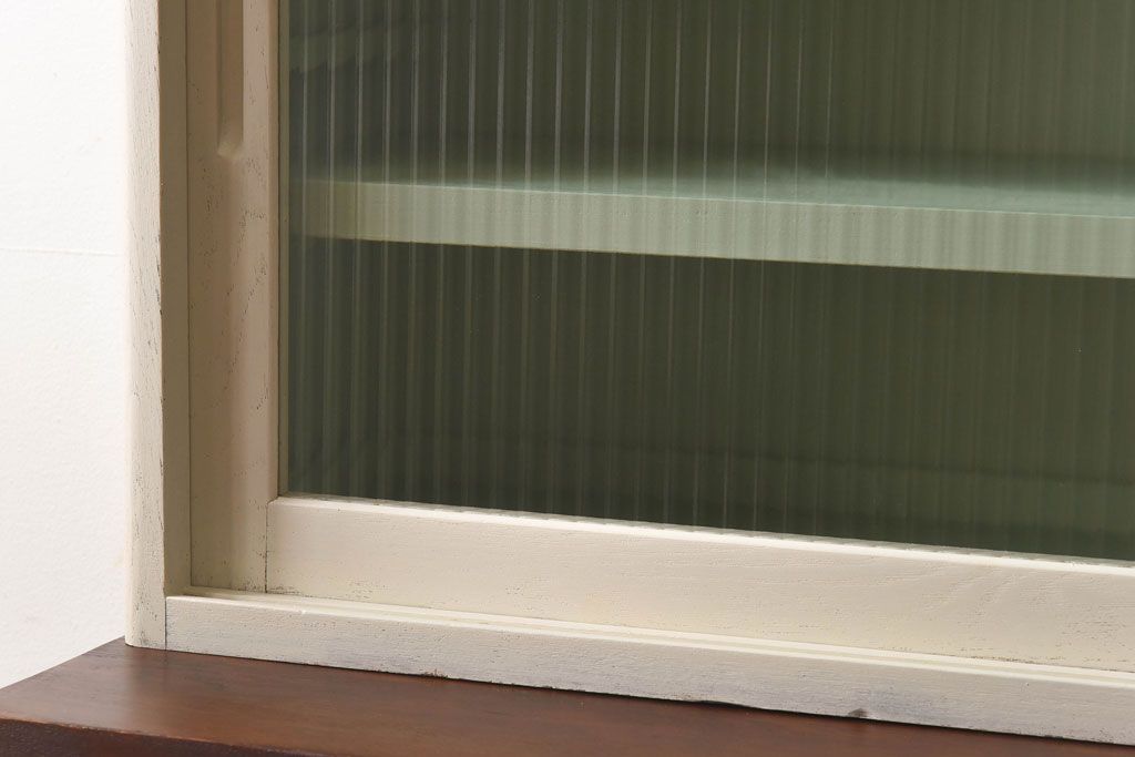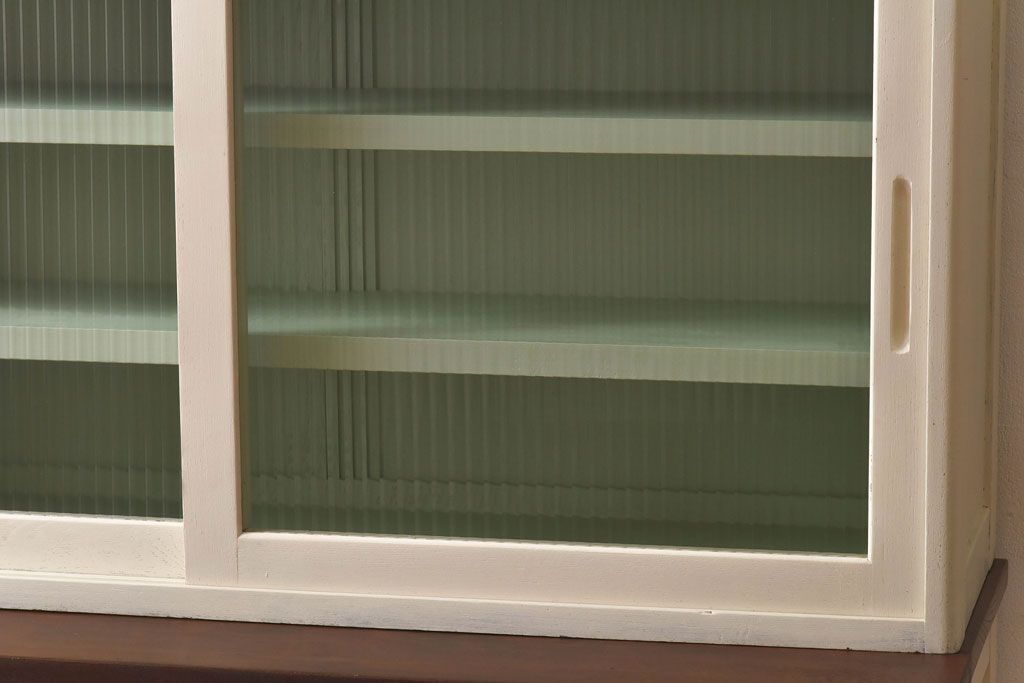 ラフジュ工房> キャビネット・戸棚> 食器棚・カップボード > ペイント家具 昭和中期 モールガラス入り 淡いカラーが爽やかな食器棚(カップボード、収納棚)