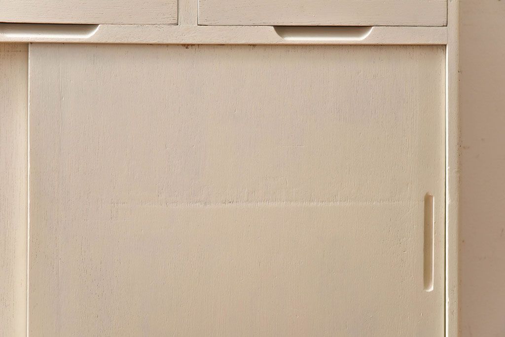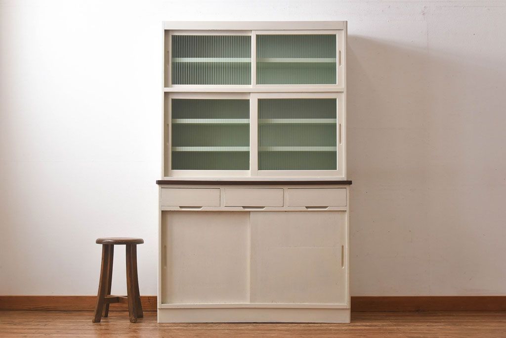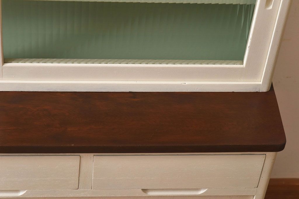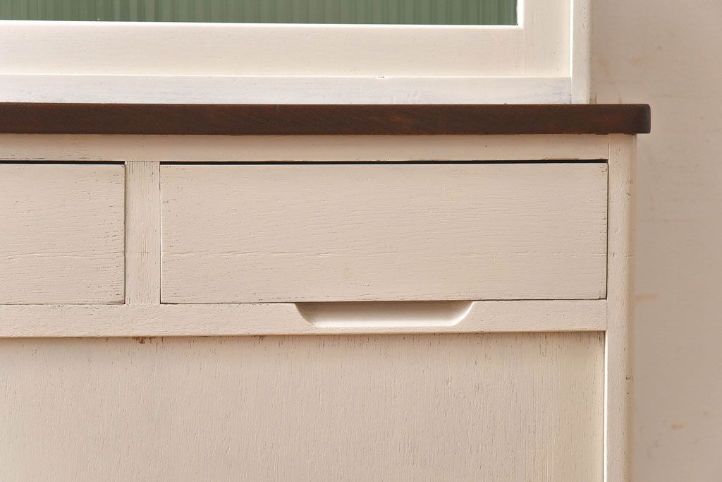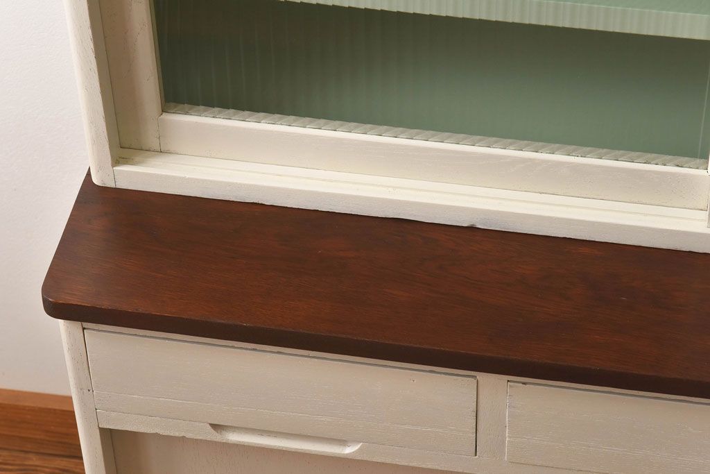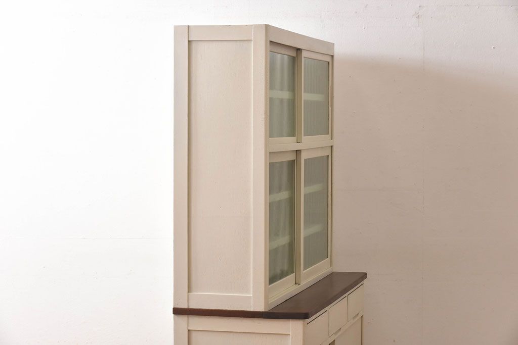 ラフジュ工房> キャビネット・戸棚> 食器棚・カップボード > ペイント家具 昭和中期 モールガラス入り 淡いカラーが爽やかな食器棚(カップボード、収納棚)