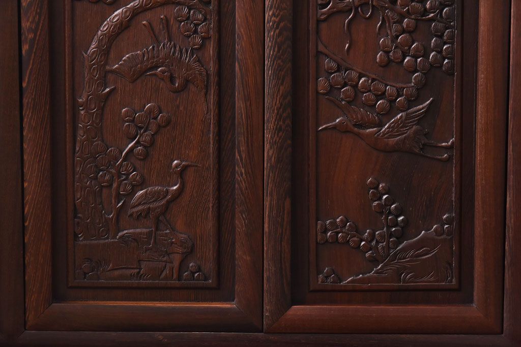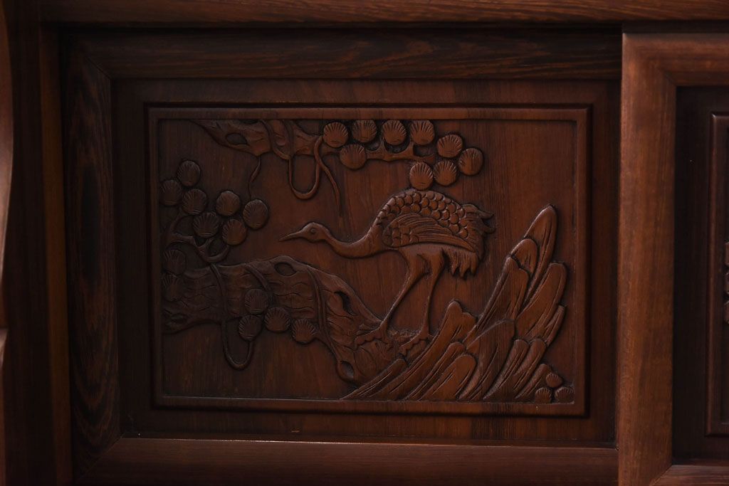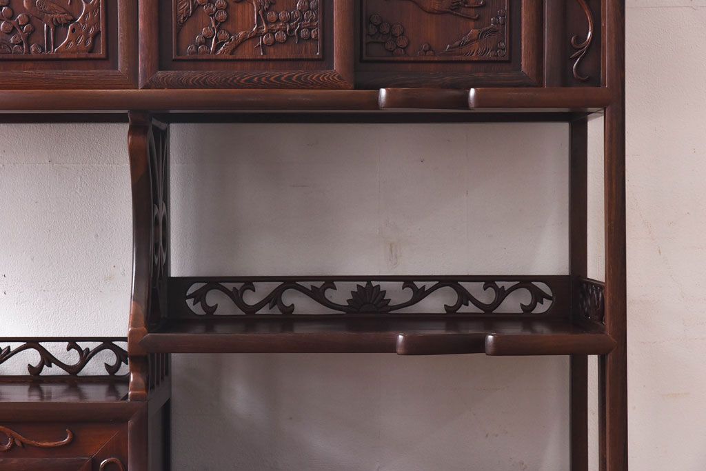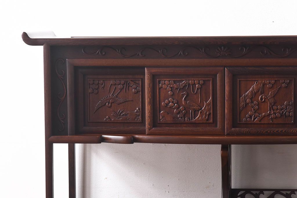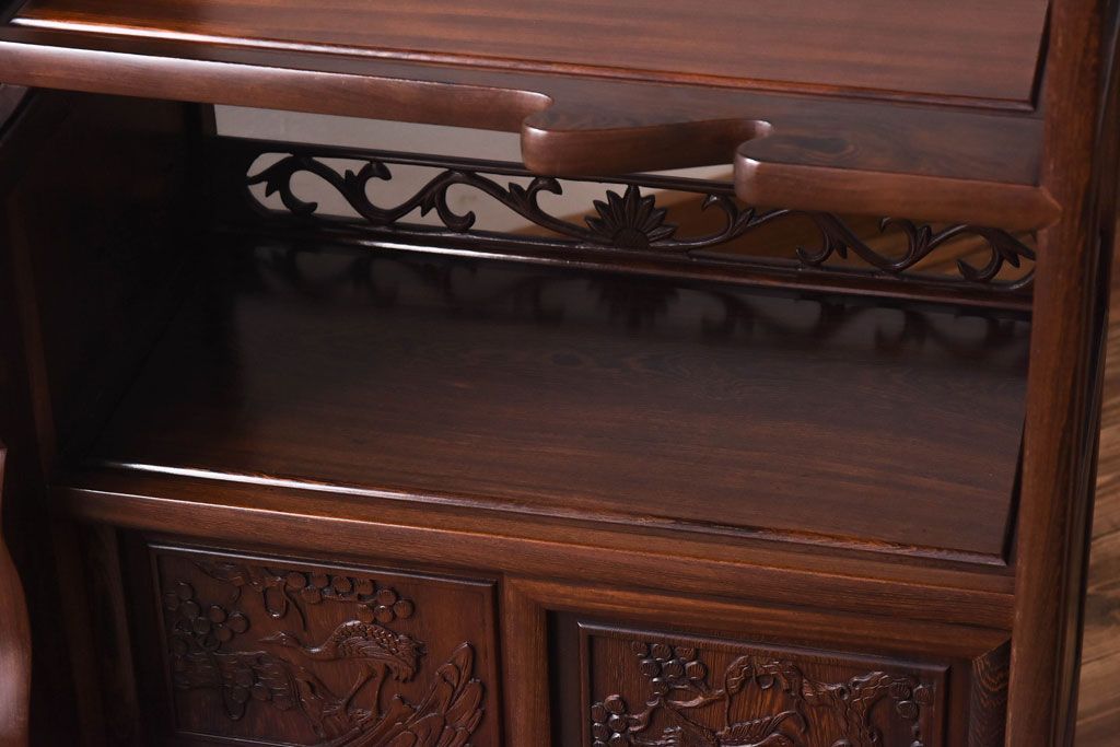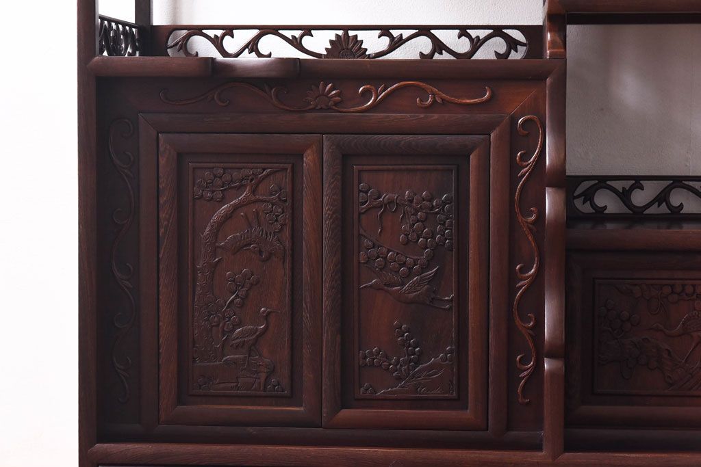 民芸家具 鉄刀木(タガヤサン) 鶴松の彫りが施された異国情緒あふれる飾り棚(茶棚、収納棚)