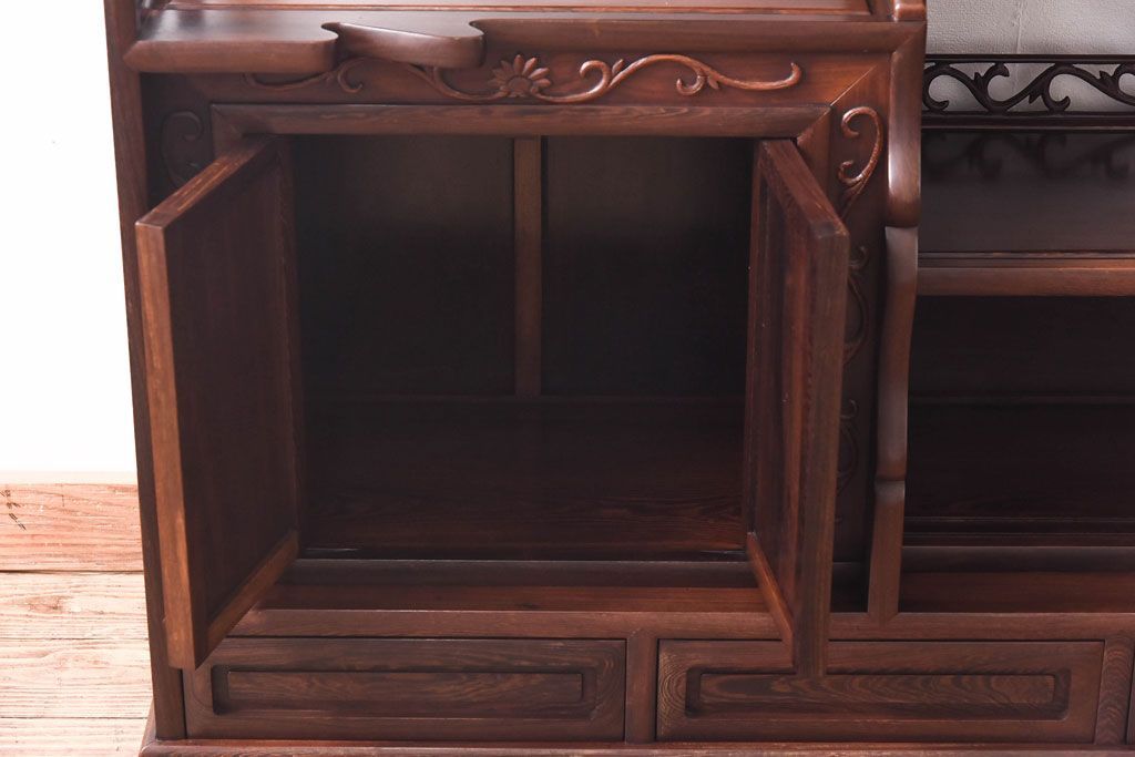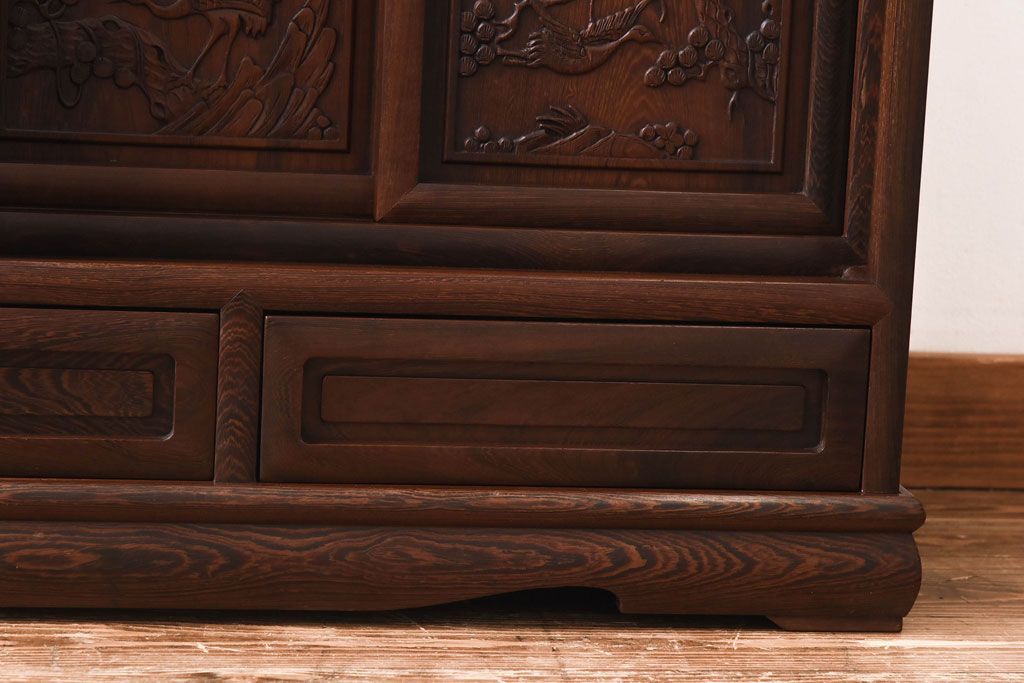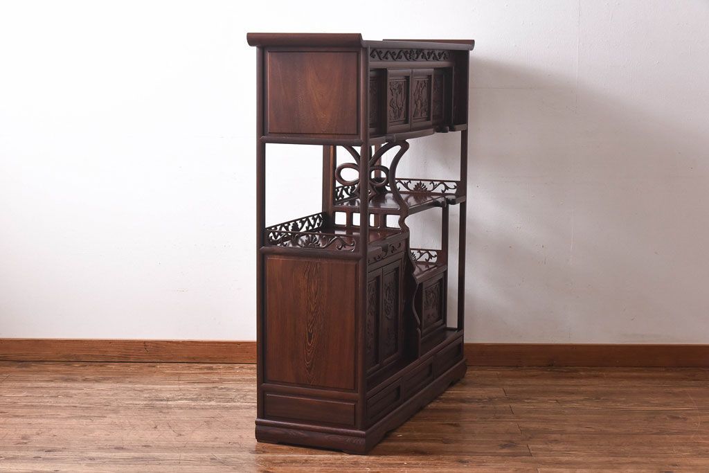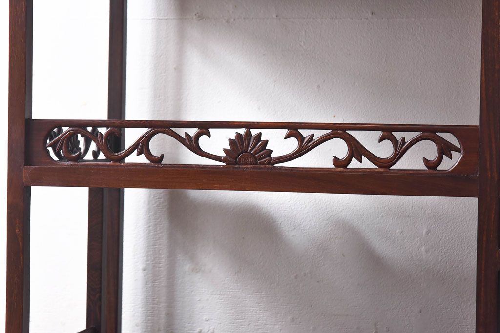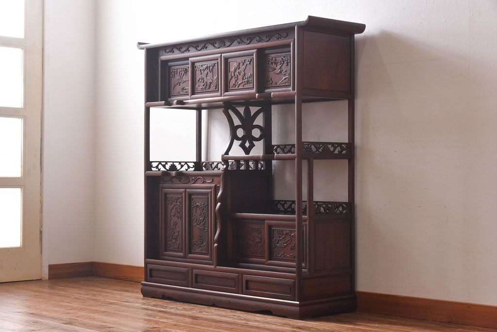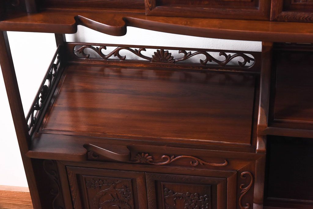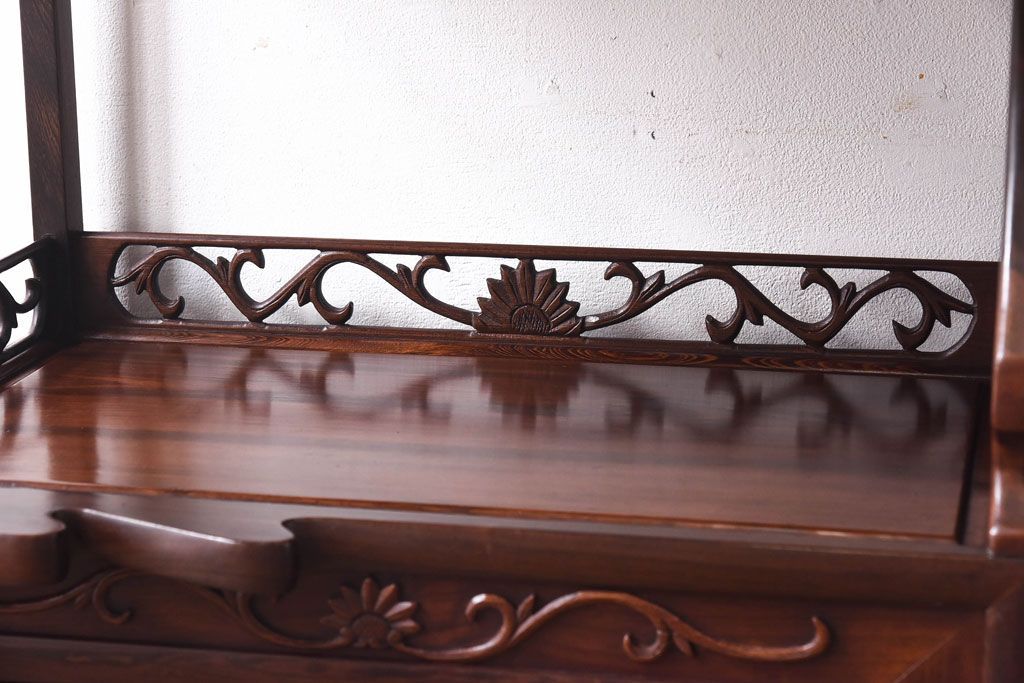 民芸家具 鉄刀木(タガヤサン) 鶴松の彫りが施された異国情緒あふれる飾り棚(茶棚、収納棚)