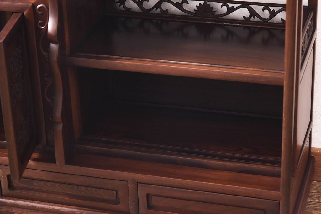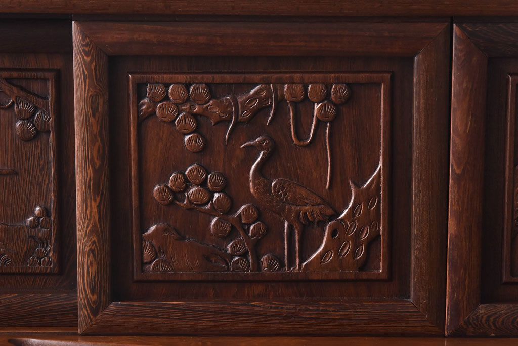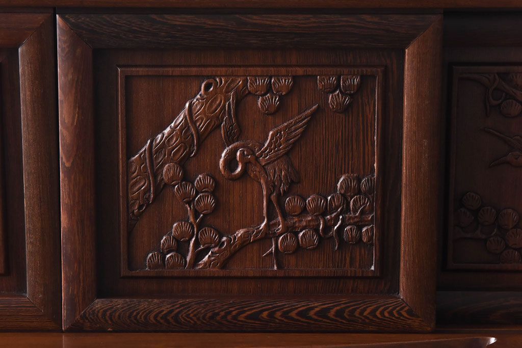 ラフジュ工房> 和箪笥> 茶箪笥・茶棚 > 民芸家具 鉄刀木(タガヤサン) 鶴松の彫りが施された異国情緒あふれる飾り棚(茶棚、収納棚)