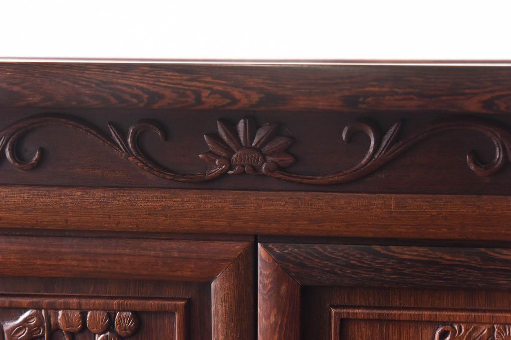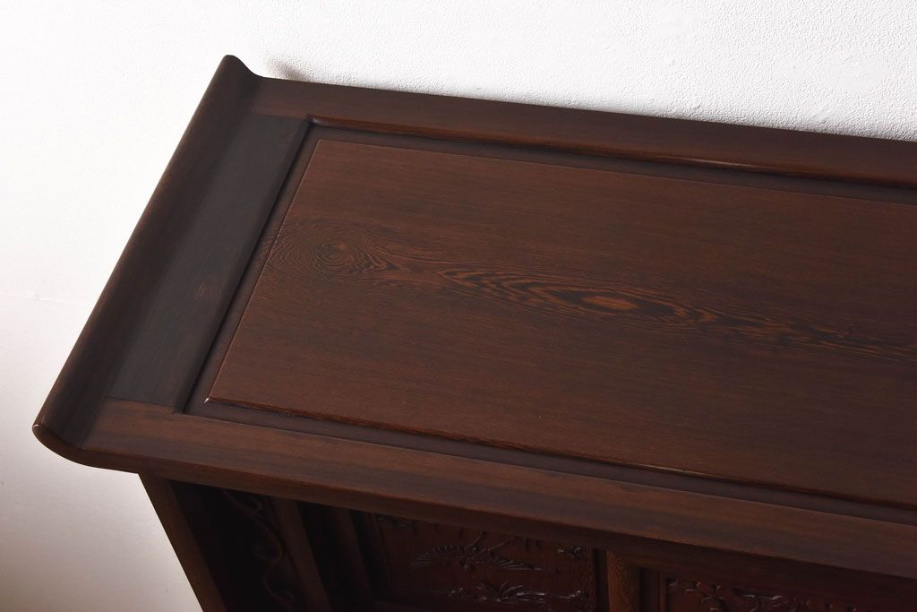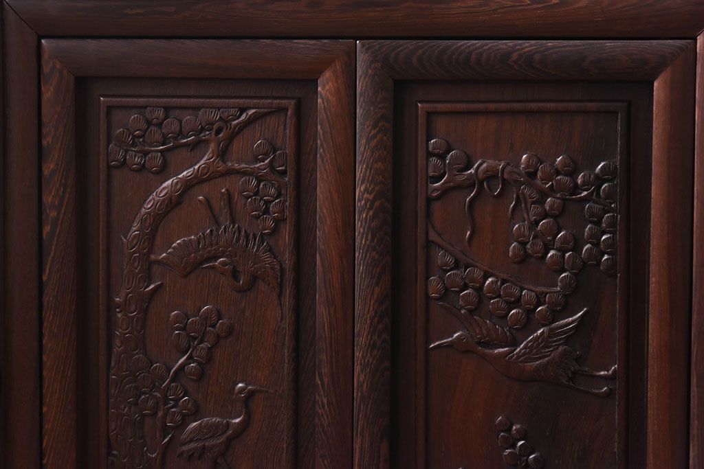 ラフジュ工房> 和箪笥 > 民芸家具 鉄刀木(タガヤサン) 鶴松の彫りが施された異国情緒あふれる飾り棚(茶棚、収納棚)