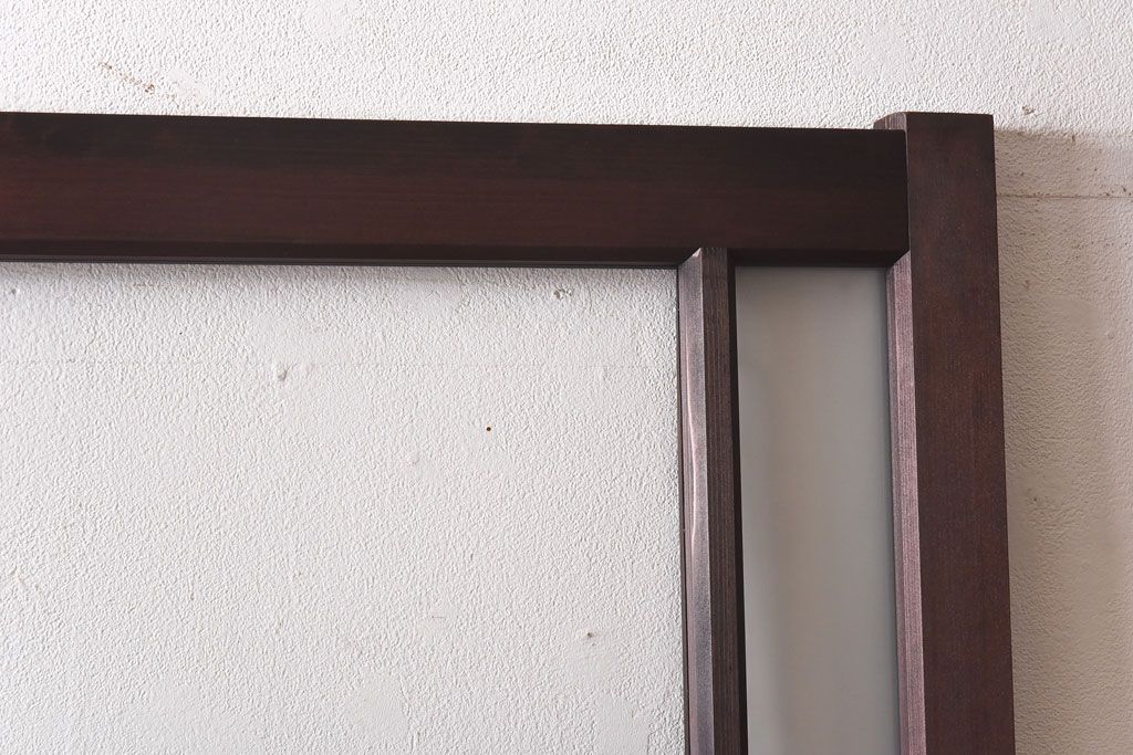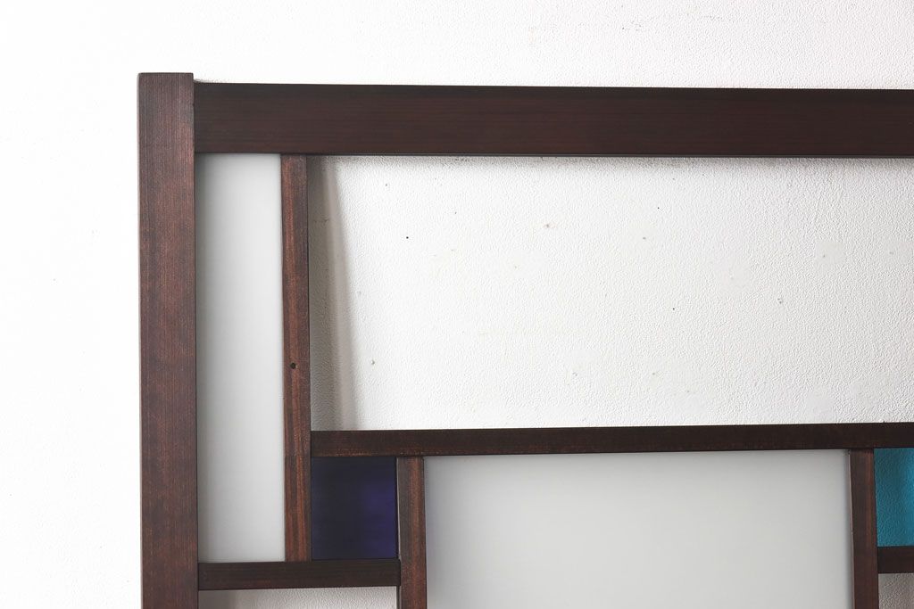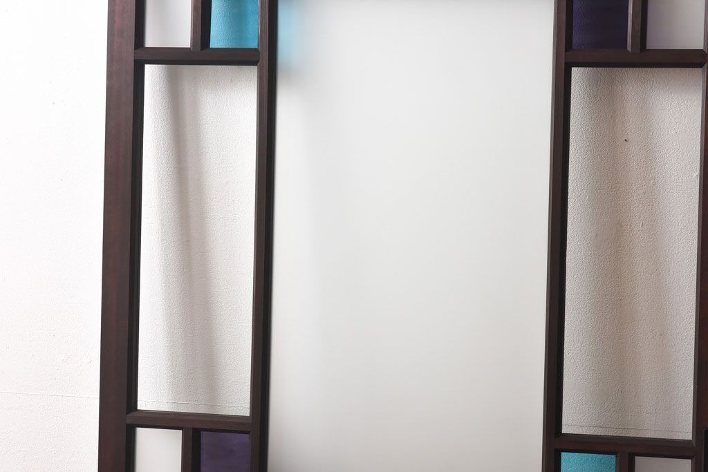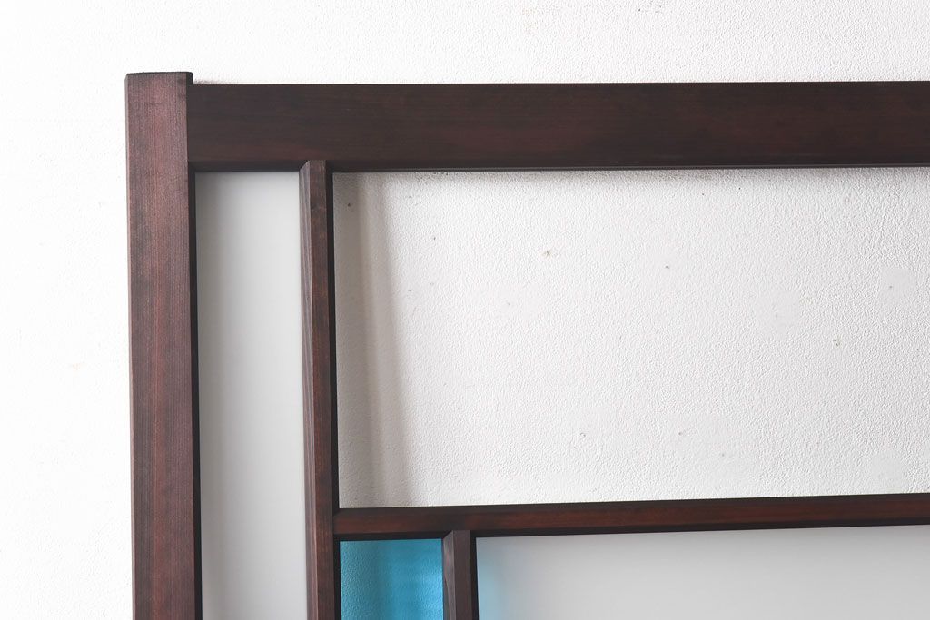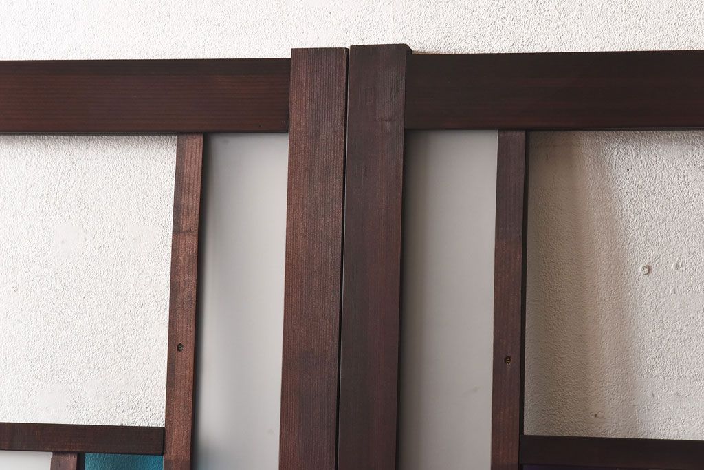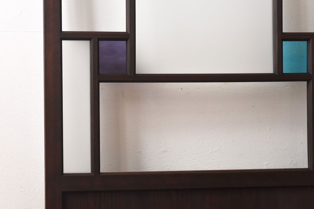 ラフジュ工房オリジナル 色ガラスがポイントになったレトロな引き戸(建具、ガラス戸)2枚セット(1)です。 2色の色ガラスがポイントになった 当店オリジナル製作の引き戸2枚セットです。 水色と紫の色ガラスは愛らしさがありながらも 落ち着いた雰囲気も醸し出しています。 日本で馴染みの深い杉材を使用しており、 どこか懐かしさを感じるような 鮮明な木目が魅力的です。 レトロな佇まいながら新品ですので、 店舗でのご使用も安心です。 大正ロマンや和モダンスタイルの空間にいかがでしょうか。 当店オリジナル商品です。古いお品ではありません。色ガラスも現代物です。 1枚目の画像にある建具2枚のうち、左のみ計測致しましたので、そちらをご参考ください。 使用上問題のあるダメージはありません。 ■框サイズ 上60mm/左45mm/右45mm/下60mm ■重量 約10kg(1枚)