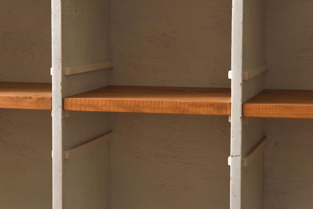 棚板は取り外しできます。棚板は全部で7枚あります。棚受けは各3ヶ所、60mmピッチで調整できます。
