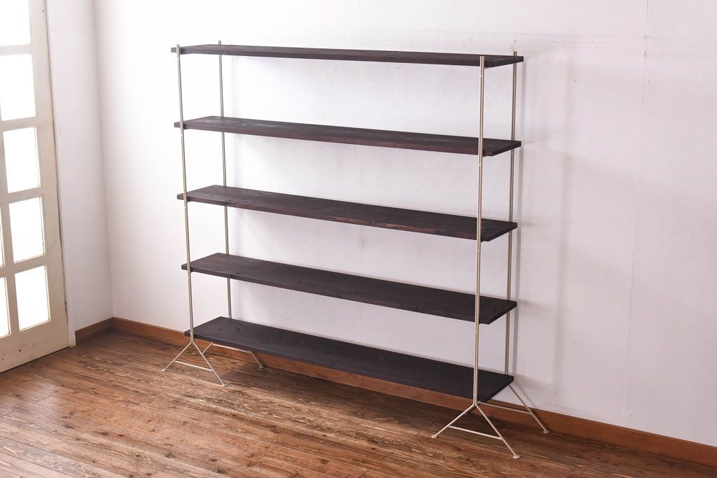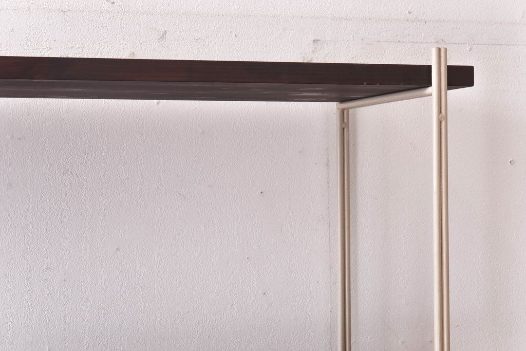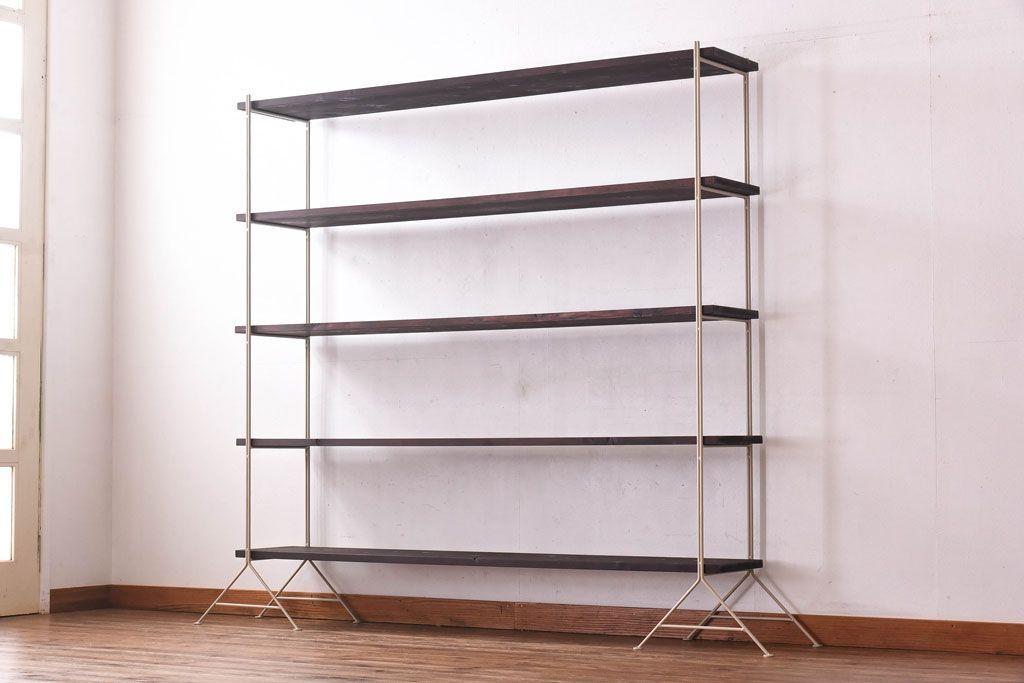 - 装飾がなく、直線的でシンプルな仕様です。アイアンフレームを細身のものにすることで、存在感が強すぎず、空間に溶け込みやすい仕上がりになっています。収納力のある大きなサイズですが、たくさんの小物や品物を置いてもすっきり見えるように工夫を凝らした、当店こだわりのデザインです。