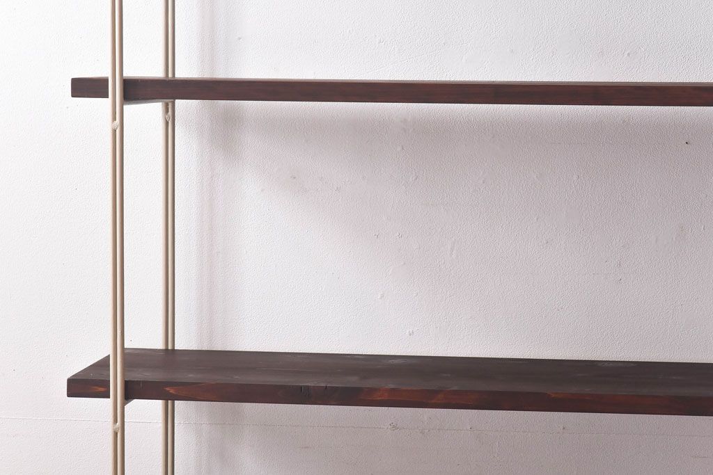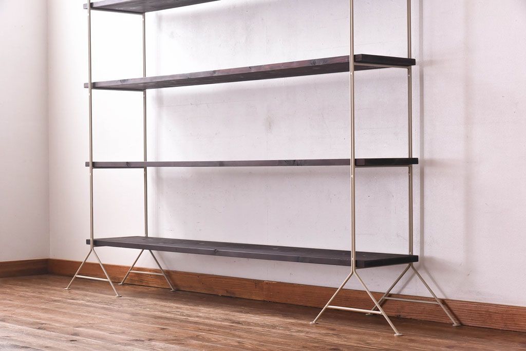 ラフジュ工房オリジナルのペイントアイアンラックです。モカベージュのペイントを施すことによってアイアン素材の無骨さに温かみが加わり、格好良さと可愛さが両立しています。優しい色のアイアン部分と、シックな色の木製の棚板とのコントラストが魅力的で、モダンスタイルやインダストリアルなど、幅広いスタイルの空間に馴染むデザインになっています。奥行きの浅い薄型タイプは圧迫感がないため、ラックとしてだけではなく間仕切りとしてもお使いいただけます。デザイン面、機能面のどちらから見てもとても取り入れやすいお品です。ご自宅だけではなく、店舗の陳列棚としてもいかがでしょうか。
