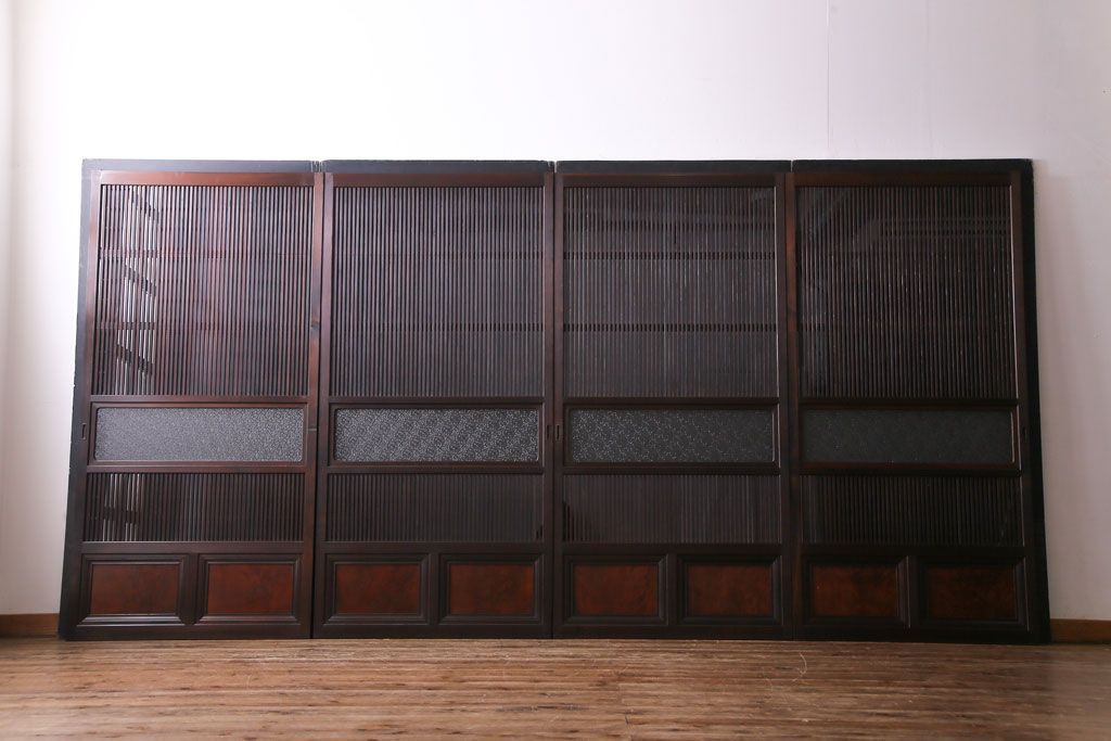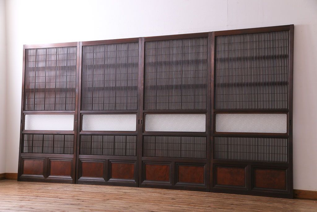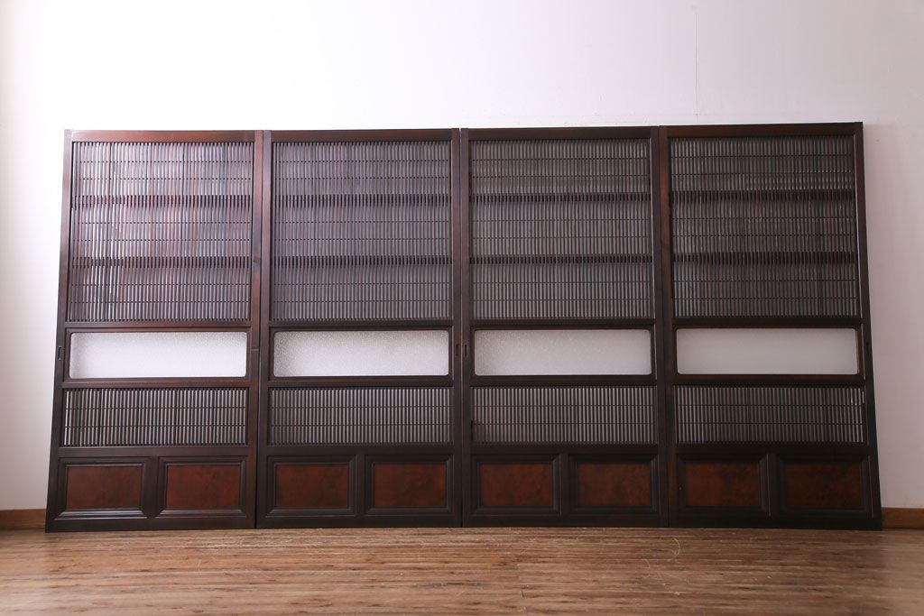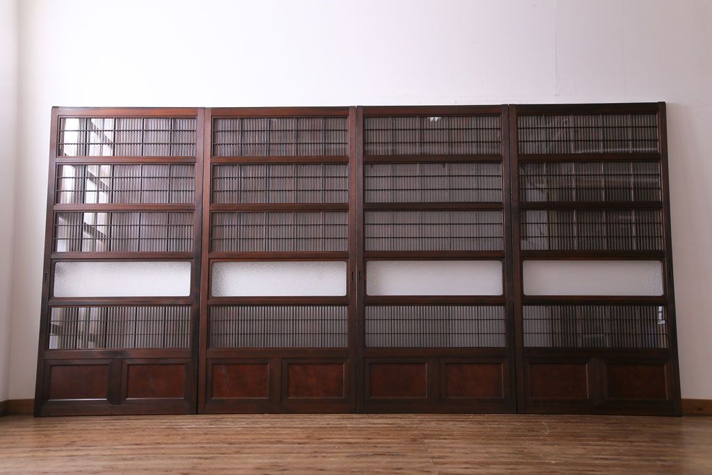 ドア・建具> 4枚〜セット > 昭和期 板ガラス裏障子留め ケヤキ材の腰板が目を惹くガラス入り格子戸(ガラス帯戸、仕切り戸、引き戸、建具)4枚組