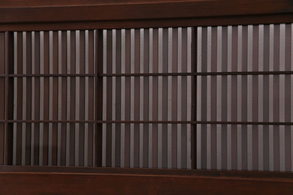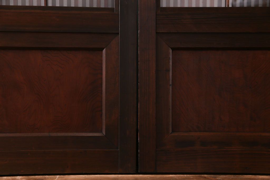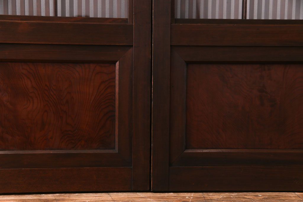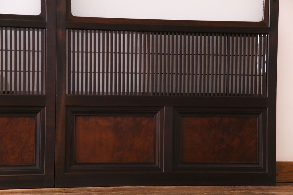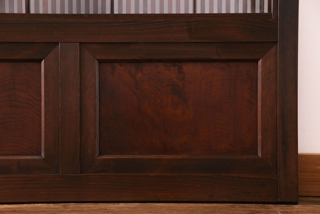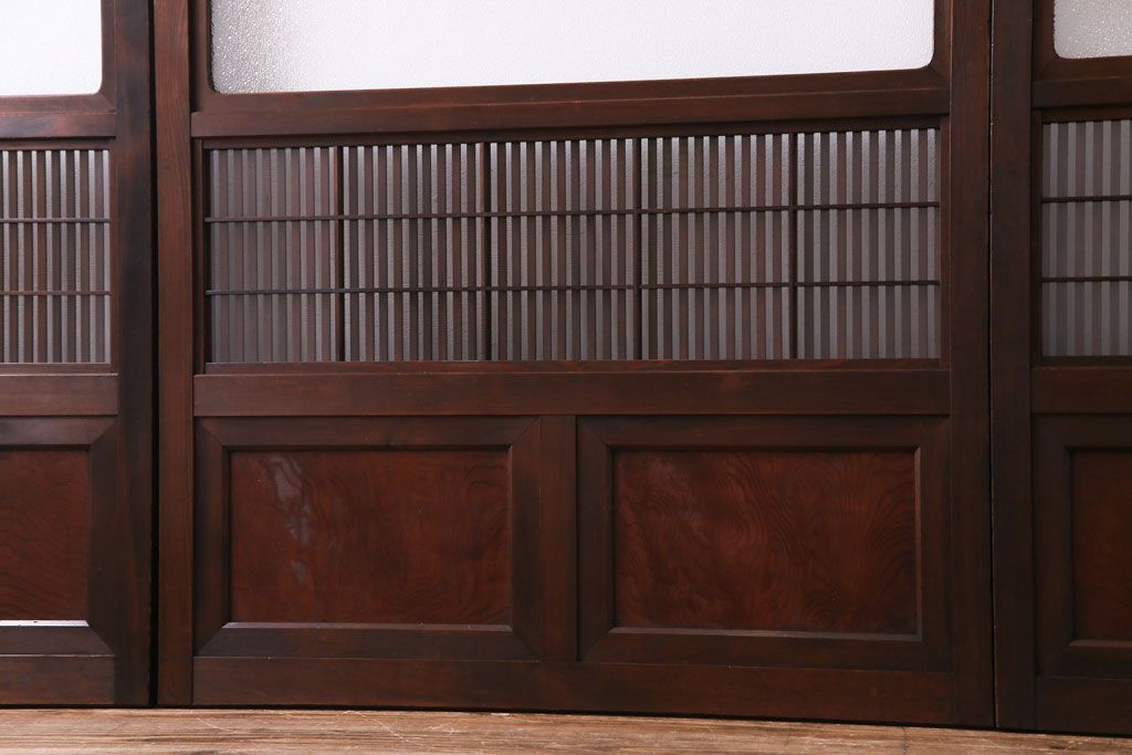 ドア・建具> 引き戸 > 昭和期 板ガラス裏障子留め ケヤキ材の腰板が目を惹くガラス入り格子戸(ガラス帯戸、仕切り戸、引き戸、建具)4枚組