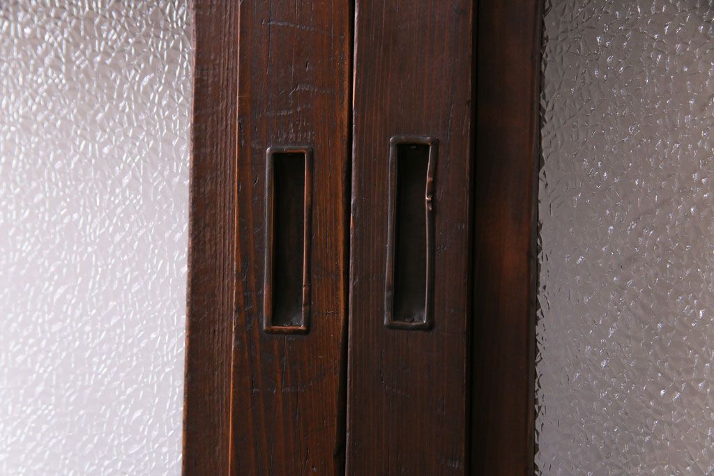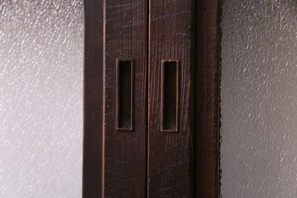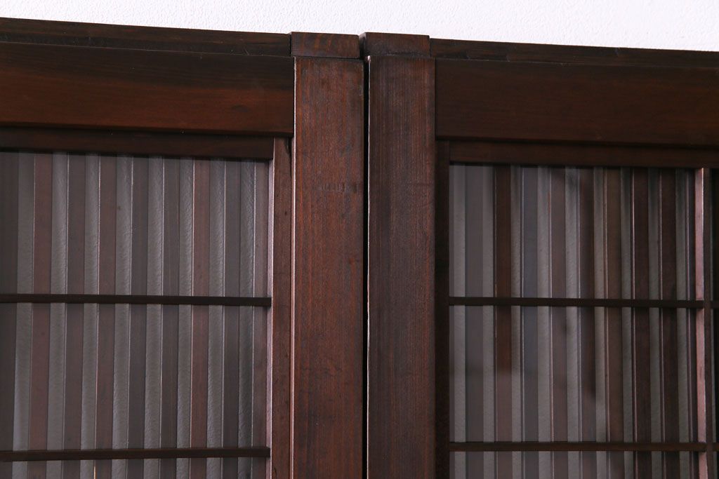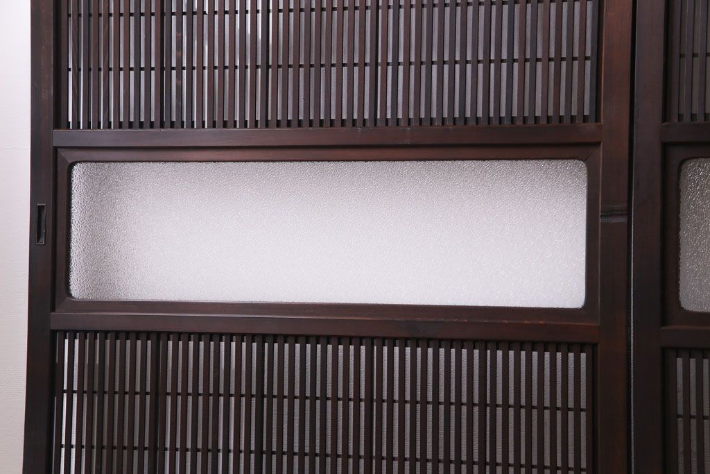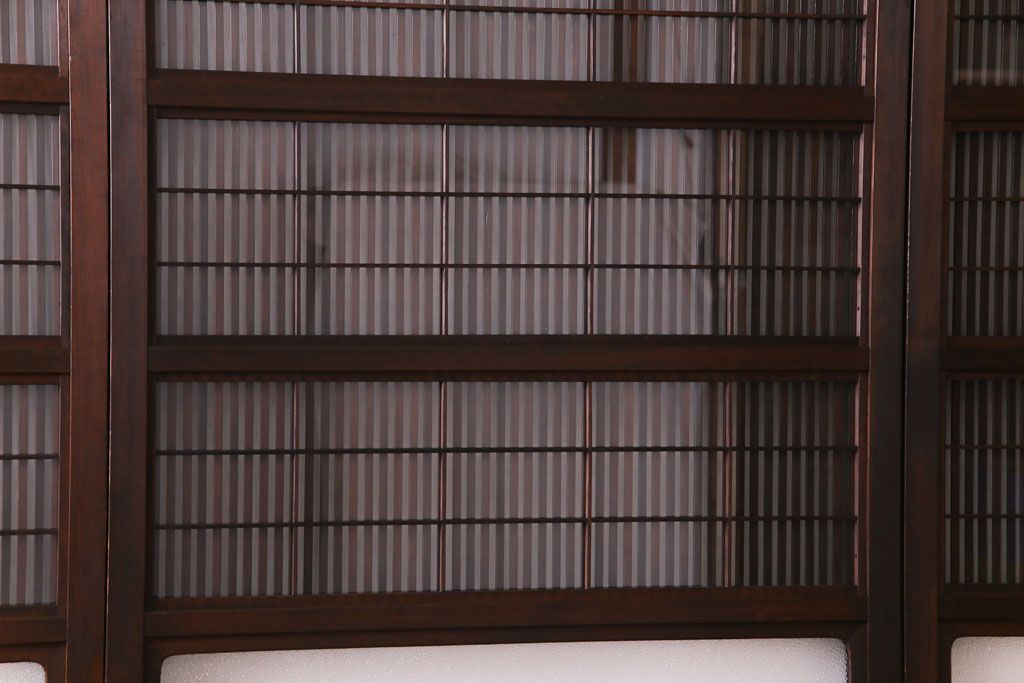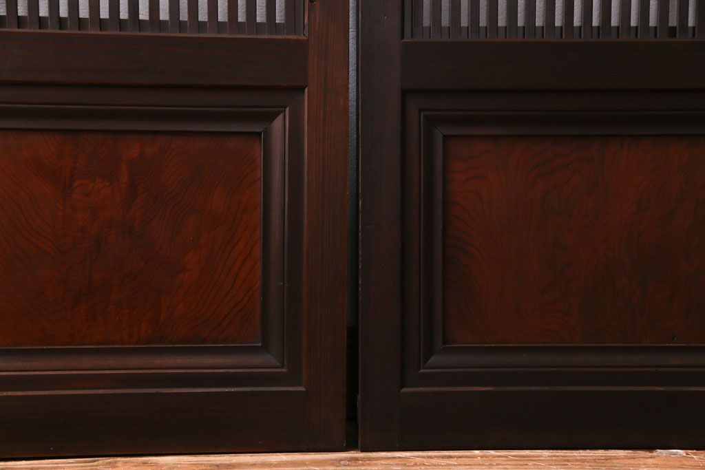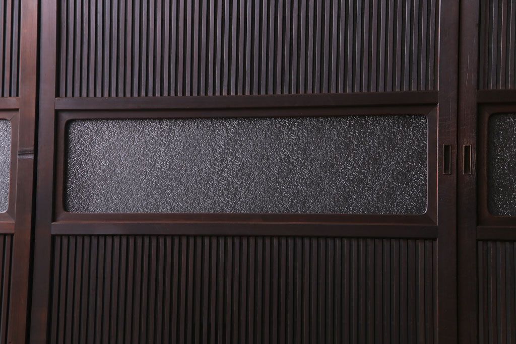 ドア・建具> 引き戸 > 昭和期 板ガラス裏障子留め ケヤキ材の腰板が目を惹くガラス入り格子戸(ガラス帯戸、仕切り戸、引き戸、建具)4枚組
