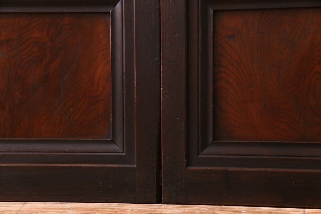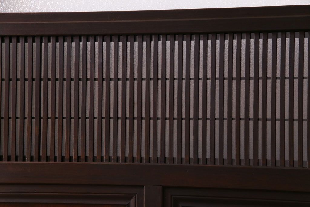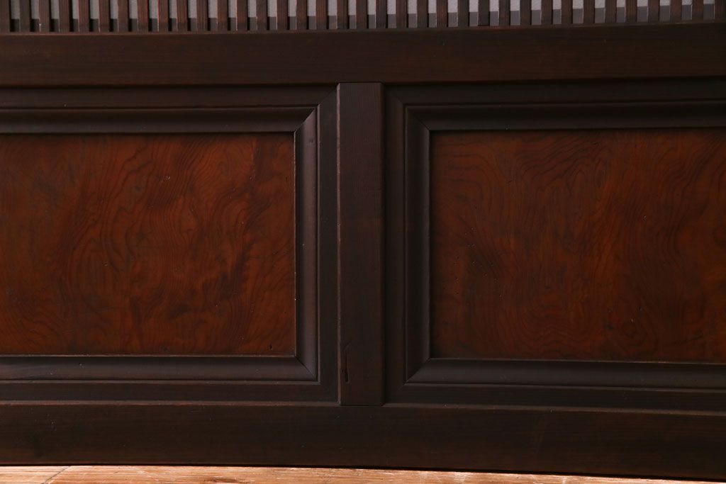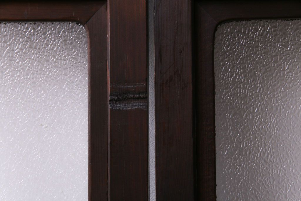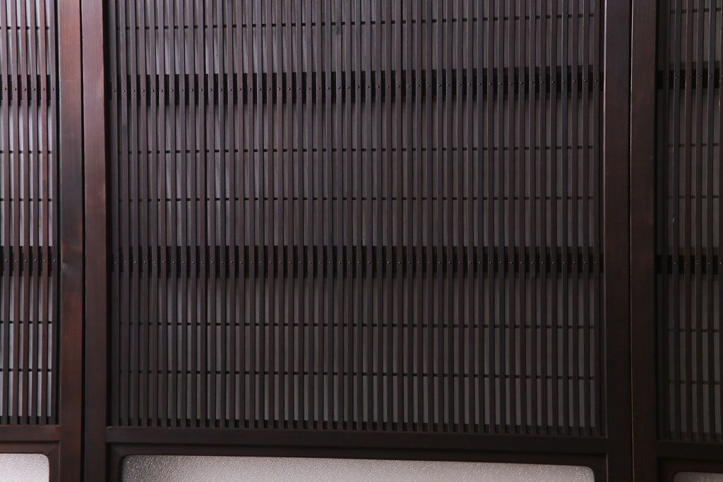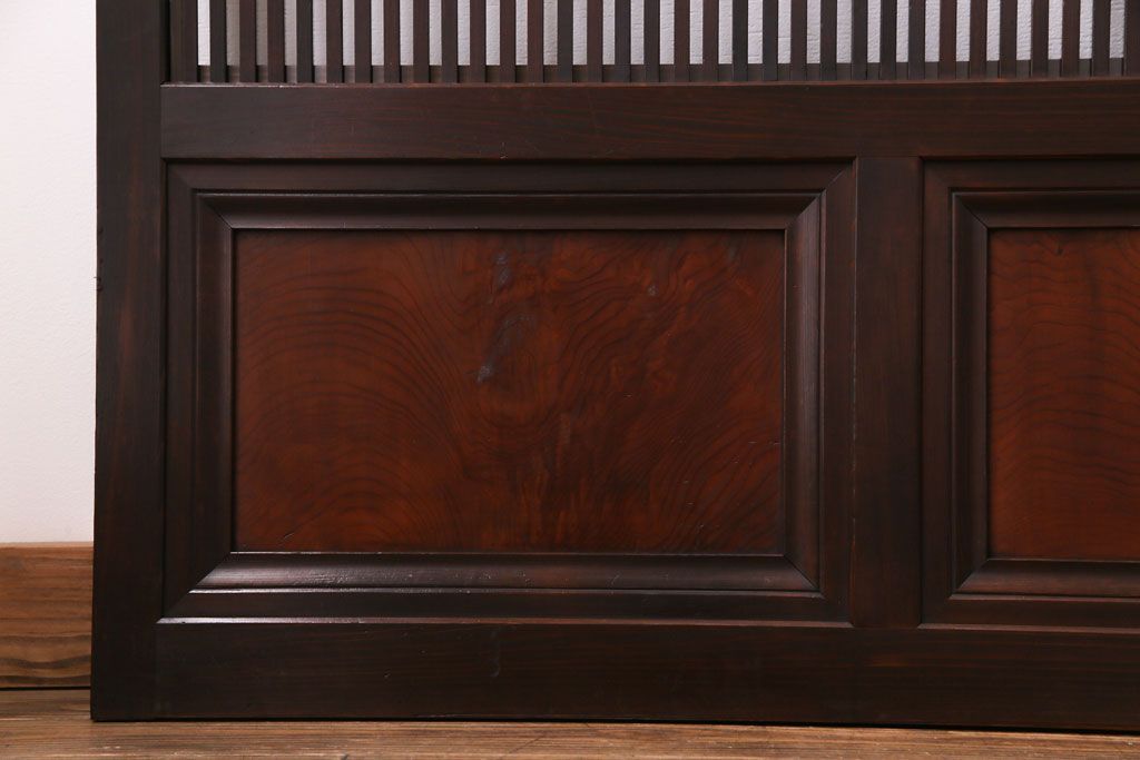 ドア・建具> 引き戸 > 昭和期 板ガラス裏障子留め ケヤキ材の腰板が目を惹くガラス入り格子戸(ガラス帯戸、仕切り戸、引き戸、建具)4枚組