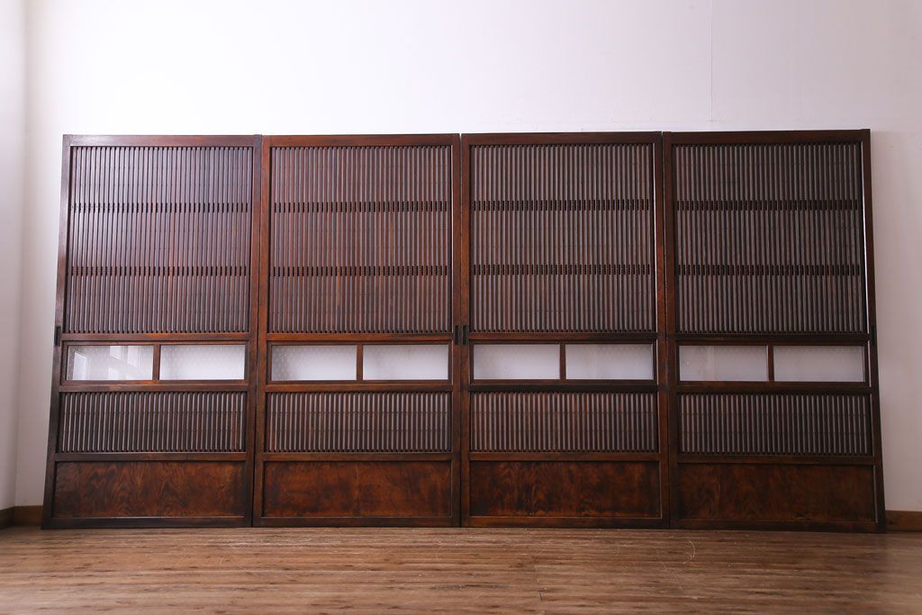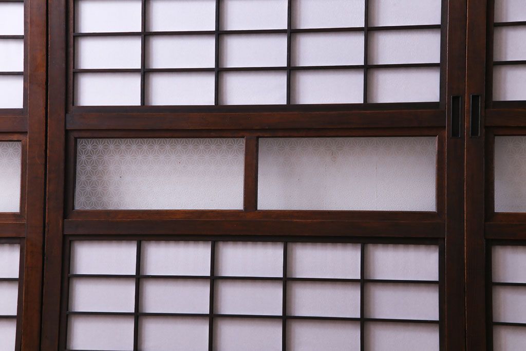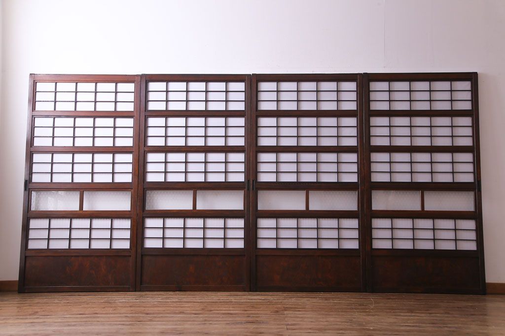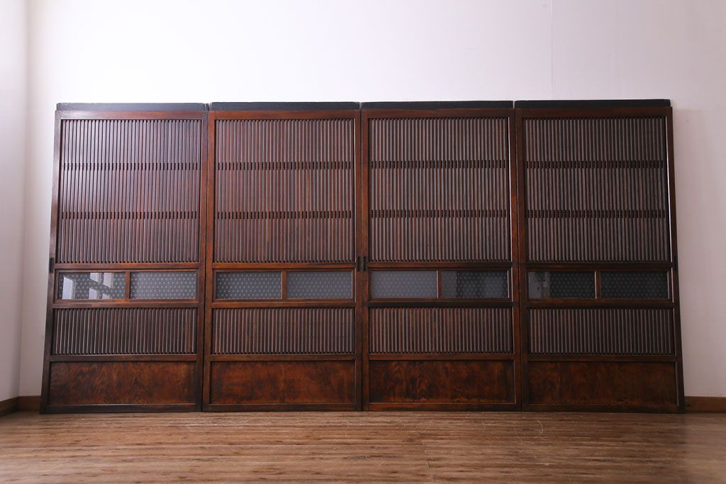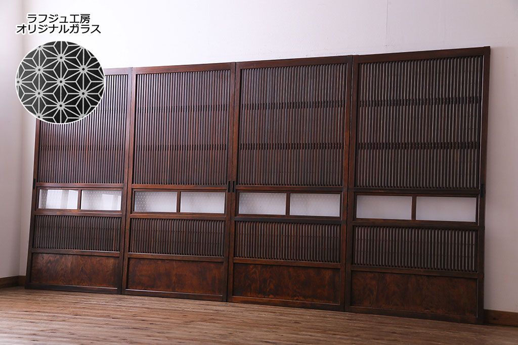 和製アンティーク 裏障子付き 花ガラスが上品な格子戸(ガラス帯戸、引き戸)4枚セット
