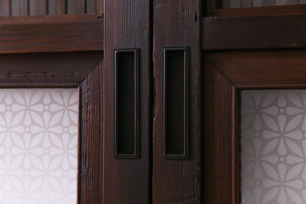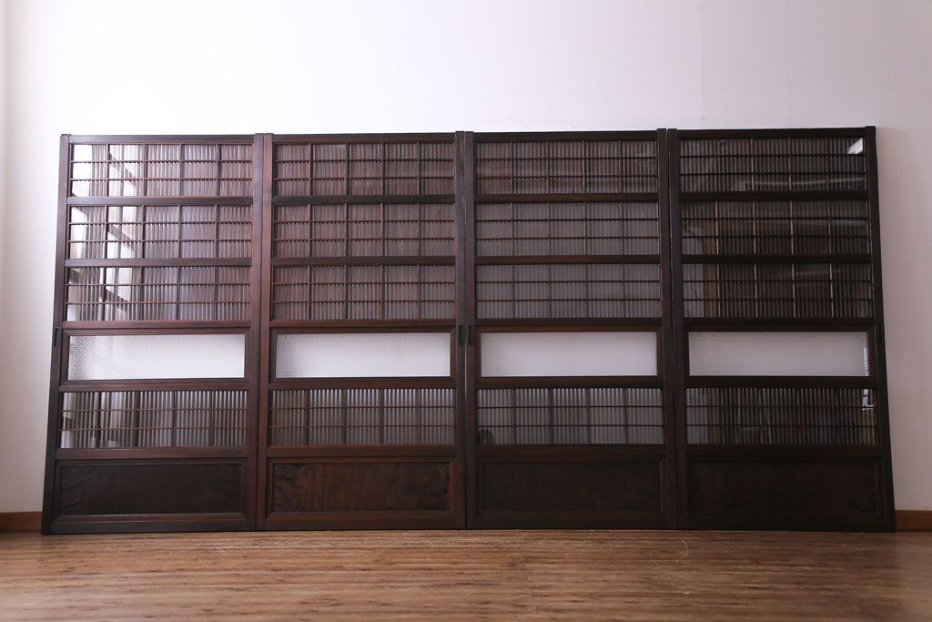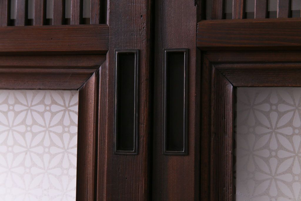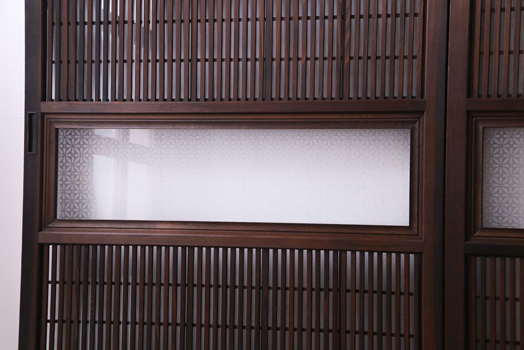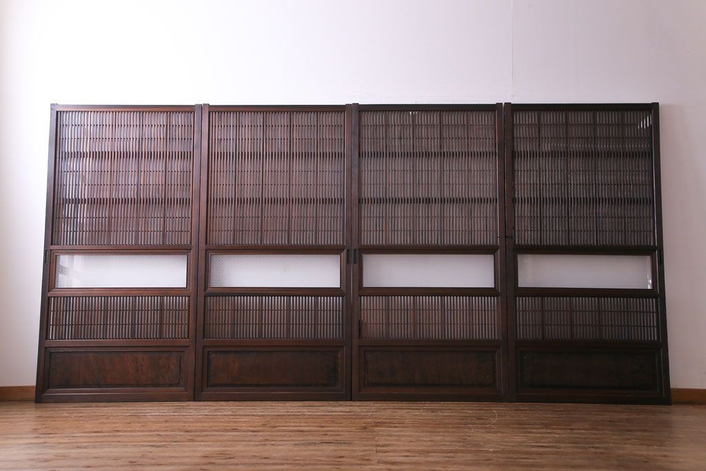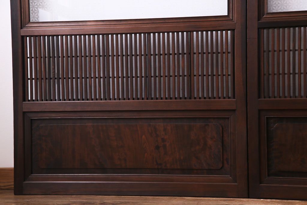 和製アンティーク 板ガラス裏障子留め 凝った作りの腰板が魅力の花ガラス入り格子戸(ガラス帯戸、仕切り戸、引き戸、建具)4枚組です。