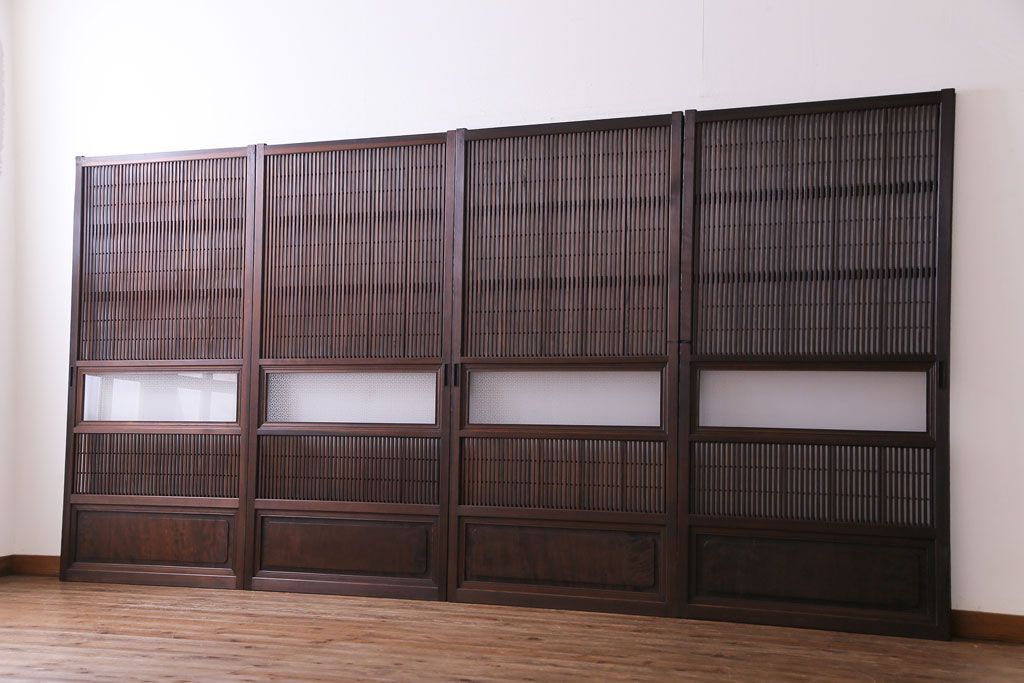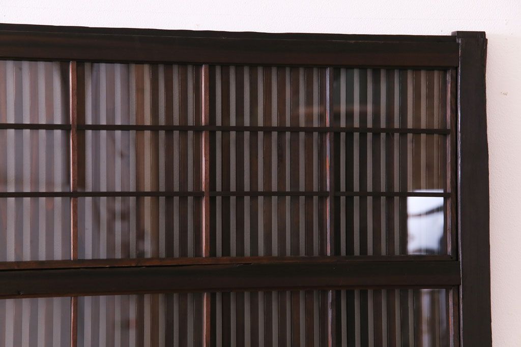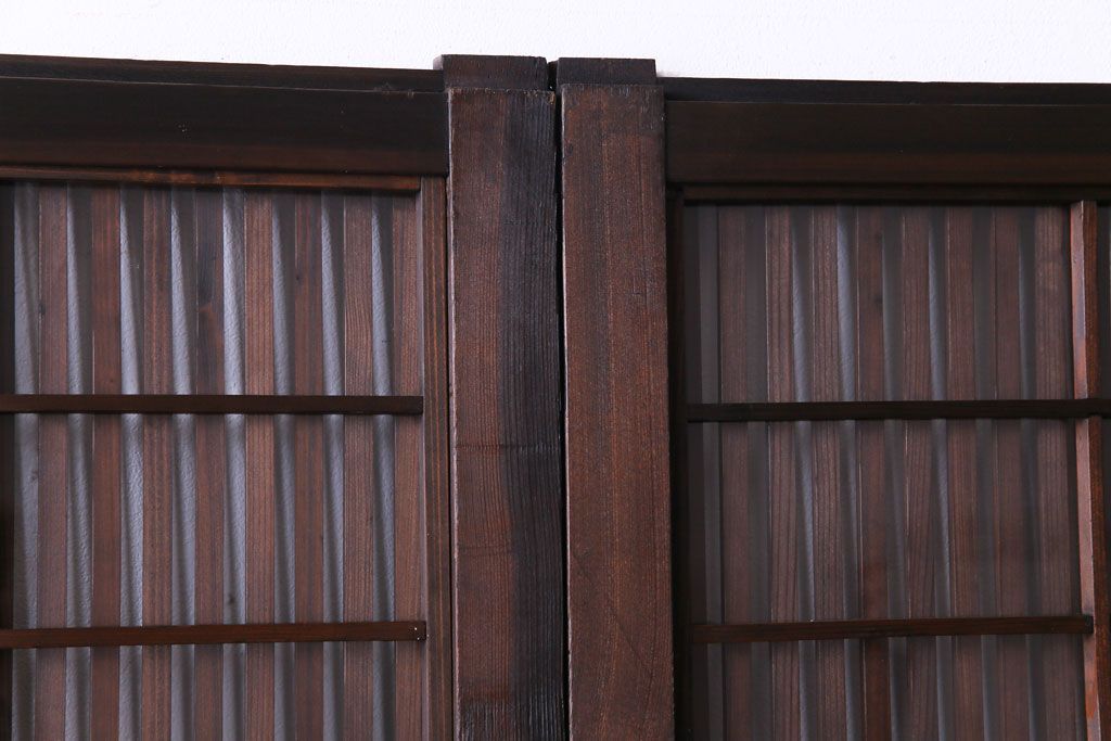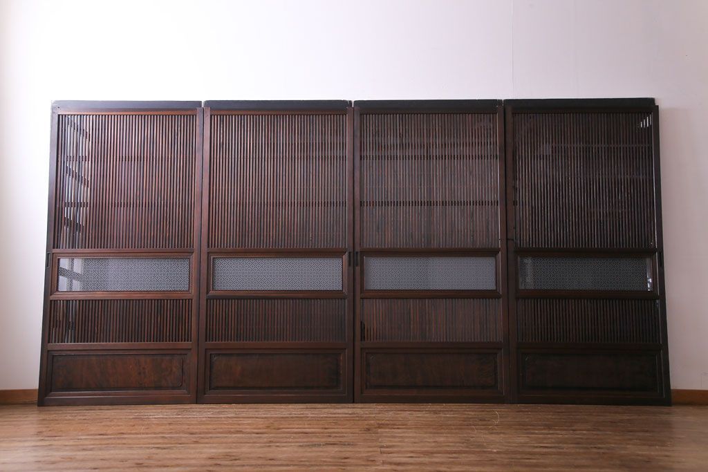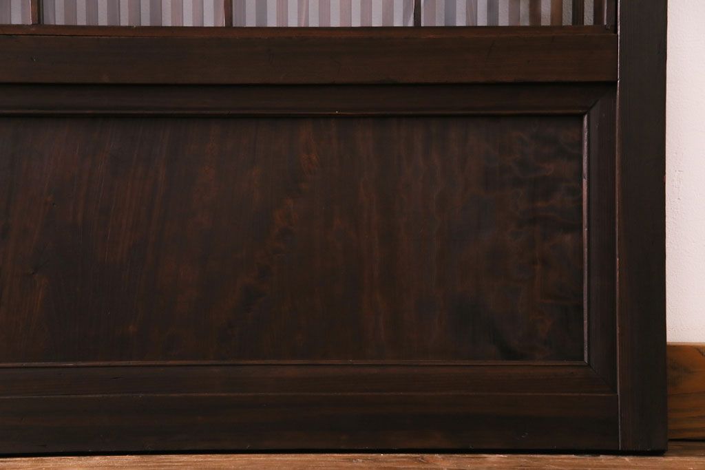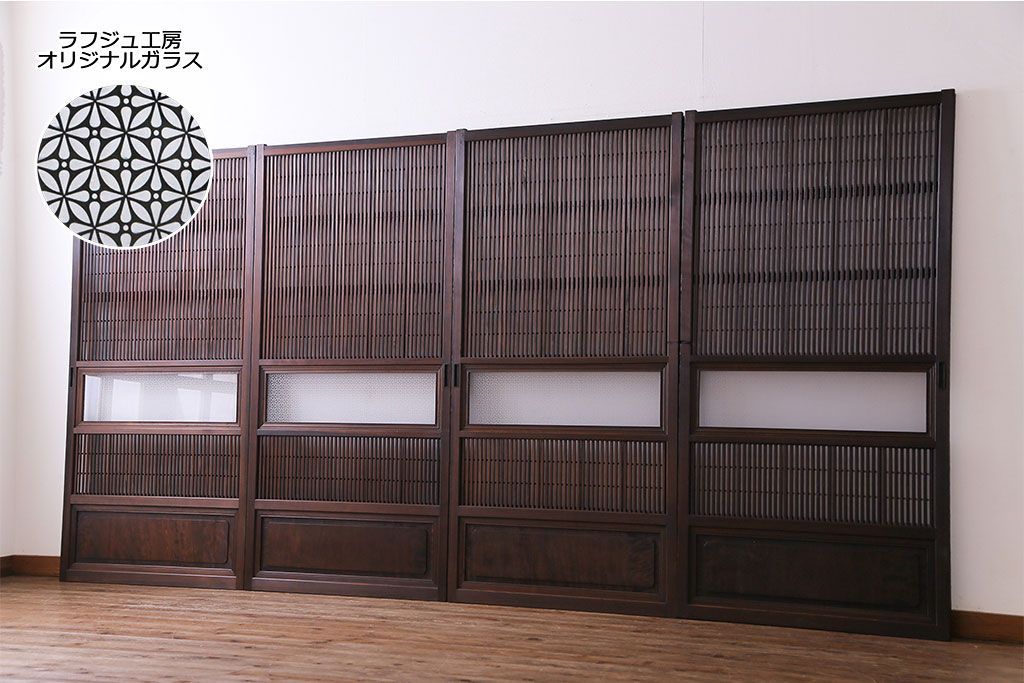 和製アンティーク 板ガラス裏障子留め 凝った作りの腰板が魅力の花ガラス入り格子戸(ガラス帯戸、仕切り戸、引き戸、建具)4枚組です。