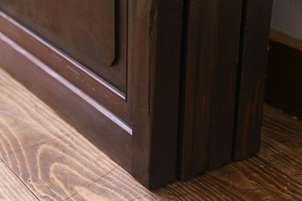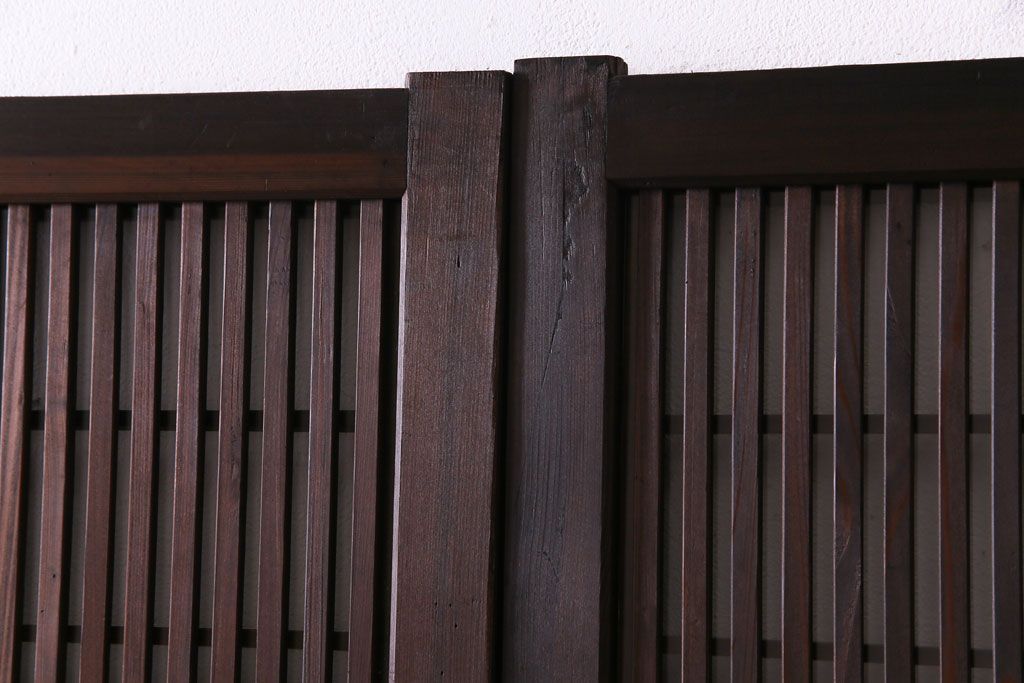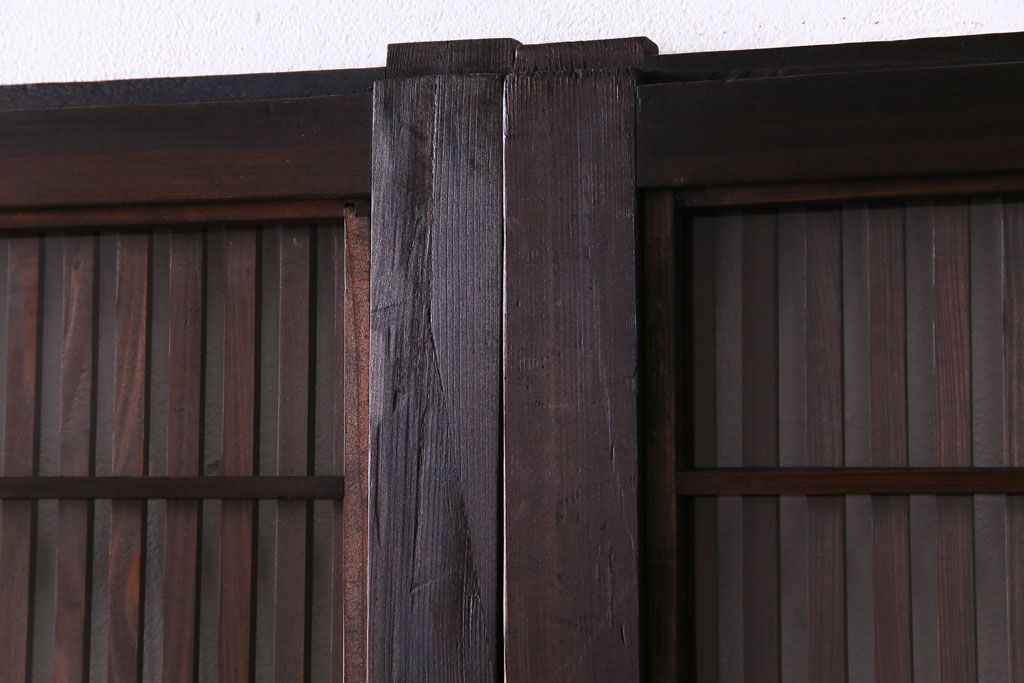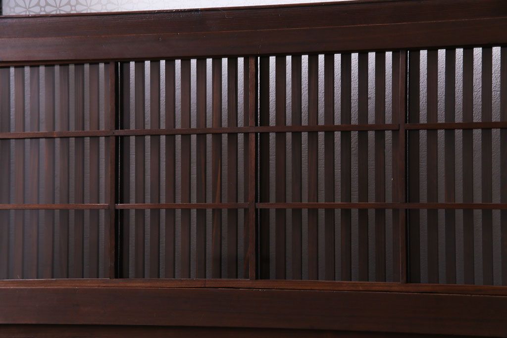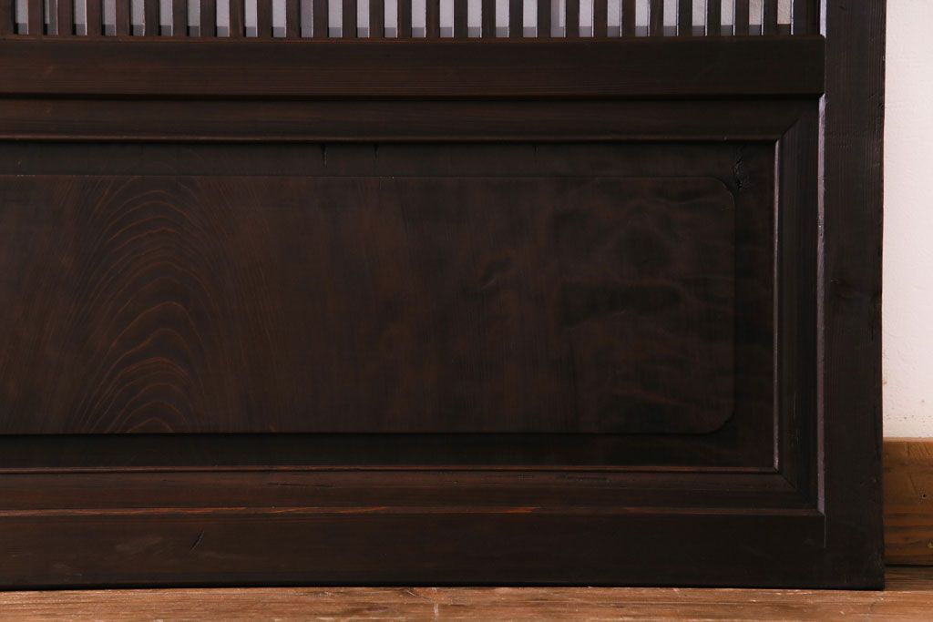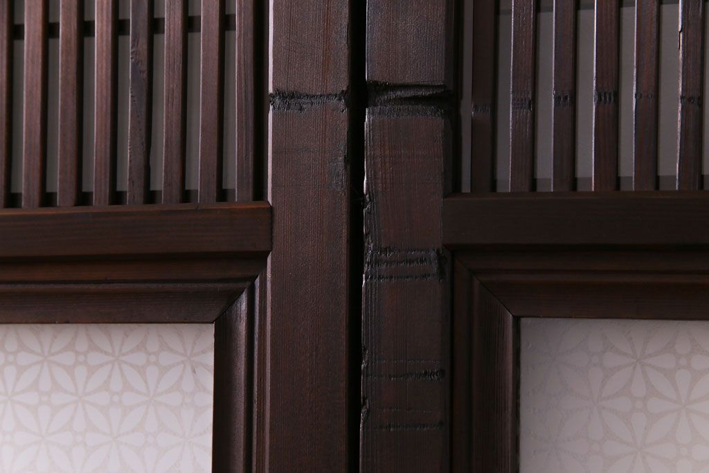 和製アンティーク 板ガラス裏障子留め 凝った作りの腰板が魅力の花ガラス入り格子戸(ガラス帯戸、仕切り戸、引き戸、建具)4枚組です。