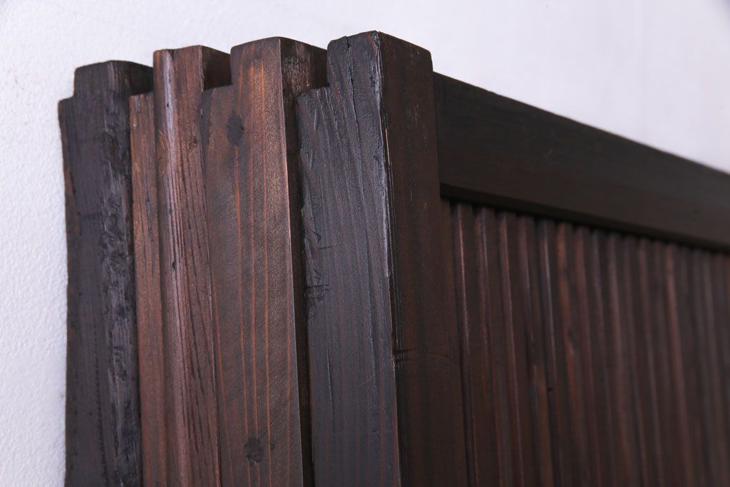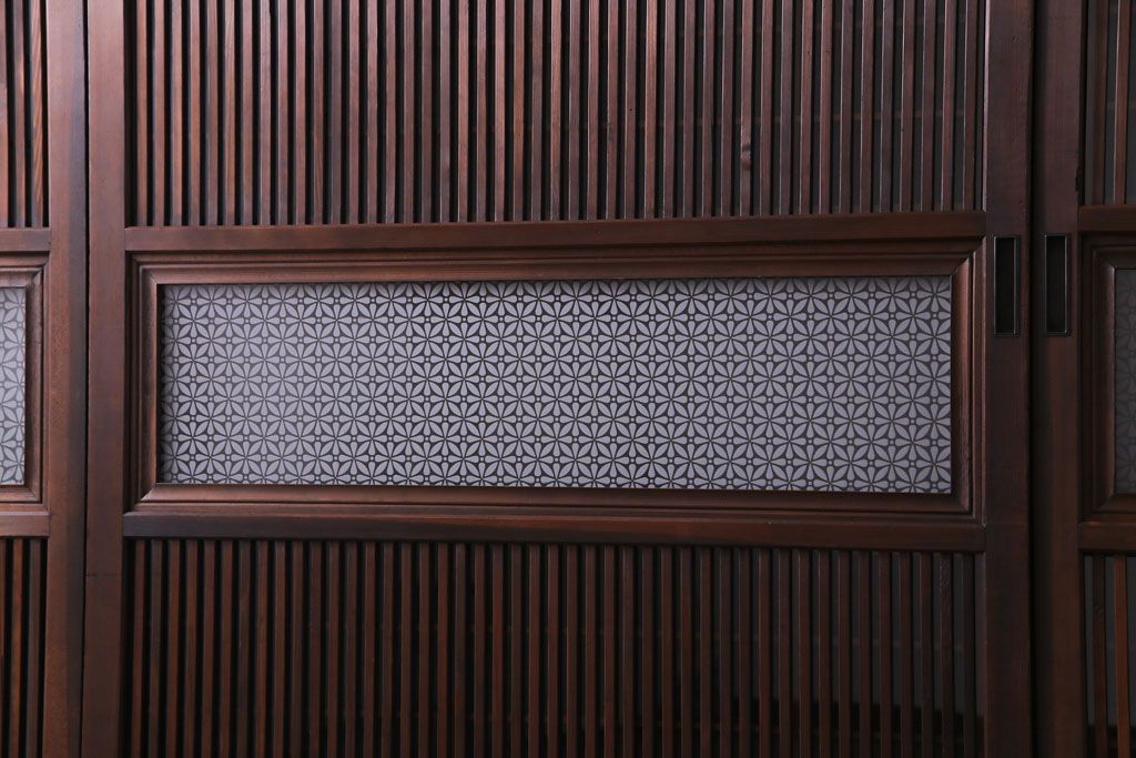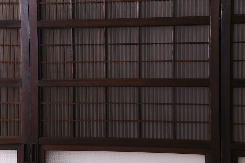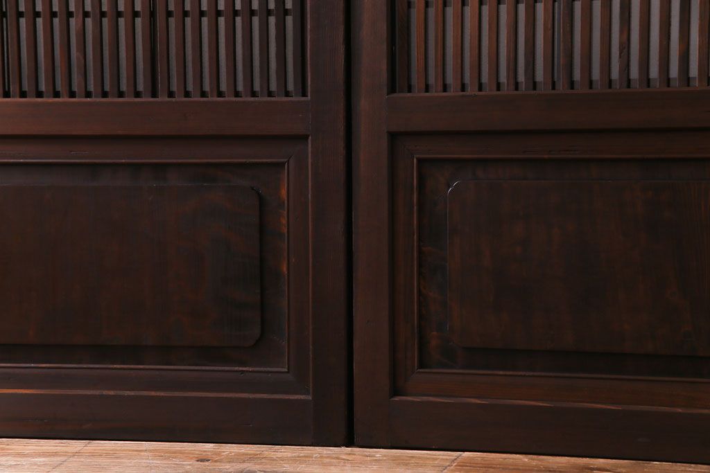 ドア・建具> 引き戸 > 和製アンティーク 板ガラス裏障子留め 凝った作りの腰板が魅力の花ガラス入り格子戸(ガラス帯戸、仕切り戸、引き戸、建具)4枚組