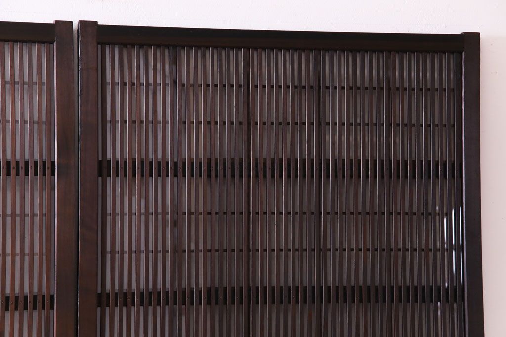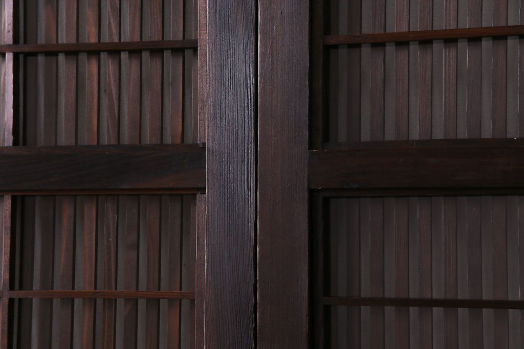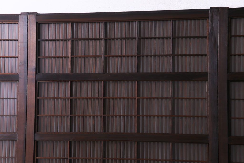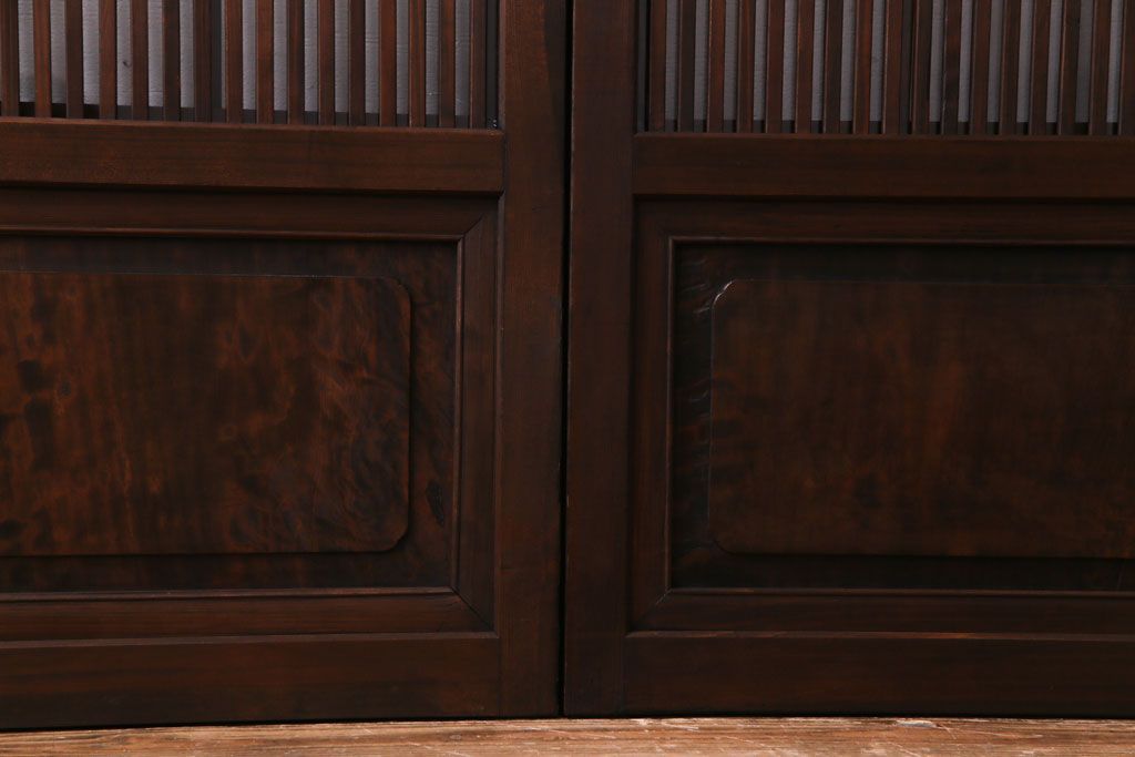ドア・建具> 格子戸 > 和製アンティーク 板ガラス裏障子留め 凝った作りの腰板が魅力の花ガラス入り格子戸(ガラス帯戸、仕切り戸、引き戸、建具)4枚組