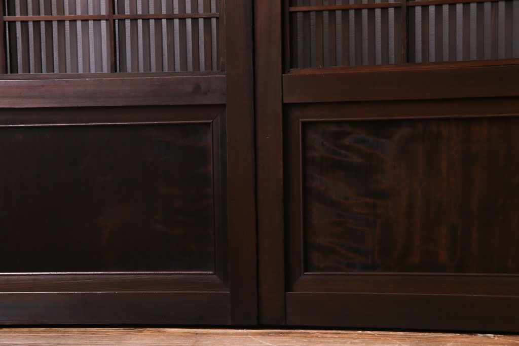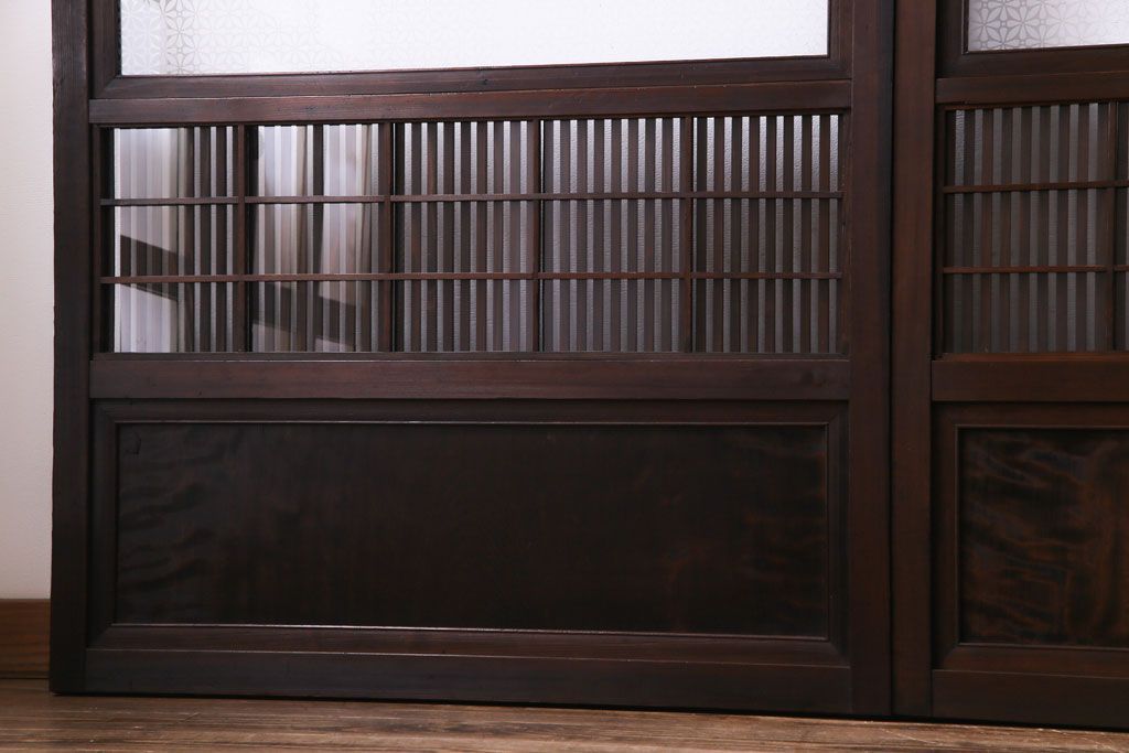 和製アンティーク 板ガラス裏障子留め 凝った作りの腰板が魅力の花ガラス入り格子戸(ガラス帯戸、仕切り戸、引き戸、建具)4枚組