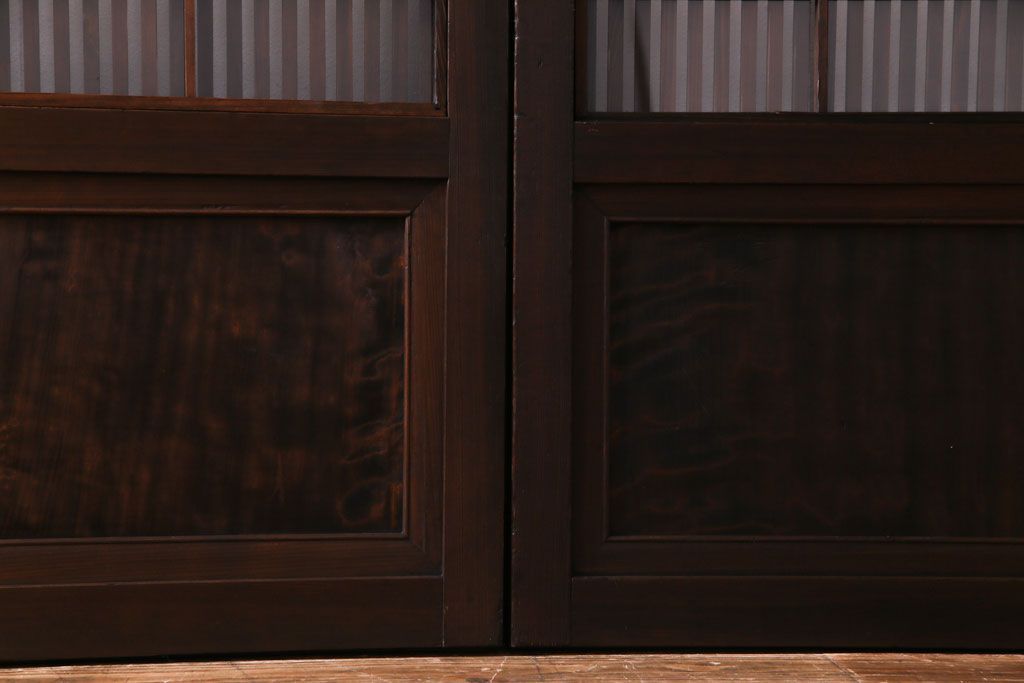 ドア・建具> 4枚〜セット > 和製アンティーク 板ガラス裏障子留め 凝った作りの腰板が魅力の花ガラス入り格子戸(ガラス帯戸、仕切り戸、引き戸、建具)4枚組