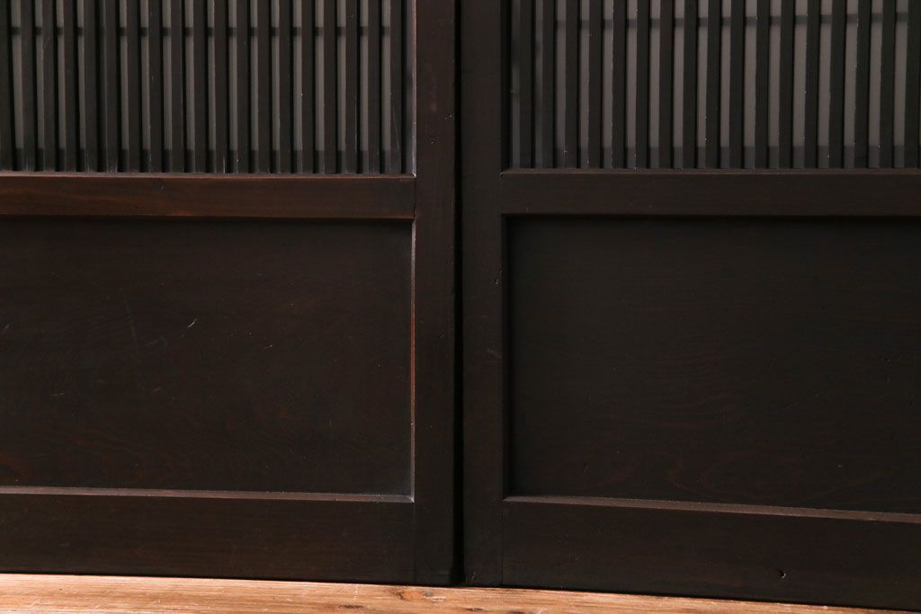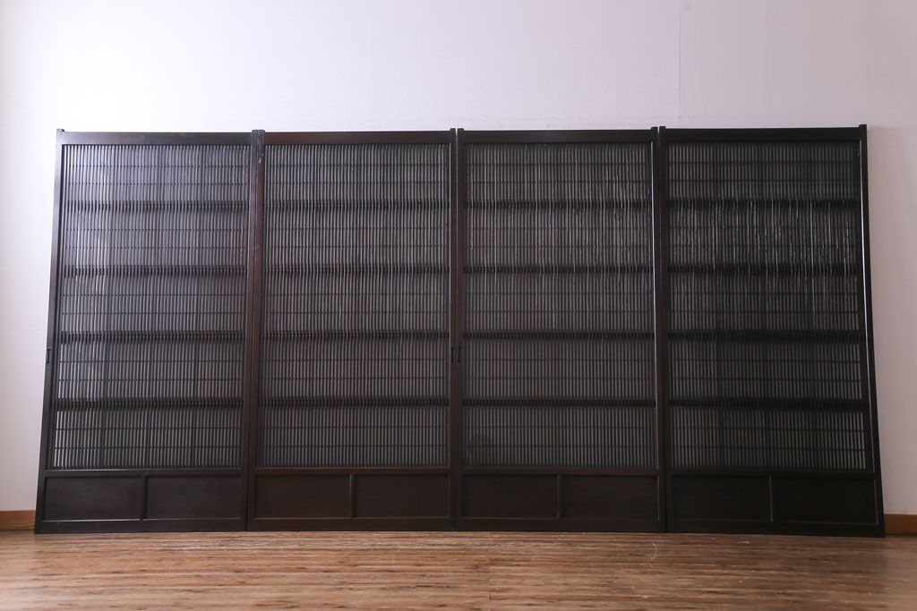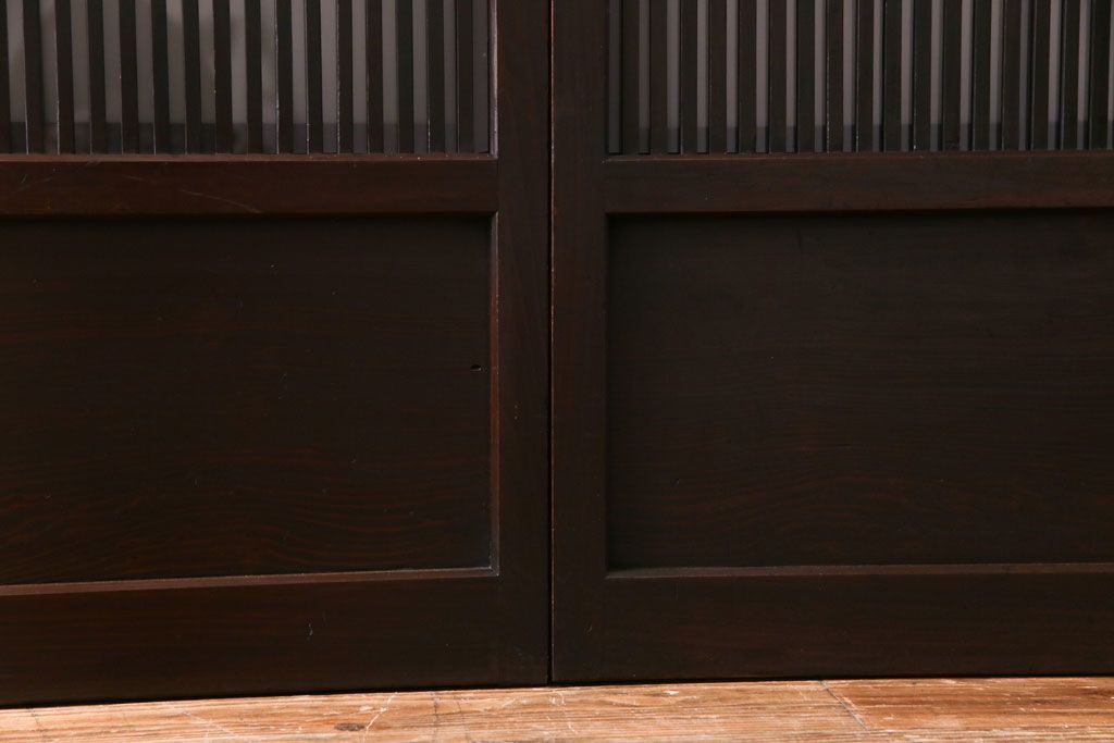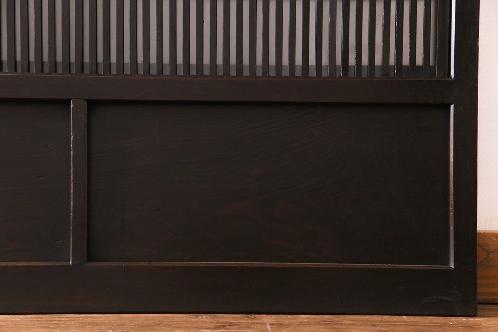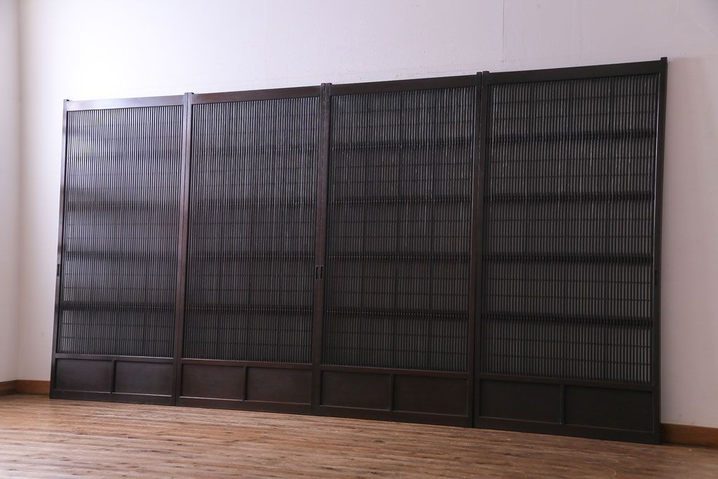 和製アンティーク 板ガラス裏障子留め 濃い色味の細い縦桟が和モダンの雰囲気を漂わせる格子戸(仕切り戸、引き戸、建具)4枚組