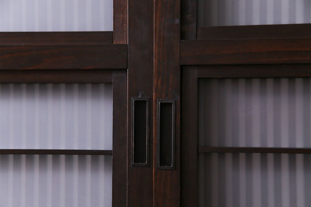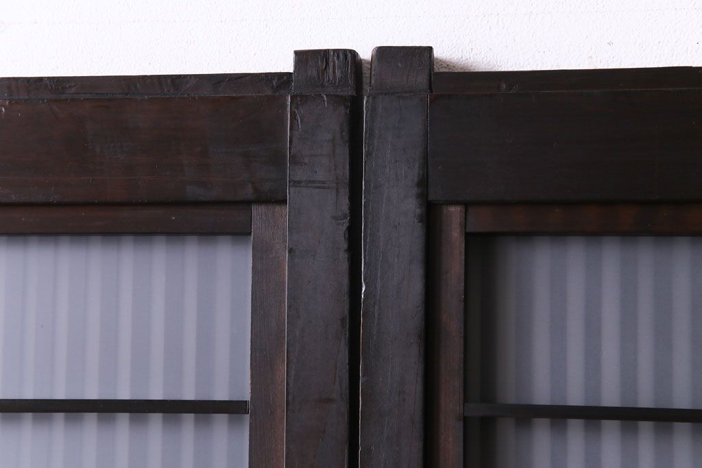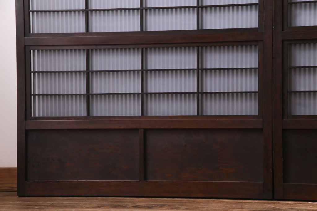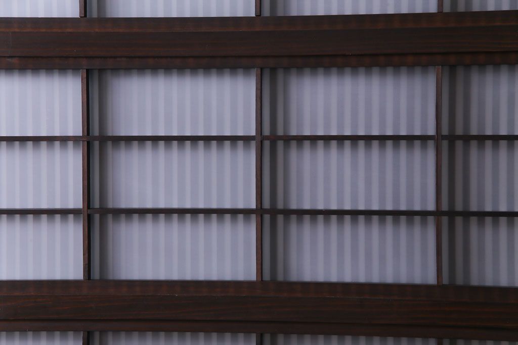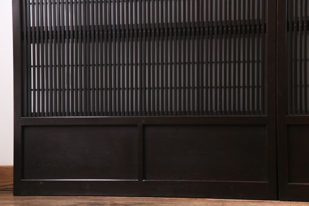 和製アンティーク 板ガラス裏障子留め 濃い色味の細い縦桟が和モダンの雰囲気を漂わせる格子戸(仕切り戸、引き戸、建具)4枚組