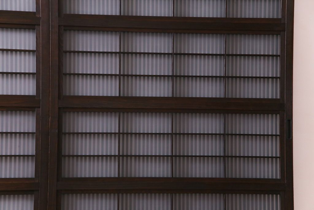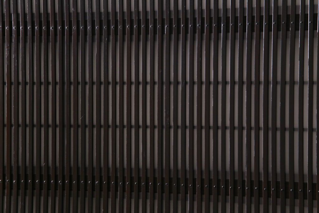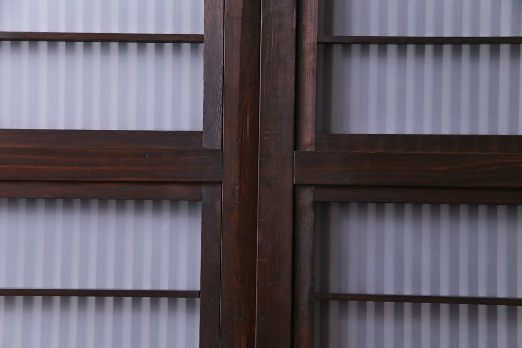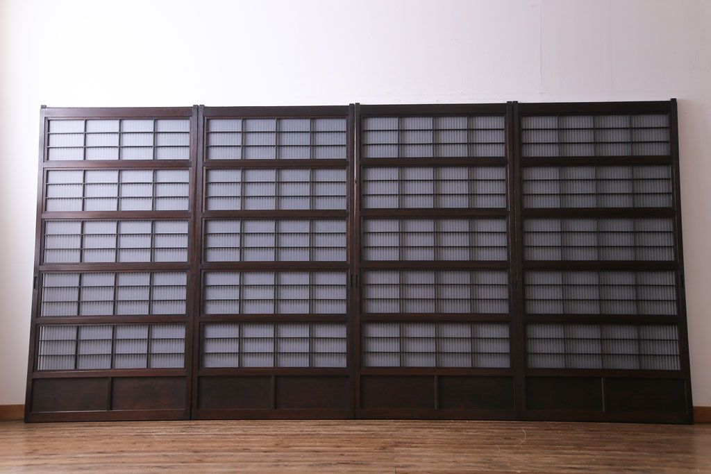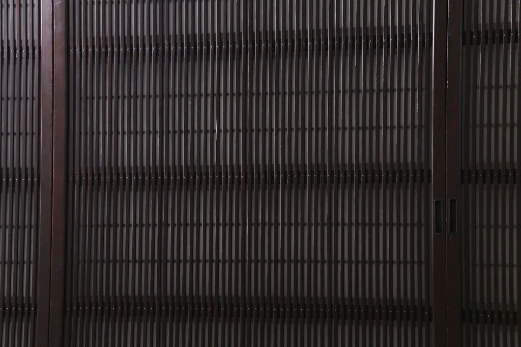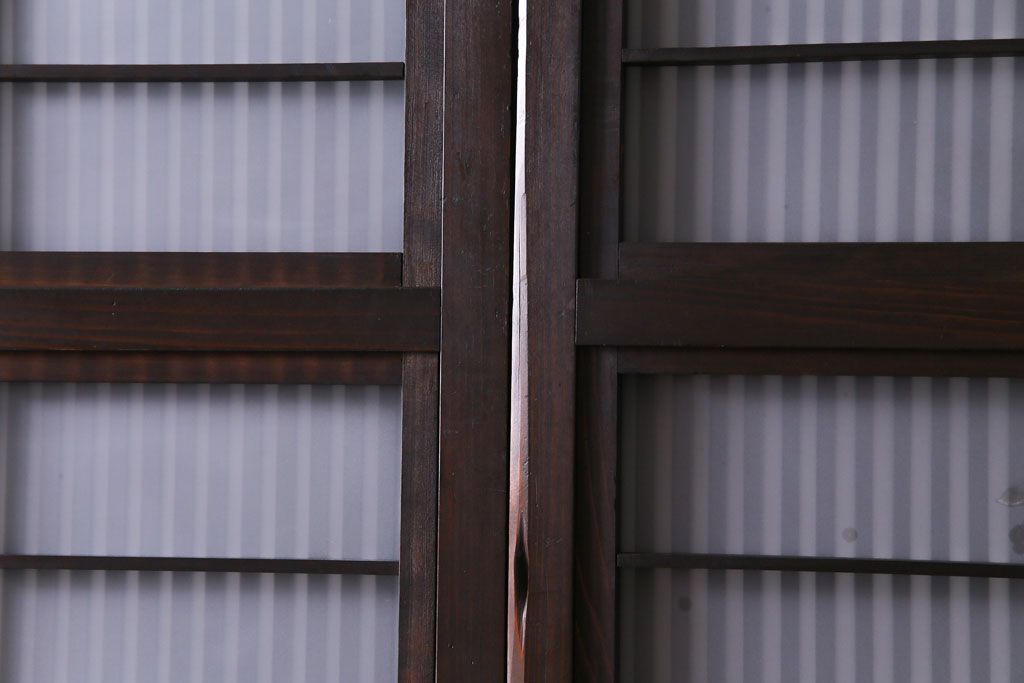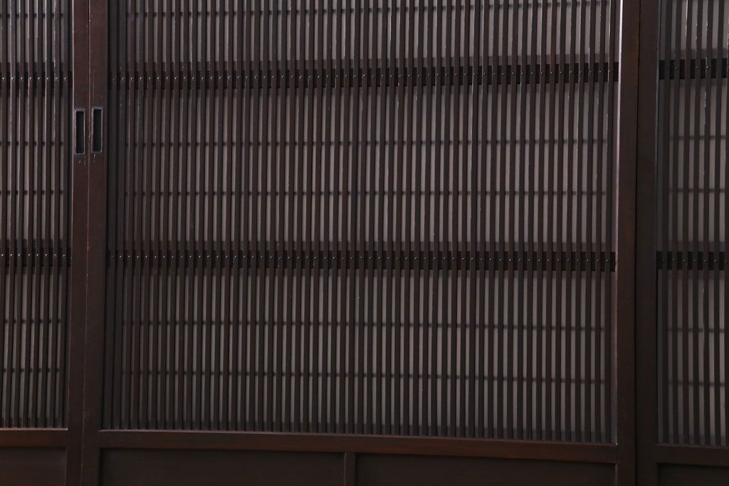 ドア・建具> 格子戸 > 和製アンティーク 板ガラス裏障子留め 濃い色味の細い縦桟が和モダンの雰囲気を漂わせる格子戸(仕切り戸、引き戸、建具)4枚組