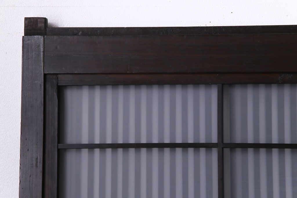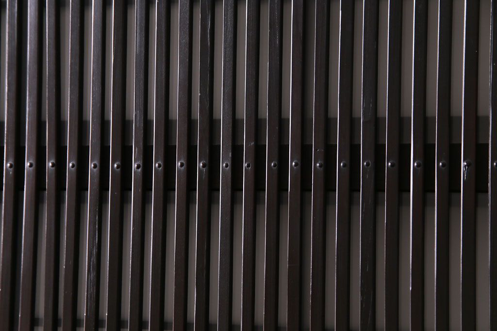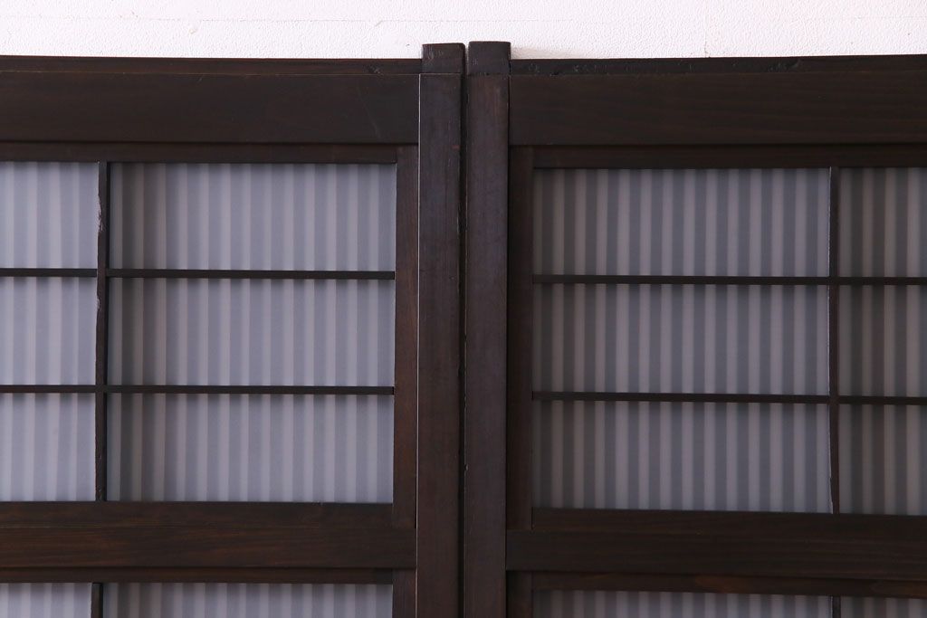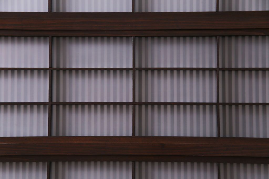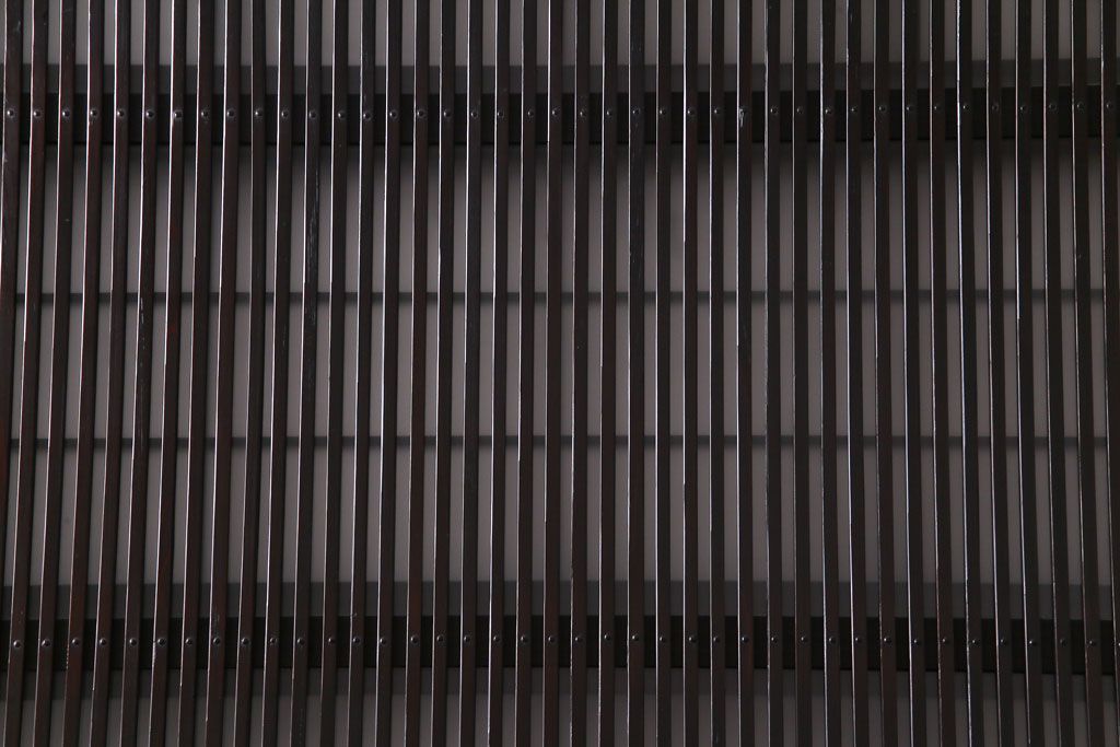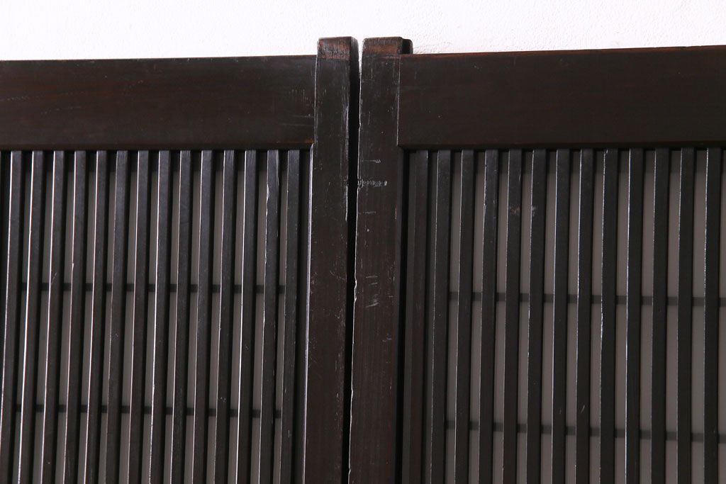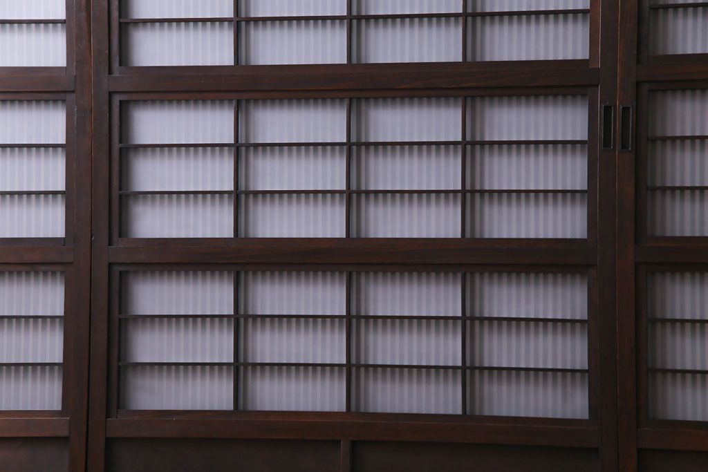 ドア・建具> 格子戸 > 和製アンティーク 板ガラス裏障子留め 濃い色味の細い縦桟が和モダンの雰囲気を漂わせる格子戸(仕切り戸、引き戸、建具)4枚組