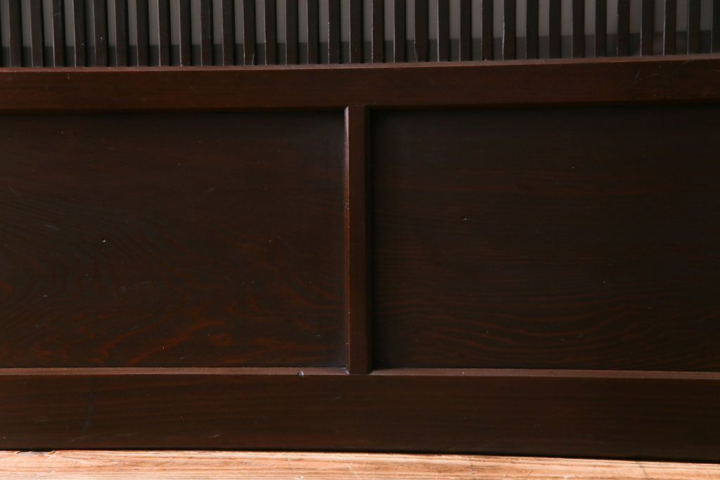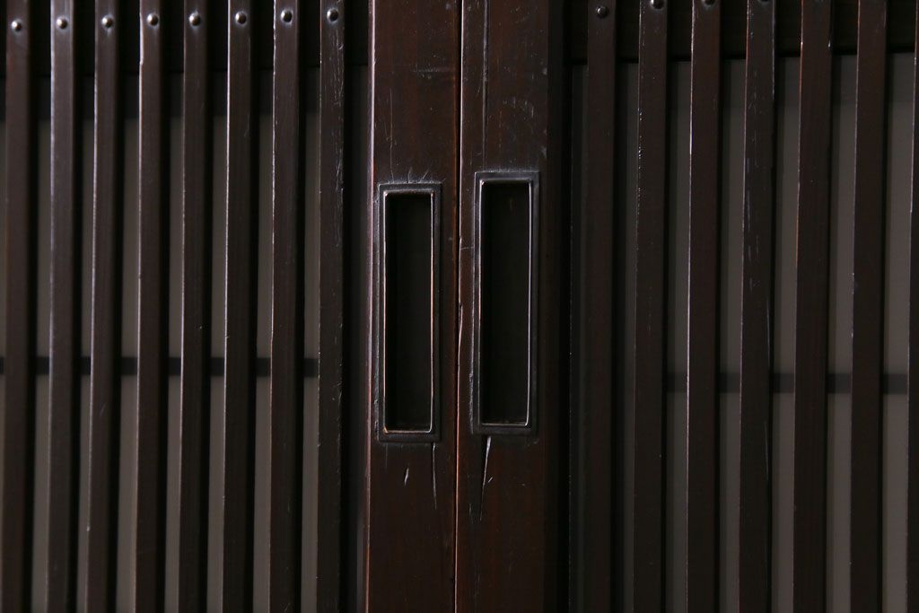 ドア・建具> 引き戸 > 和製アンティーク 板ガラス裏障子留め 濃い色味の細い縦桟が和モダンの雰囲気を漂わせる格子戸(仕切り戸、引き戸、建具)4枚組