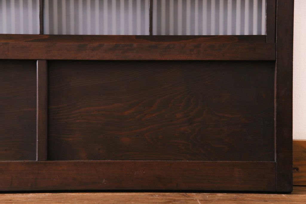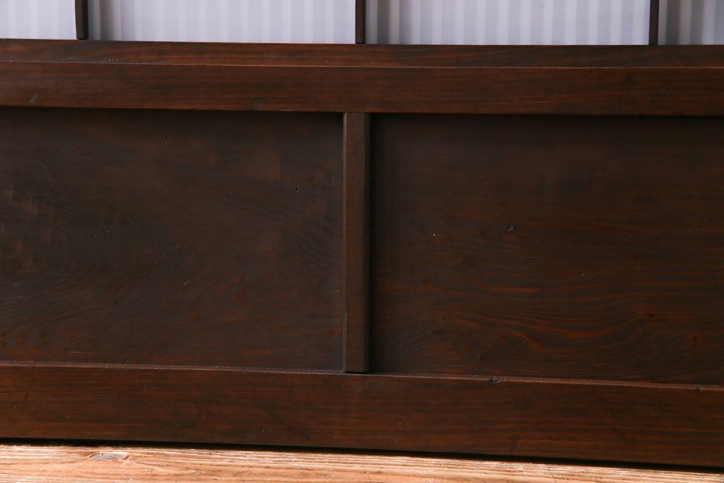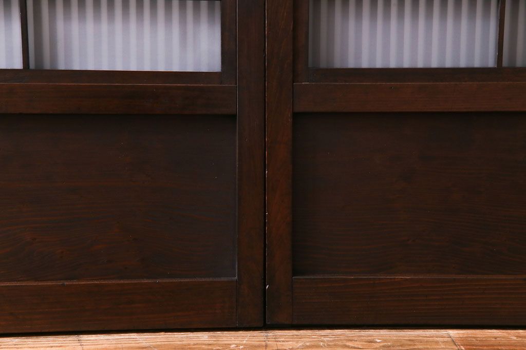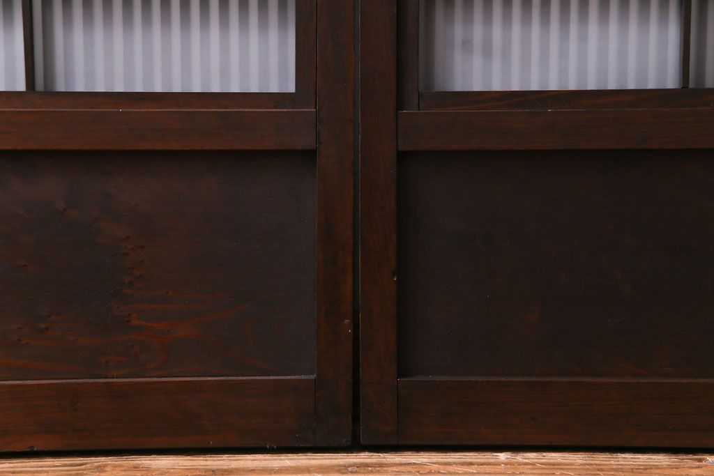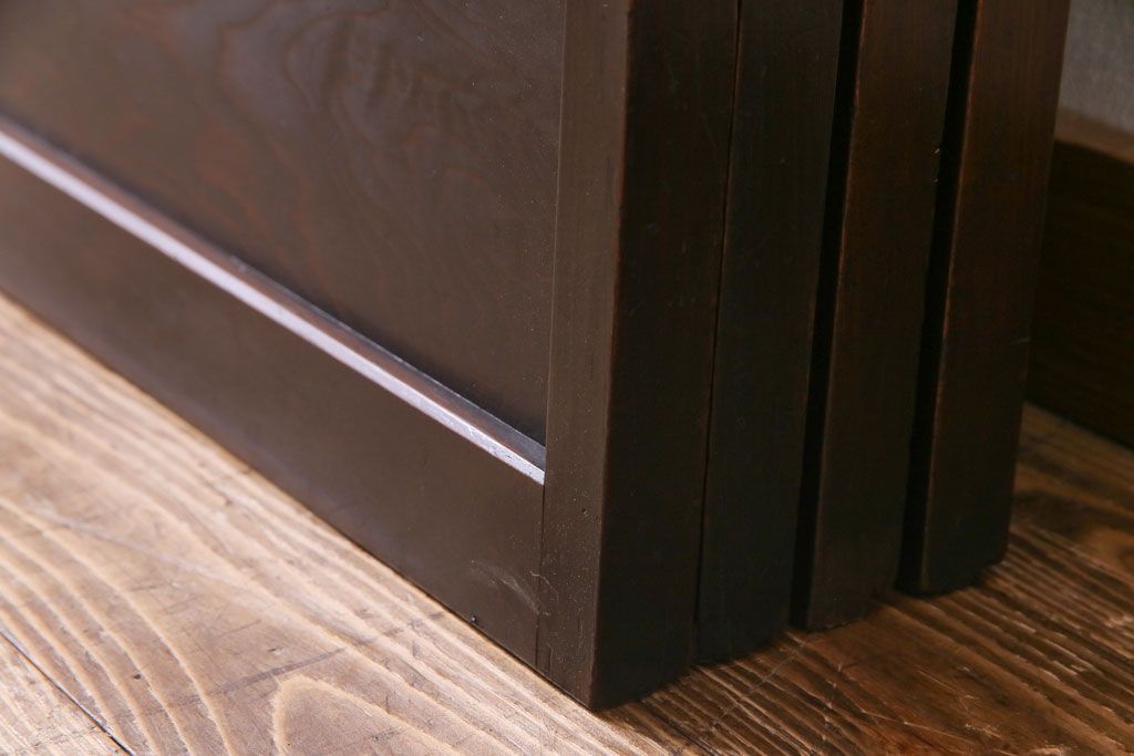ドア・建具> 4枚〜セット > 和製アンティーク 板ガラス裏障子留め 濃い色味の細い縦桟が和モダンの雰囲気を漂わせる格子戸(仕切り戸、引き戸、建具)4枚組
