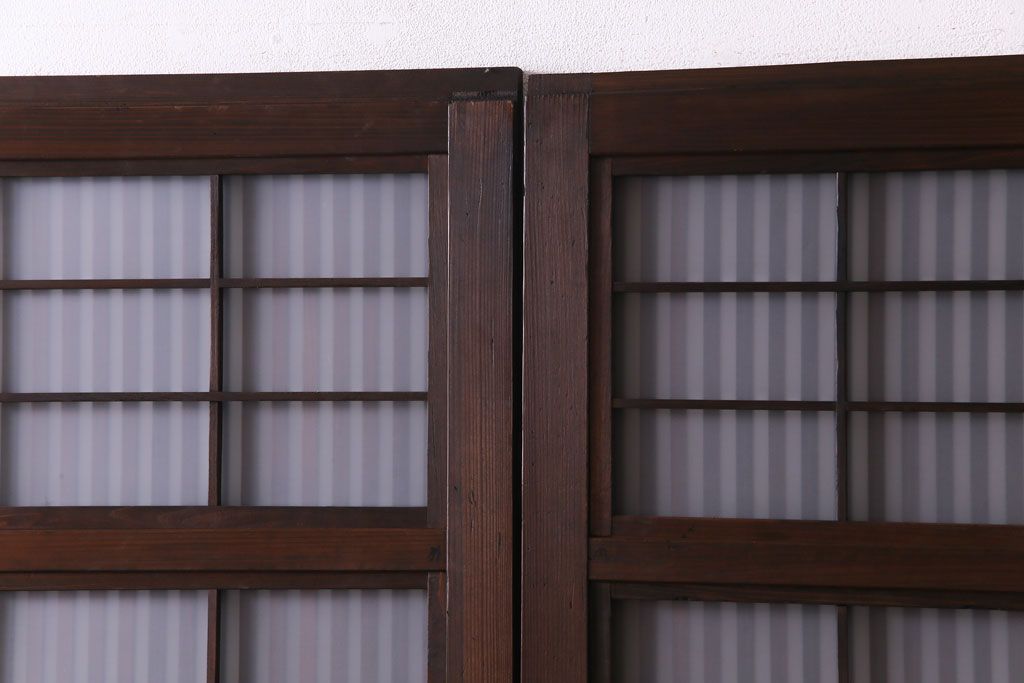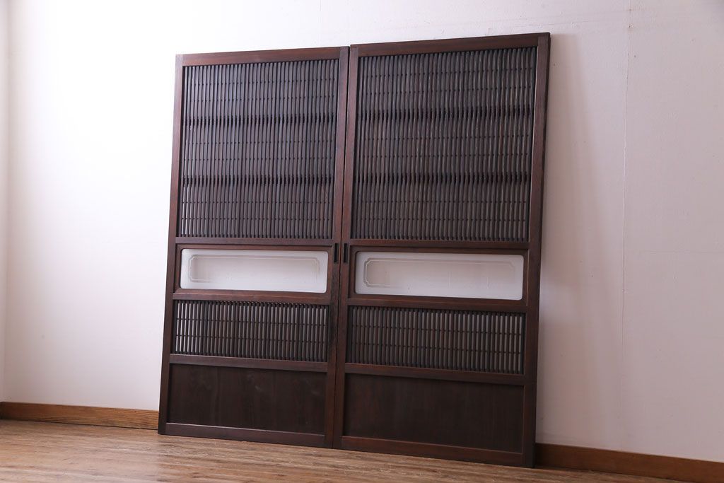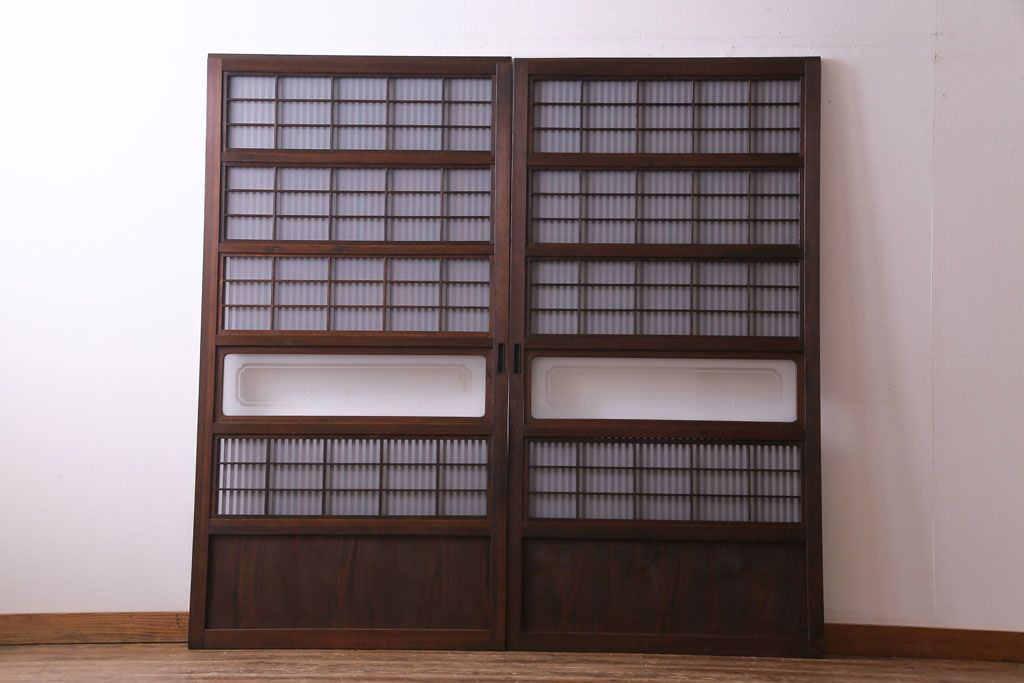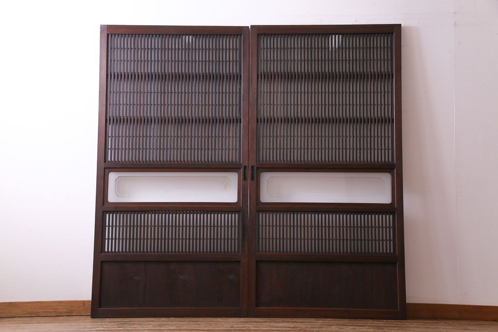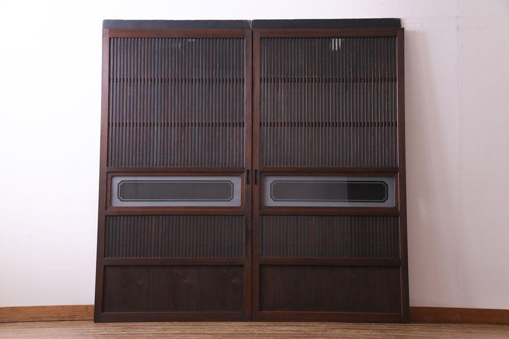和製アンティーク 板ガラス裏障子留め 大正ロマンのお部屋におすすめな格子戸(ガラス帯戸、引き戸、建具)2枚セットです。