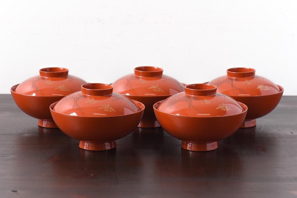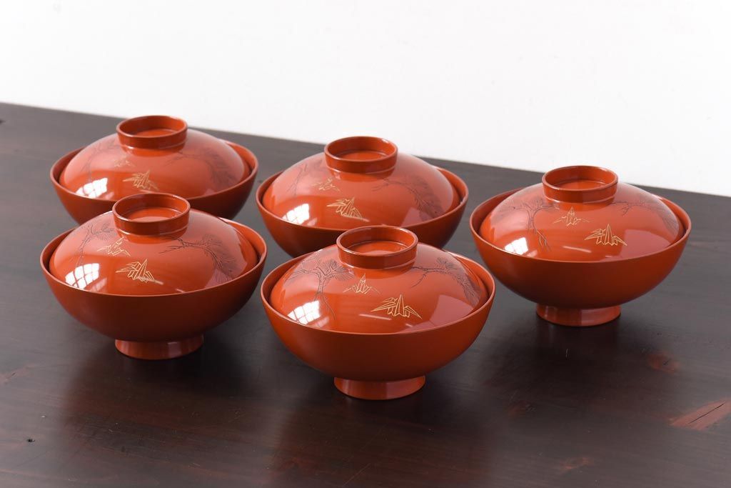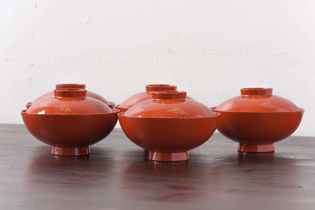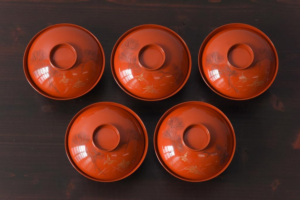ラフジュ工房> 和食器・茶道具> お椀・茶碗 > 和製アンティーク 鶴松亀 朱塗りの木製椀(漆器、和食器)5客セット