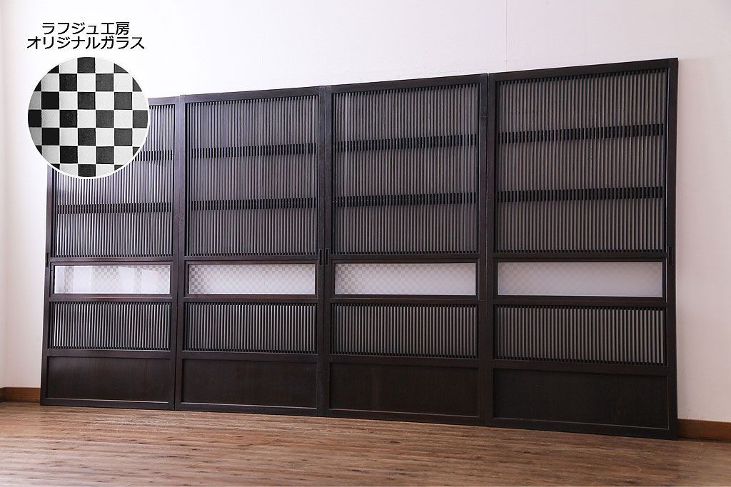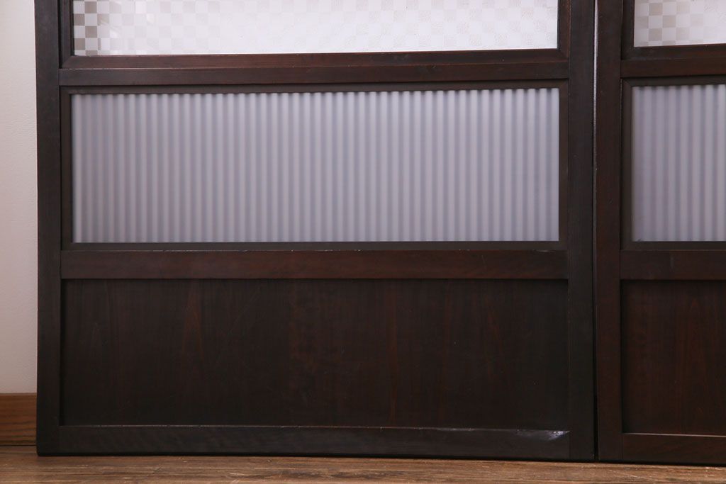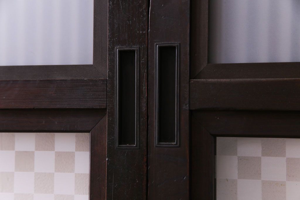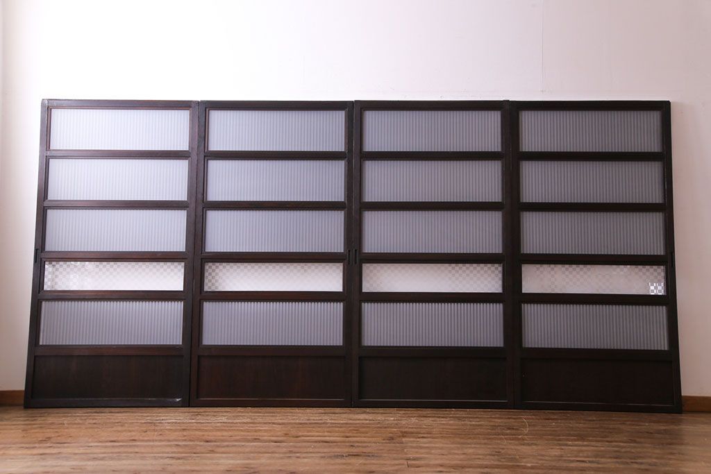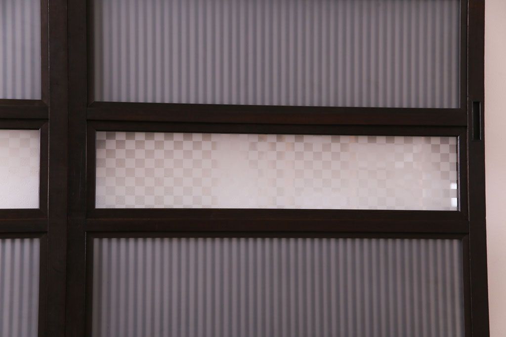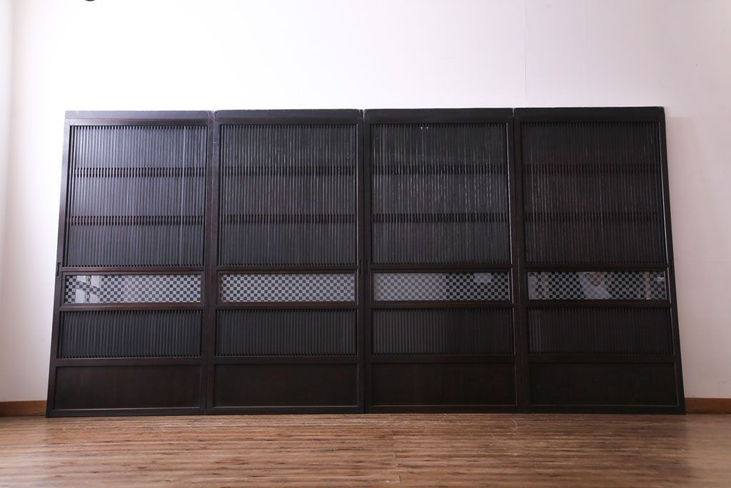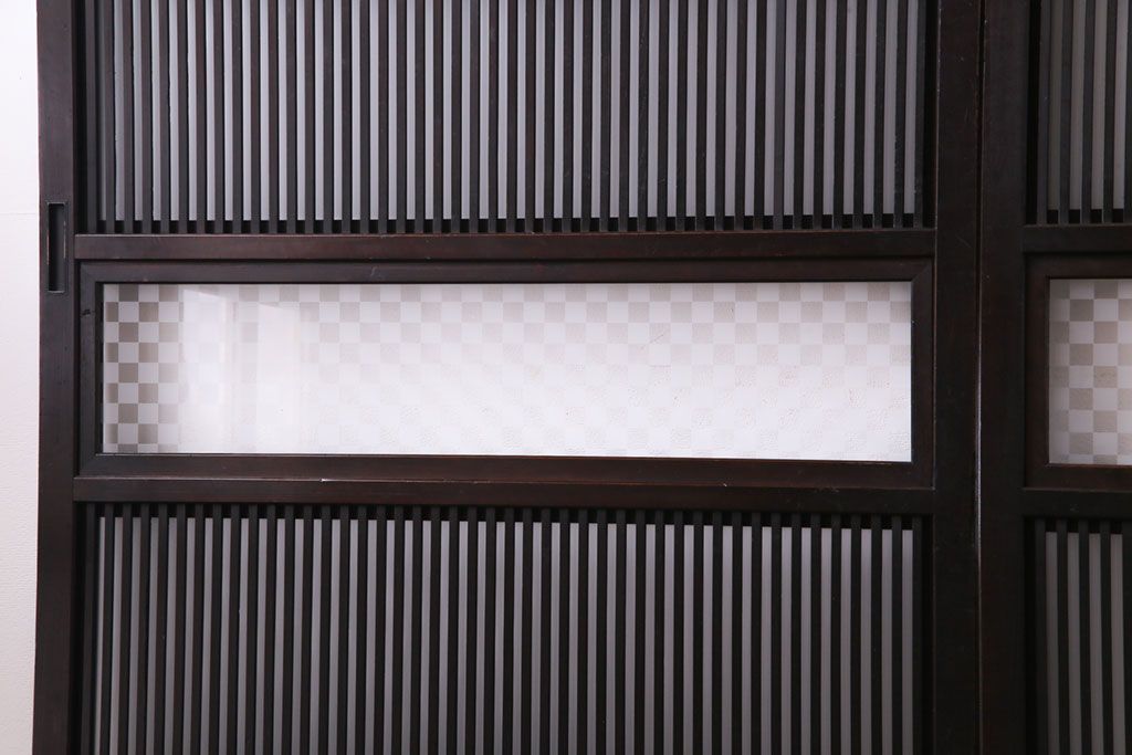 和製アンティーク 倹飩式裏ガラス 市松模様のガラスが目を引くモダンな格子戸(ガラス帯戸、引き戸、ガラス戸)4枚セット