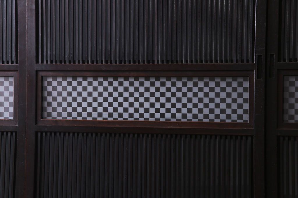 ドア・建具> 4枚〜セット > 和製アンティーク 倹飩式裏ガラス 市松模様のガラスが目を引くモダンな格子戸(ガラス帯戸、引き戸、ガラス戸)4枚セット