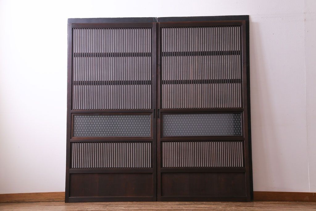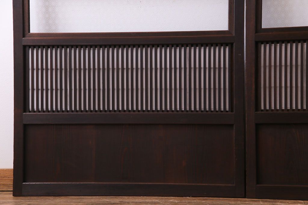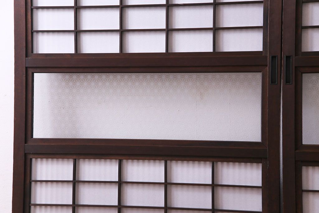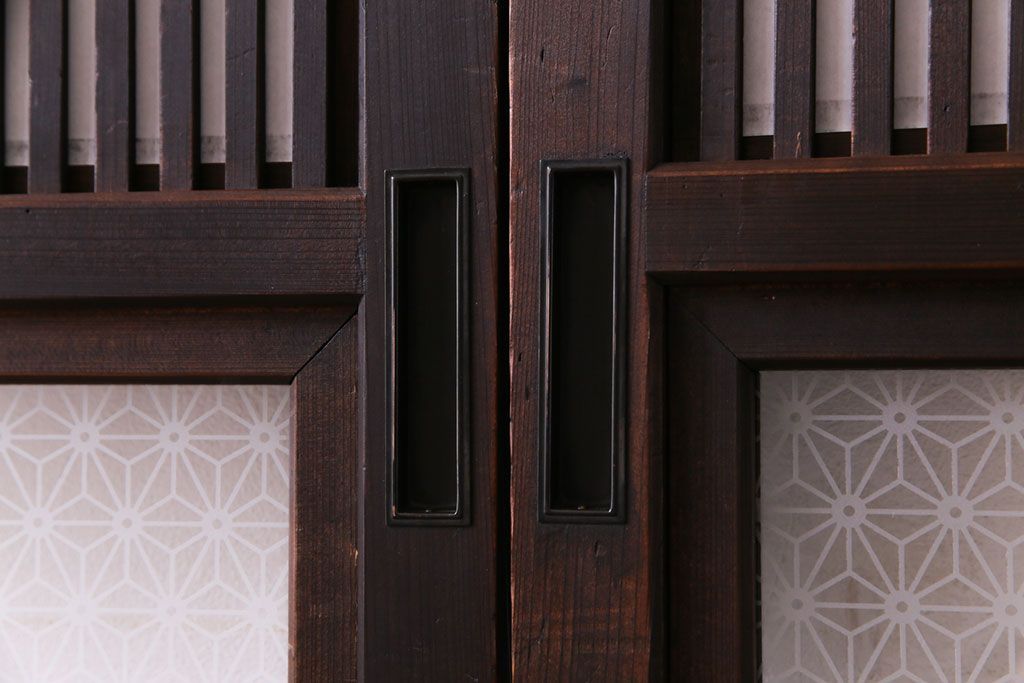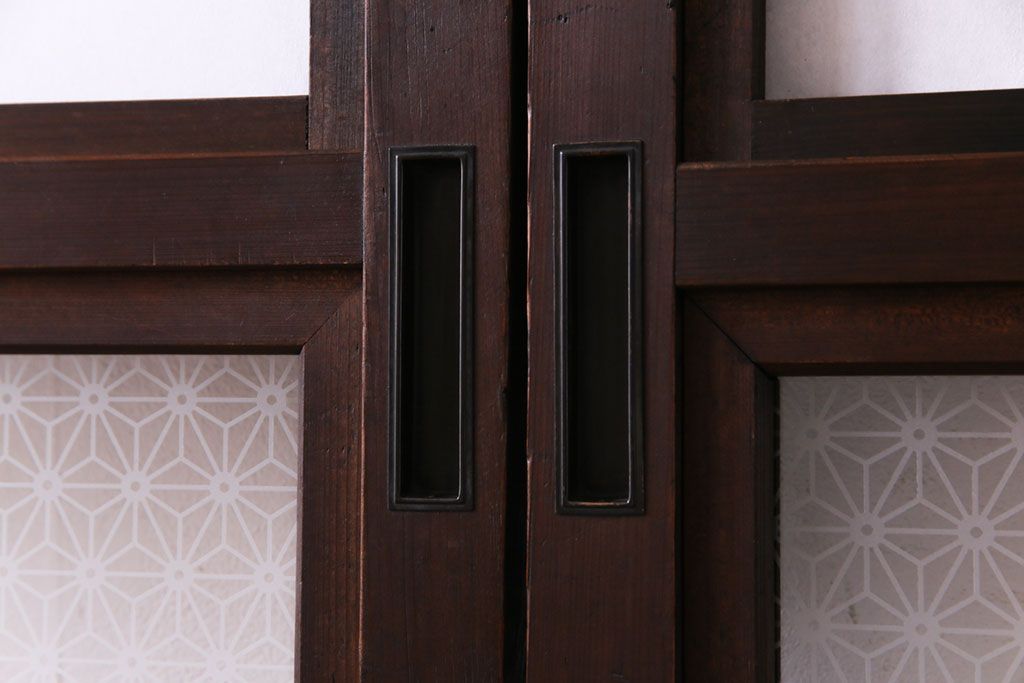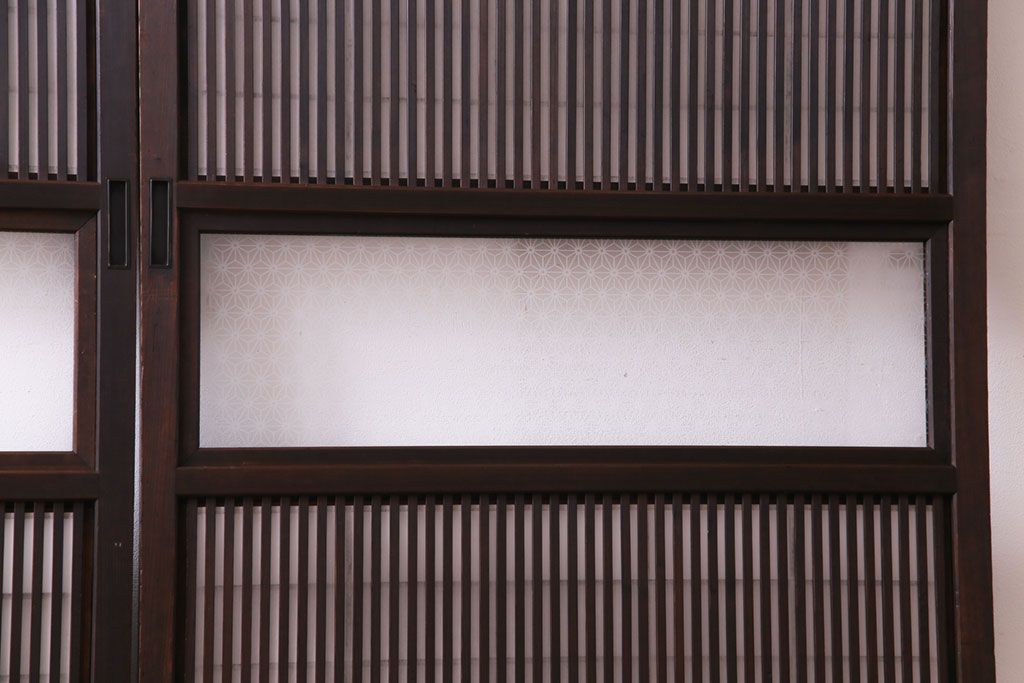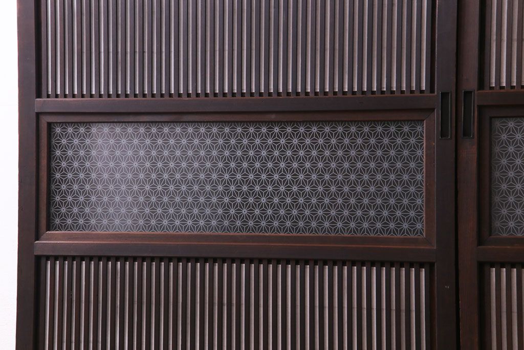 昭和初期 麻の葉ガラス 裏障子付き 和の雰囲気を引き立てる格子戸(ガラス帯戸、引き戸、建具)2枚セット
