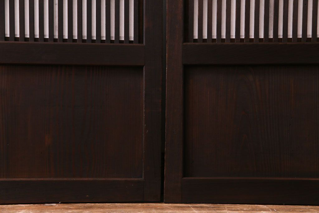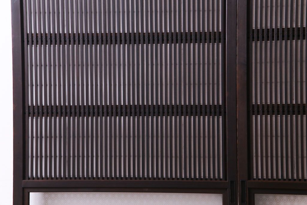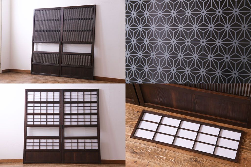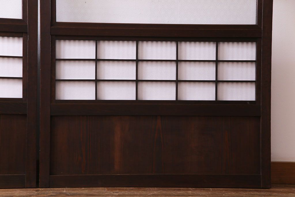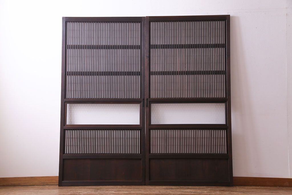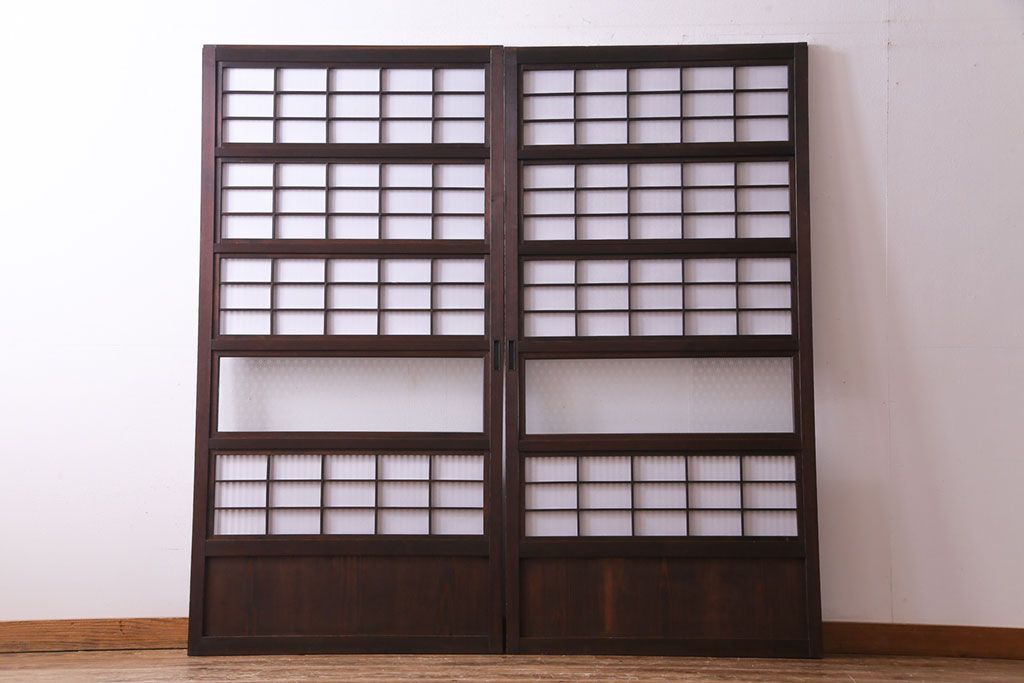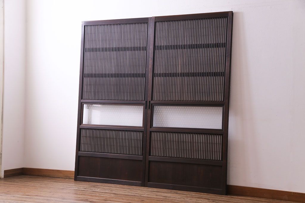 昭和初期 麻の葉ガラス 裏障子付き 和の雰囲気を引き立てる格子戸(ガラス帯戸、引き戸、建具)2枚セット