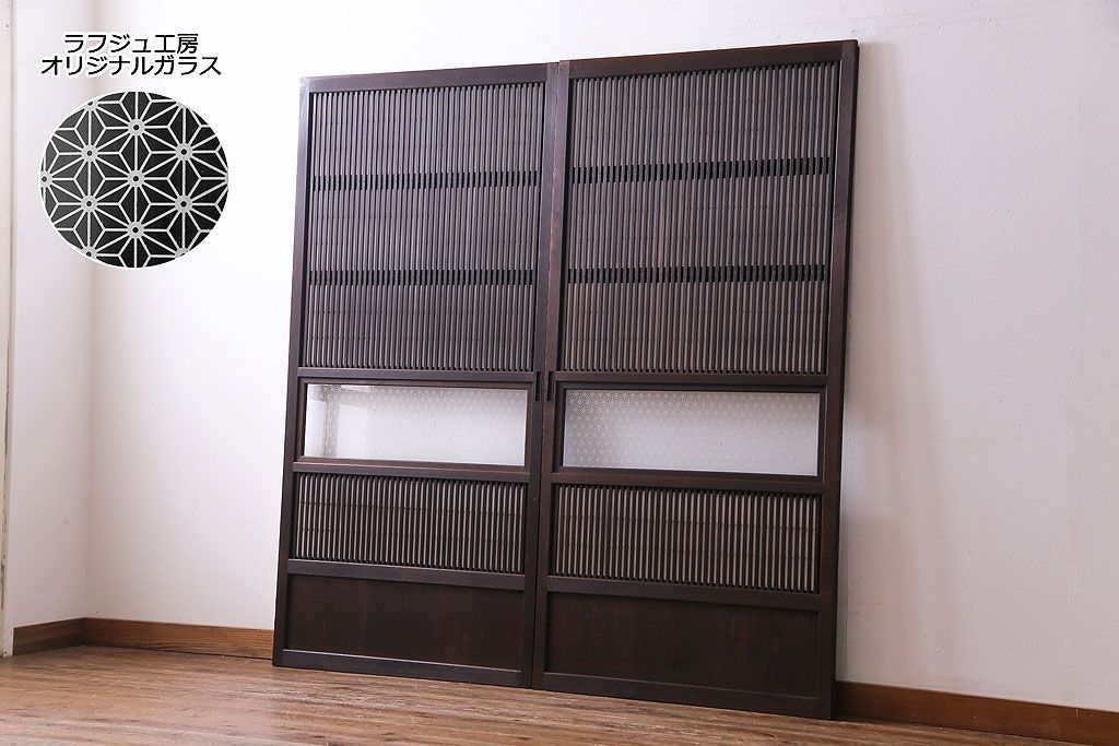昭和初期 麻の葉ガラス 裏障子付き 和の雰囲気を引き立てる格子戸(ガラス帯戸、引き戸、建具)2枚セットです。