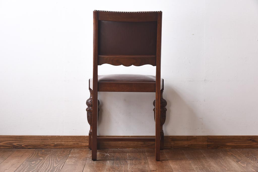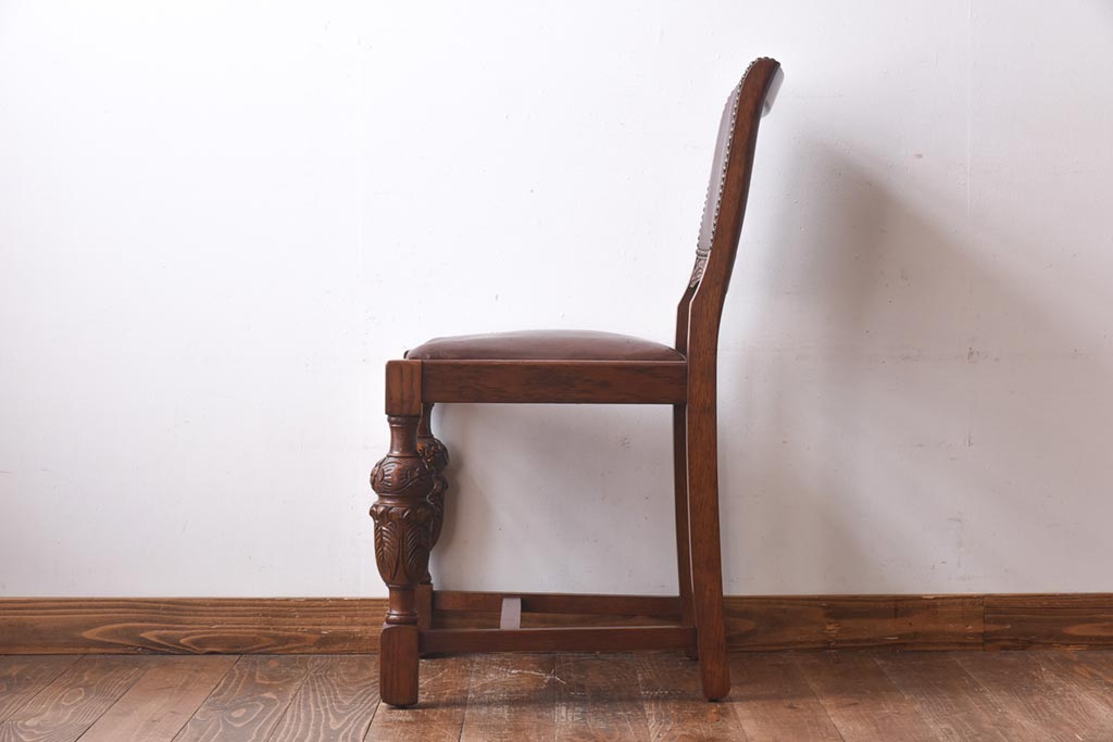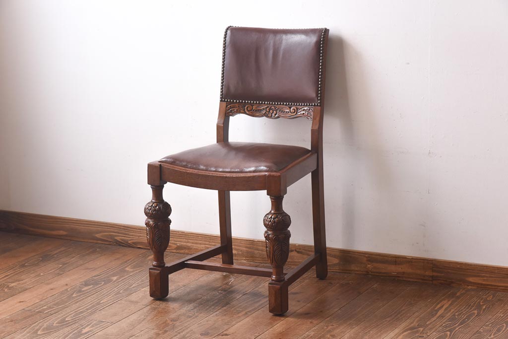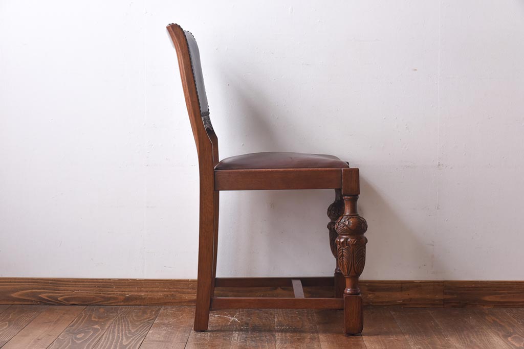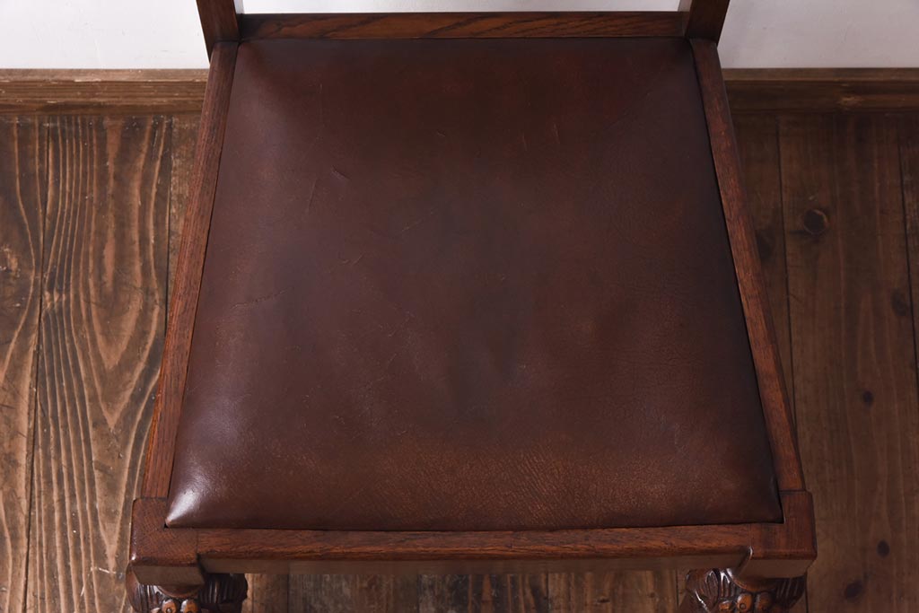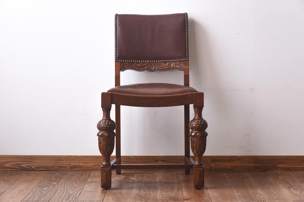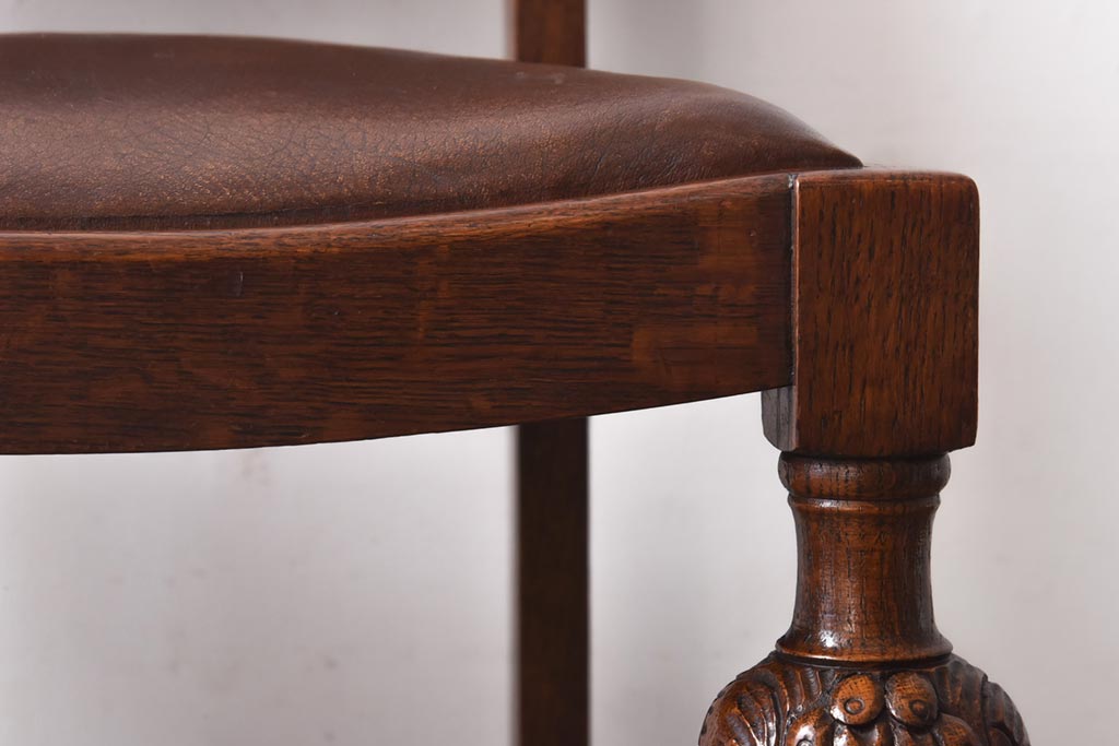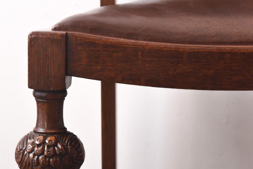 アンティーク家具 イギリスアンティーク オーク材 本革 彫刻の意匠がおしゃれなチェア(ダイニングチェア、椅子)(1)