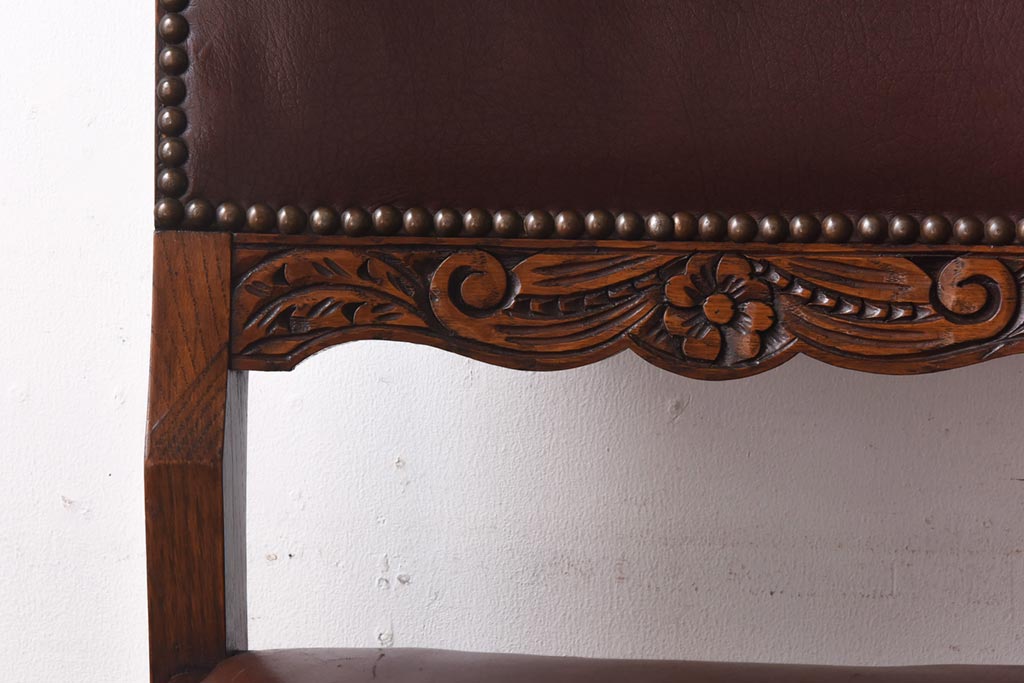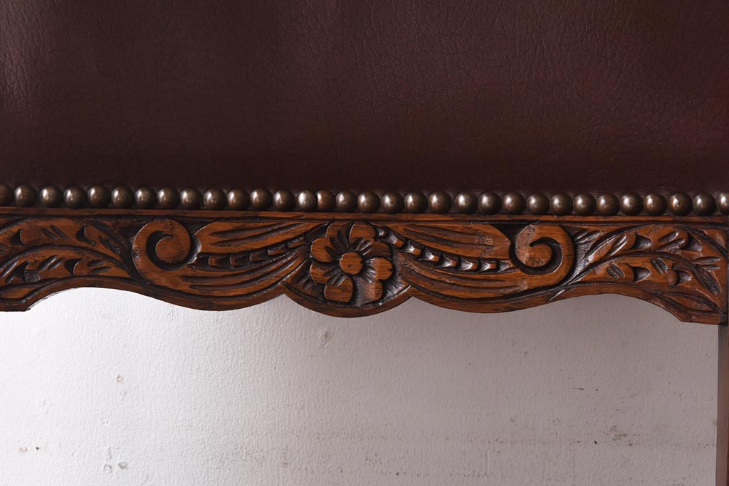 ラフジュ工房> 椅子・ベンチ> ダイニングチェア > アンティーク家具 イギリスアンティーク オーク材 本革 彫刻の意匠がおしゃれなチェア(ダイニングチェア、椅子)(1)