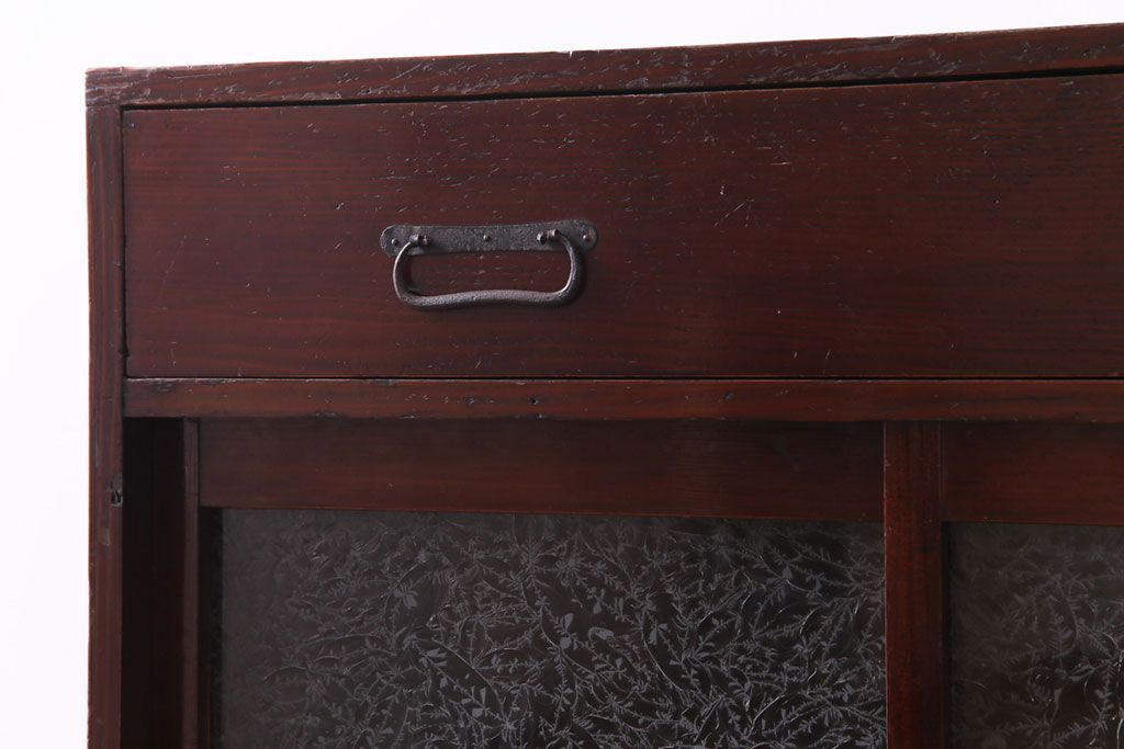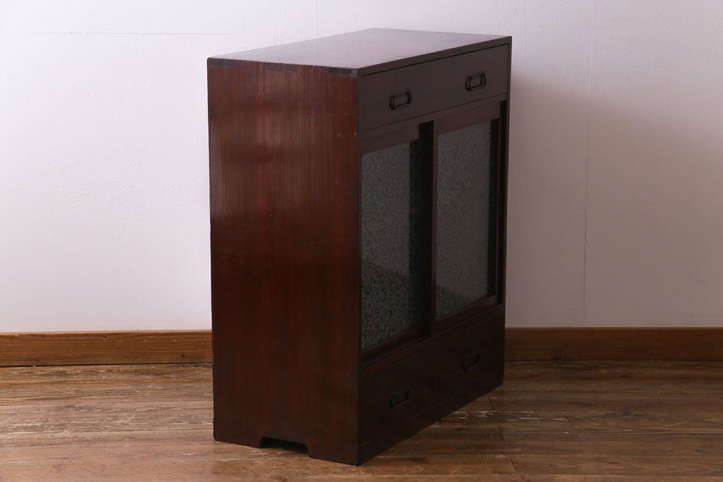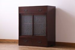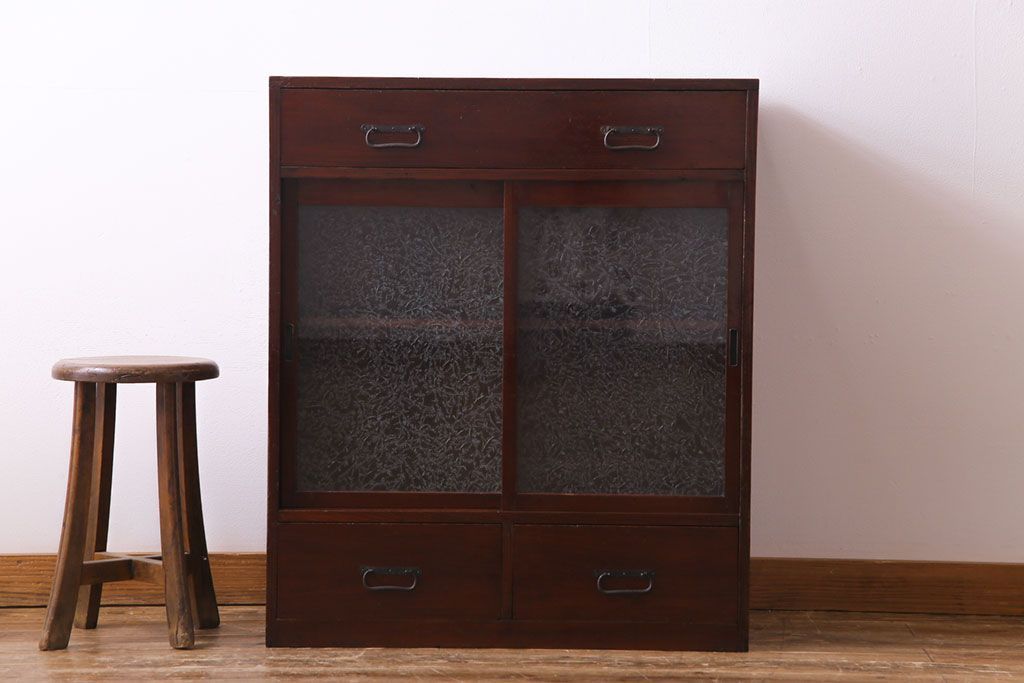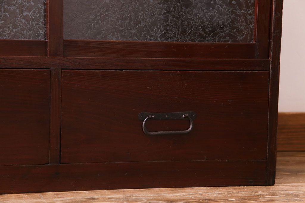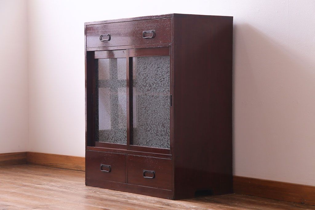 アンティーク家具 和製アンティーク 漆塗り 結霜ガラス 趣きと風情感じる和モダンなガラス戸棚(収納棚、食器棚、キャビネット)