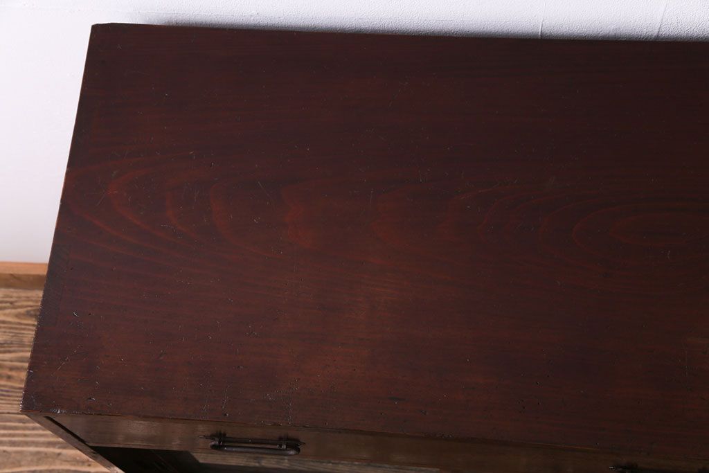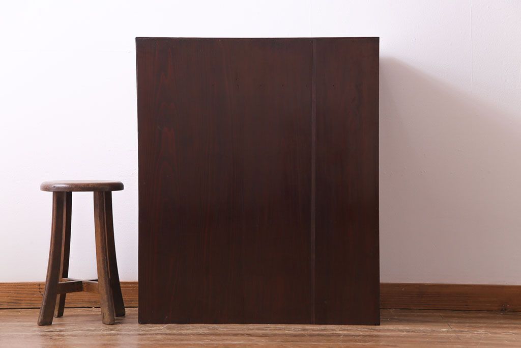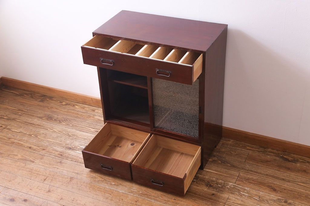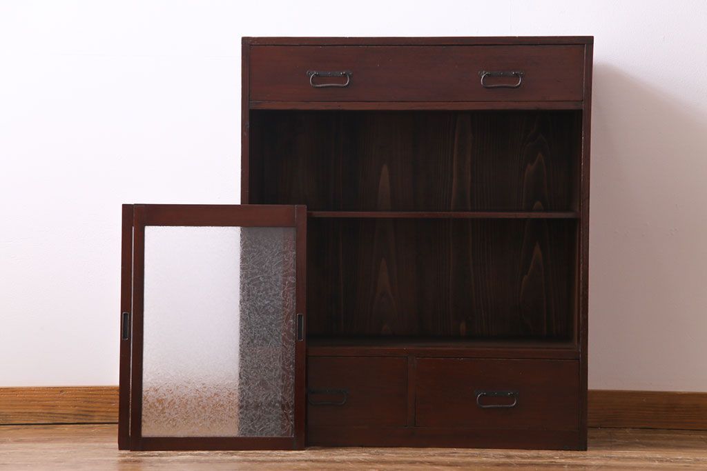 ラフジュ工房> キャビネット・戸棚> 食器棚・カップボード > アンティーク家具 和製アンティーク 漆塗り 結霜ガラス 趣きと風情感じる和モダンなガラス戸棚(収納棚、食器棚、キャビネット)